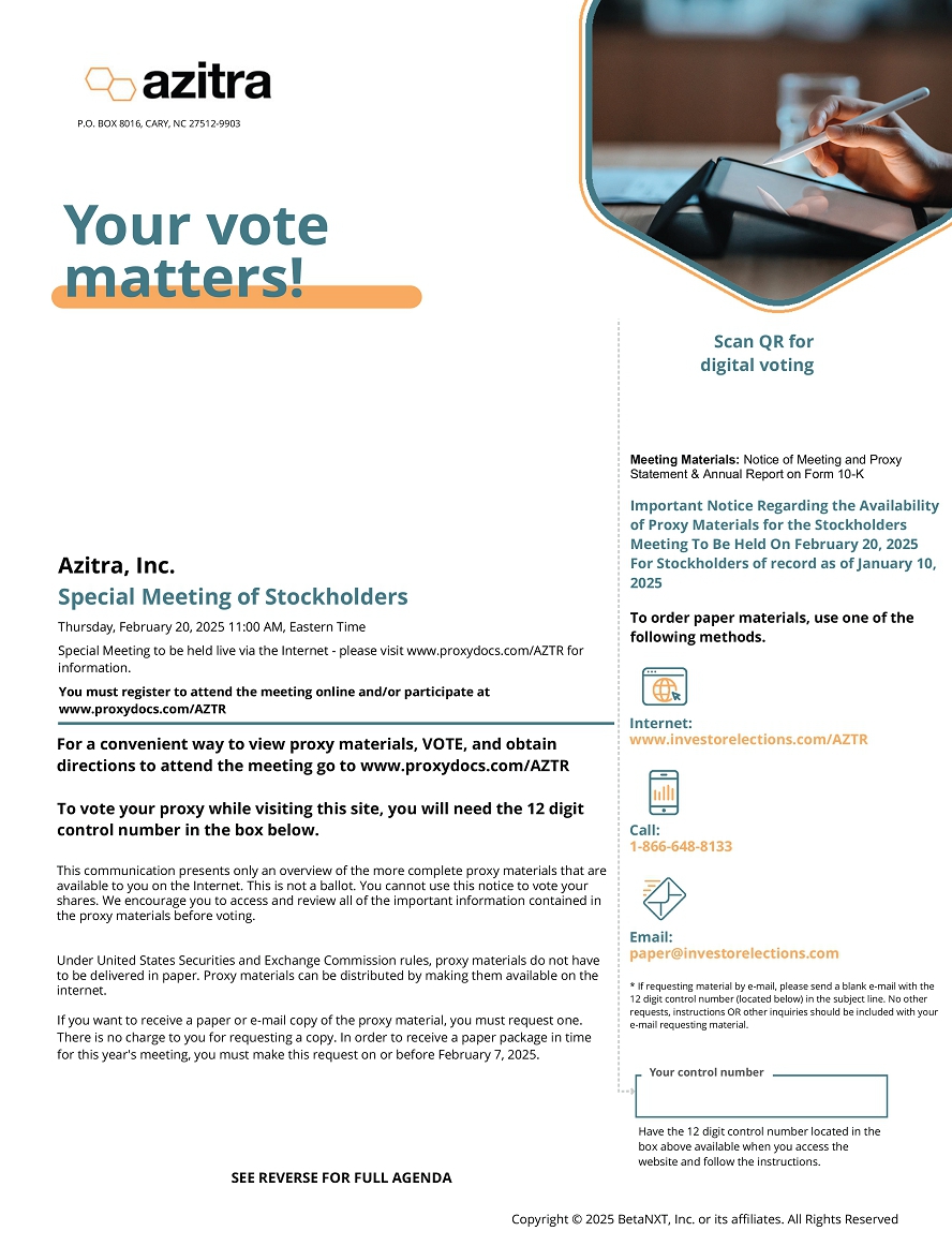 We intend to mail this Proxy Statement, the proxy card and the Notice of Special Meeting on or about January 14, 2025 to all stockholders of record entitled to notice of and to vote at the Special Meeting. If you would like a hard copy of the Notice of Meeting, Proxy Statement and Proxy Card for this Special Meeting, or any future stockholder meetings, mailed or emailed to you, please telephone us at (800) 662-5200 or email us at AZTR.info@investor.sodali.com.