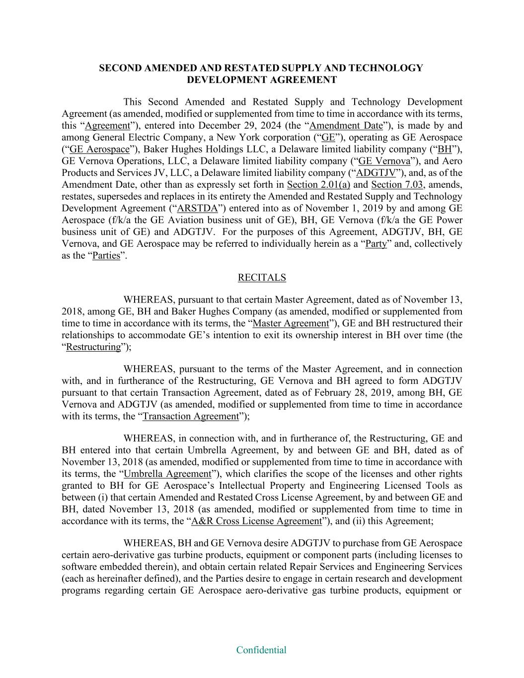Confidential SECOND AMENDED AND RESTATED SUPPLY AND TECHNOLOGY DEVELOPMENT AGREEMENT This Second Amended and Restated Supply and Technology Development Agreement (as amended, modified or supplemented from time to time in accordance with its terms, this “Agreement”), entered into December 29, 2024 (the “Amendment Date”), is made by and among General Electric Company, a New York corporation (“GE”), operating as GE Aerospace (“GE Aerospace”), Baker Hughes Holdings LLC, a Delaware limited liability company (“BH”), GE Vernova Operations, LLC, a Delaware limited liability company (“GE Vernova”), and Aero Products and Services JV, LLC, a Delaware limited liability company (“ADGTJV”), and, as of the Amendment Date, other than as expressly set forth in Section 2.01(a) and Section 7.03, amends, restates, supersedes and replaces in its entirety the Amended and Restated Supply and Technology Development Agreement (“ARSTDA”) entered into as of November 1, 2019 by and among GE Aerospace (f/k/a the GE Aviation business unit of GE), BH, GE Vernova (f/k/a the GE Power business unit of GE) and ADGTJV. For the purposes of this Agreement, ADGTJV, BH, GE Vernova, and GE Aerospace may be referred to individually herein as a “Party” and, collectively as the “Parties”. RECITALS WHEREAS, pursuant to that certain Master Agreement, dated as of November 13, 2018, among GE, BH and Baker Hughes Company (as amended, modified or supplemented from time to time in accordance with its terms, the “Master Agreement”), GE and BH restructured their relationships to accommodate GE’s intention to exit its ownership interest in BH over time (the “Restructuring”); WHEREAS, pursuant to the terms of the Master Agreement, and in connection with, and in furtherance of the Restructuring, GE Vernova and BH agreed to form ADGTJV pursuant to that certain Transaction Agreement, dated as of February 28, 2019, among BH, GE Vernova and ADGTJV (as amended, modified or supplemented from time to time in accordance with its terms, the “Transaction Agreement”); WHEREAS, in connection with, and in furtherance of, the Restructuring, GE and BH entered into that certain Umbrella Agreement, by and between GE and BH, dated as of November 13, 2018 (as amended, modified or supplemented from time to time in accordance with its terms, the “Umbrella Agreement”), which clarifies the scope of the licenses and other rights granted to BH for GE Aerospace’s Intellectual Property and Engineering Licensed Tools as between (i) that certain Amended and Restated Cross License Agreement, by and between GE and BH, dated November 13, 2018 (as amended, modified or supplemented from time to time in accordance with its terms, the “A&R Cross License Agreement”), and (ii) this Agreement; WHEREAS, BH and GE Vernova desire ADGTJV to purchase from GE Aerospace certain aero-derivative gas turbine products, equipment or component parts (including licenses to software embedded therein), and obtain certain related Repair Services and Engineering Services (each as hereinafter defined), and the Parties desire to engage in certain research and development programs regarding certain GE Aerospace aero-derivative gas turbine products, equipment or