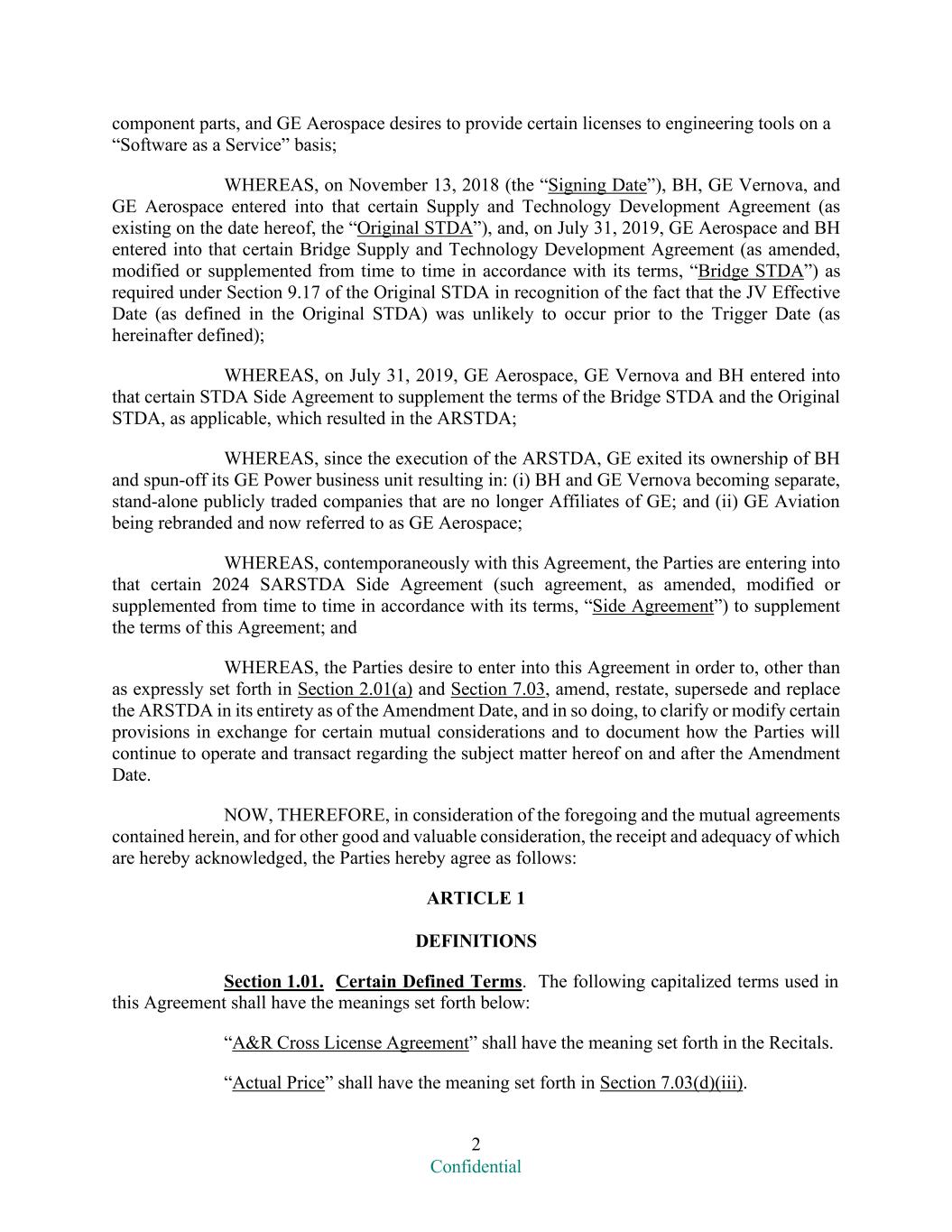 2 Confidential component parts, and GE Aerospace desires to provide certain licenses to engineering tools on a “Software as a Service” basis; WHEREAS, on November 13, 2018 (the “Signing Date”), BH, GE Vernova, and GE Aerospace entered into that certain Supply and Technology Development Agreement (as existing on the date hereof, the “Original STDA”), and, on July 31, 2019, GE Aerospace and BH entered into that certain Bridge Supply and Technology Development Agreement (as amended, modified or supplemented from time to time in accordance with its terms, “Bridge STDA”) as required under Section 9.17 of the Original STDA in recognition of the fact that the JV Effective Date (as defined in the Original STDA) was unlikely to occur prior to the Trigger Date (as hereinafter defined); WHEREAS, on July 31, 2019, GE Aerospace, GE Vernova and BH entered into that certain STDA Side Agreement to supplement the terms of the Bridge STDA and the Original STDA, as applicable, which resulted in the ARSTDA; WHEREAS, since the execution of the ARSTDA, GE exited its ownership of BH and spun-off its GE Power business unit resulting in: (i) BH and GE Vernova becoming separate, stand-alone publicly traded companies that are no longer Affiliates of GE; and (ii) GE Aviation being rebranded and now referred to as GE Aerospace; WHEREAS, contemporaneously with this Agreement, the Parties are entering into that certain 2024 SARSTDA Side Agreement (such agreement, as amended, modified or supplemented from time to time in accordance with its terms, “Side Agreement”) to supplement the terms of this Agreement; and WHEREAS, the Parties desire to enter into this Agreement in order to, other than as expressly set forth in Section 2.01(a) and Section 7.03, amend, restate, supersede and replace the ARSTDA in its entirety as of the Amendment Date, and in so doing, to clarify or modify certain provisions in exchange for certain mutual considerations and to document how the Parties will continue to operate and transact regarding the subject matter hereof on and after the Amendment Date. NOW, THEREFORE, in consideration of the foregoing and the mutual agreements contained herein, and for other good and valuable consideration, the receipt and adequacy of which are hereby acknowledged, the Parties hereby agree as follows: ARTICLE 1 DEFINITIONS Section 1.01. Certain Defined Terms. The following capitalized terms used in this Agreement shall have the meanings set forth below: “A&R Cross License Agreement” shall have the meaning set forth in the Recitals. “Actual Price” shall have the meaning set forth in Section 7.03(d)(iii).