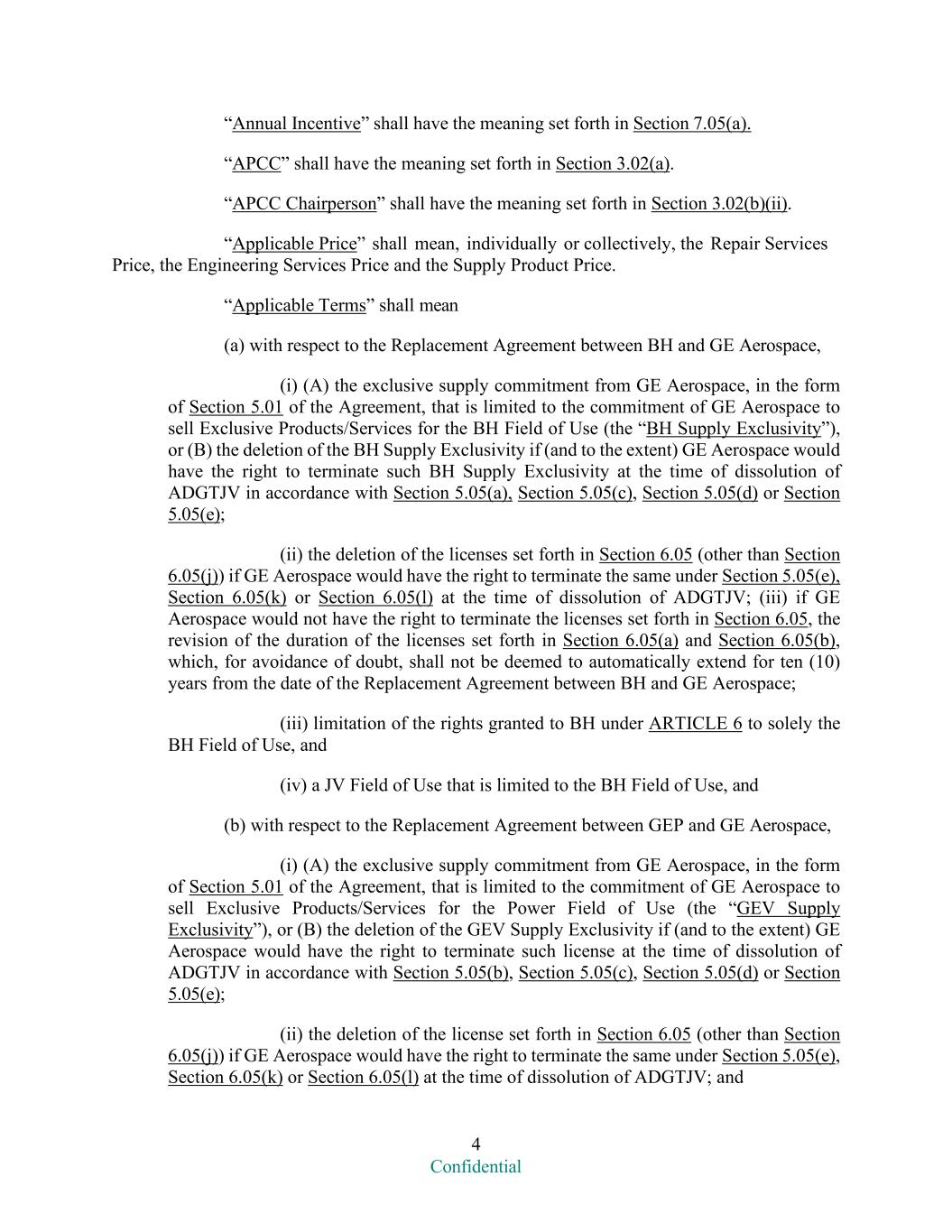 4 Confidential “Annual Incentive” shall have the meaning set forth in Section 7.05(a). “APCC” shall have the meaning set forth in Section 3.02(a). “APCC Chairperson” shall have the meaning set forth in Section 3.02(b)(ii). “Applicable Price” shall mean, individually or collectively, the Repair Services Price, the Engineering Services Price and the Supply Product Price. “Applicable Terms” shall mean (a) with respect to the Replacement Agreement between BH and GE Aerospace, (i) (A) the exclusive supply commitment from GE Aerospace, in the form of Section 5.01 of the Agreement, that is limited to the commitment of GE Aerospace to sell Exclusive Products/Services for the BH Field of Use (the “BH Supply Exclusivity”), or (B) the deletion of the BH Supply Exclusivity if (and to the extent) GE Aerospace would have the right to terminate such BH Supply Exclusivity at the time of dissolution of ADGTJV in accordance with Section 5.05(a), Section 5.05(c), Section 5.05(d) or Section 5.05(e); (ii) the deletion of the licenses set forth in Section 6.05 (other than Section 6.05(j)) if GE Aerospace would have the right to terminate the same under Section 5.05(e), Section 6.05(k) or Section 6.05(l) at the time of dissolution of ADGTJV; (iii) if GE Aerospace would not have the right to terminate the licenses set forth in Section 6.05, the revision of the duration of the licenses set forth in Section 6.05(a) and Section 6.05(b), which, for avoidance of doubt, shall not be deemed to automatically extend for ten (10) years from the date of the Replacement Agreement between BH and GE Aerospace; (iii) limitation of the rights granted to BH under ARTICLE 6 to solely the BH Field of Use, and (iv) a JV Field of Use that is limited to the BH Field of Use, and (b) with respect to the Replacement Agreement between GEP and GE Aerospace, (i) (A) the exclusive supply commitment from GE Aerospace, in the form of Section 5.01 of the Agreement, that is limited to the commitment of GE Aerospace to sell Exclusive Products/Services for the Power Field of Use (the “GEV Supply Exclusivity”), or (B) the deletion of the GEV Supply Exclusivity if (and to the extent) GE Aerospace would have the right to terminate such license at the time of dissolution of ADGTJV in accordance with Section 5.05(b), Section 5.05(c), Section 5.05(d) or Section 5.05(e); (ii) the deletion of the license set forth in Section 6.05 (other than Section 6.05(j)) if GE Aerospace would have the right to terminate the same under Section 5.05(e), Section 6.05(k) or Section 6.05(l) at the time of dissolution of ADGTJV; and