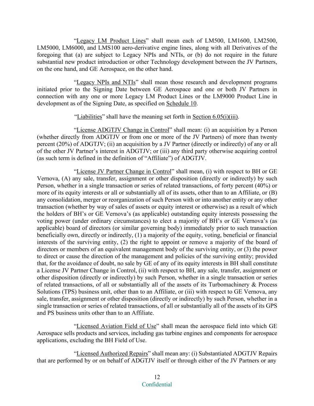 12 Confidential “Legacy LM Product Lines” shall mean each of LM500, LM1600, LM2500, LM5000, LM6000, and LMS100 aero-derivative engine lines, along with all Derivatives of the foregoing that (a) are subject to Legacy NPIs and NTIs, or (b) do not require in the future substantial new product introduction or other Technology development between the JV Partners, on the one hand, and GE Aerospace, on the other hand. “Legacy NPIs and NTIs” shall mean those research and development programs initiated prior to the Signing Date between GE Aerospace and one or both JV Partners in connection with any one or more Legacy LM Product Lines or the LM9000 Product Line in development as of the Signing Date, as specified on Schedule 10. “Liabilities” shall have the meaning set forth in Section 6.05(i)(iii). “License ADGTJV Change in Control” shall mean: (i) an acquisition by a Person (whether directly from ADGTJV or from one or more of the JV Partners) of more than twenty percent (20%) of ADGTJV; (ii) an acquisition by a JV Partner (directly or indirectly) of any or all of the other JV Partner’s interest in ADGTJV; or (iii) any third party otherwise acquiring control (as such term is defined in the definition of “Affiliate”) of ADGTJV. “License JV Partner Change in Control” shall mean, (i) with respect to BH or GE Vernova, (A) any sale, transfer, assignment or other disposition (directly or indirectly) by such Person, whether in a single transaction or series of related transactions, of forty percent (40%) or more of its equity interests or all or substantially all of its assets, other than to an Affiliate, or (B) any consolidation, merger or reorganization of such Person with or into another entity or any other transaction (whether by way of sales of assets or equity interest or otherwise) as a result of which the holders of BH’s or GE Vernova’s (as applicable) outstanding equity interests possessing the voting power (under ordinary circumstances) to elect a majority of BH’s or GE Vernova’s (as applicable) board of directors (or similar governing body) immediately prior to such transaction beneficially own, directly or indirectly, (1) a majority of the equity, voting, beneficial or financial interests of the surviving entity, (2) the right to appoint or remove a majority of the board of directors or members of an equivalent management body of the surviving entity, or (3) the power to direct or cause the direction of the management and policies of the surviving entity; provided that, for the avoidance of doubt, no sale by GE of any of its equity interests in BH shall constitute a License JV Partner Change in Control, (ii) with respect to BH, any sale, transfer, assignment or other disposition (directly or indirectly) by such Person, whether in a single transaction or series of related transactions, of all or substantially all of the assets of its Turbomachinery & Process Solutions (TPS) business unit, other than to an Affiliate, or (iii) with respect to GE Vernova, any sale, transfer, assignment or other disposition (directly or indirectly) by such Person, whether in a single transaction or series of related transactions, of all or substantially all of the assets of its GPS and PS business units other than to an Affiliate. “Licensed Aviation Field of Use” shall mean the aerospace field into which GE Aerospace sells products and services, including gas turbine engines and components for aerospace applications, excluding the BH Field of Use. “Licensed Authorized Repairs” shall mean any: (i) Substantiated ADGTJV Repairs that are performed by or on behalf of ADGTJV itself or through either of the JV Partners or any