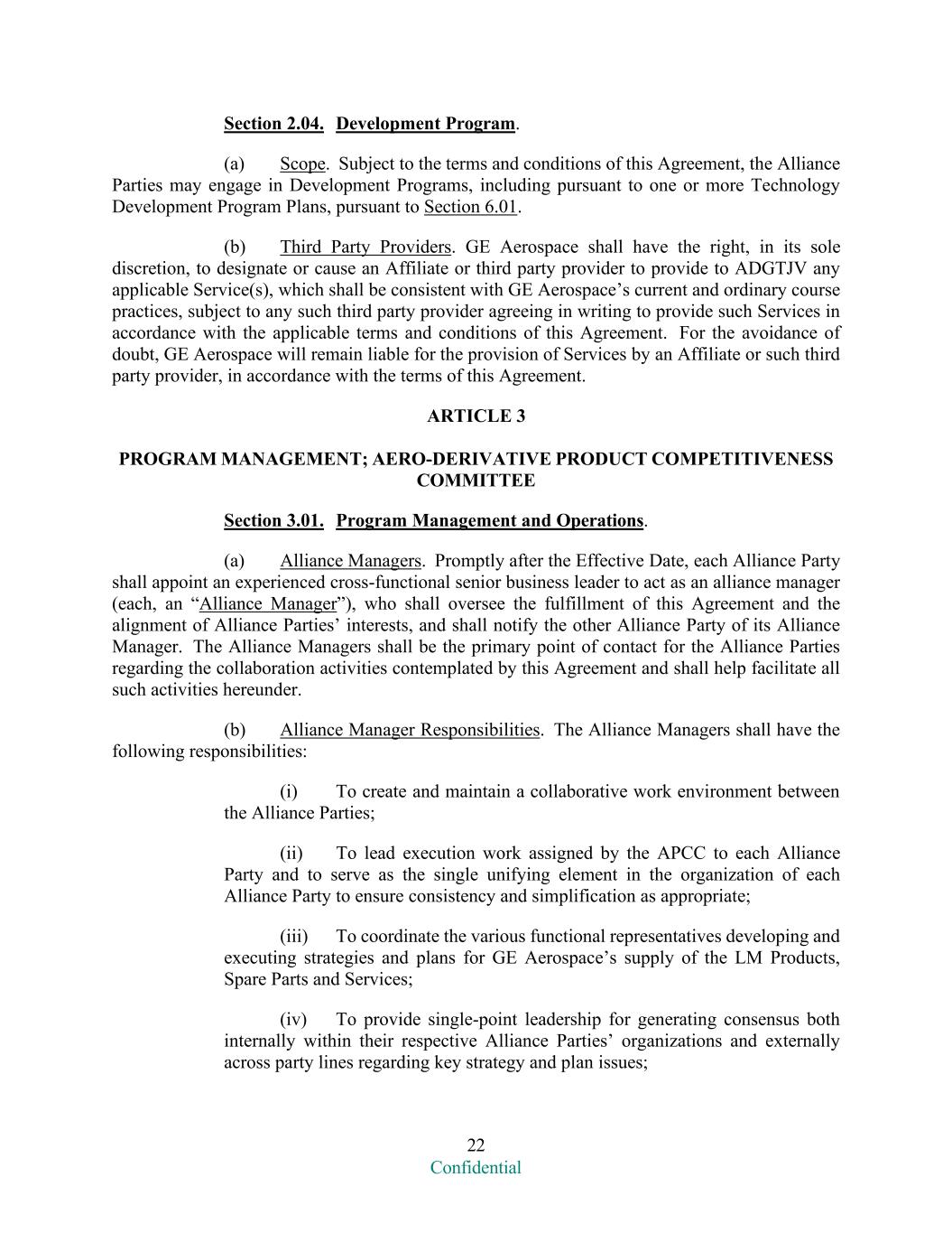 22 Confidential Section 2.04. Development Program. (a) Scope. Subject to the terms and conditions of this Agreement, the Alliance Parties may engage in Development Programs, including pursuant to one or more Technology Development Program Plans, pursuant to Section 6.01. (b) Third Party Providers. GE Aerospace shall have the right, in its sole discretion, to designate or cause an Affiliate or third party provider to provide to ADGTJV any applicable Service(s), which shall be consistent with GE Aerospace’s current and ordinary course practices, subject to any such third party provider agreeing in writing to provide such Services in accordance with the applicable terms and conditions of this Agreement. For the avoidance of doubt, GE Aerospace will remain liable for the provision of Services by an Affiliate or such third party provider, in accordance with the terms of this Agreement. ARTICLE 3 PROGRAM MANAGEMENT; AERO-DERIVATIVE PRODUCT COMPETITIVENESS COMMITTEE Section 3.01. Program Management and Operations. (a) Alliance Managers. Promptly after the Effective Date, each Alliance Party shall appoint an experienced cross-functional senior business leader to act as an alliance manager (each, an “Alliance Manager”), who shall oversee the fulfillment of this Agreement and the alignment of Alliance Parties’ interests, and shall notify the other Alliance Party of its Alliance Manager. The Alliance Managers shall be the primary point of contact for the Alliance Parties regarding the collaboration activities contemplated by this Agreement and shall help facilitate all such activities hereunder. (b) Alliance Manager Responsibilities. The Alliance Managers shall have the following responsibilities: (i) To create and maintain a collaborative work environment between the Alliance Parties; (ii) To lead execution work assigned by the APCC to each Alliance Party and to serve as the single unifying element in the organization of each Alliance Party to ensure consistency and simplification as appropriate; (iii) To coordinate the various functional representatives developing and executing strategies and plans for GE Aerospace’s supply of the LM Products, Spare Parts and Services; (iv) To provide single-point leadership for generating consensus both internally within their respective Alliance Parties’ organizations and externally across party lines regarding key strategy and plan issues;