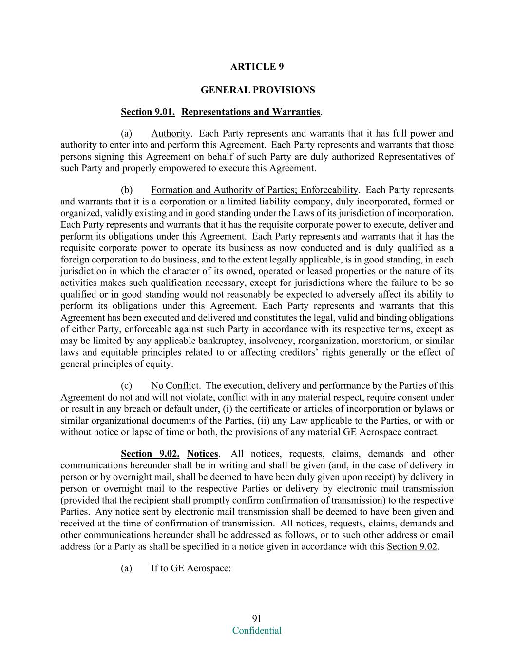 91 Confidential ARTICLE 9 GENERAL PROVISIONS Section 9.01. Representations and Warranties. (a) Authority. Each Party represents and warrants that it has full power and authority to enter into and perform this Agreement. Each Party represents and warrants that those persons signing this Agreement on behalf of such Party are duly authorized Representatives of such Party and properly empowered to execute this Agreement. (b) Formation and Authority of Parties; Enforceability. Each Party represents and warrants that it is a corporation or a limited liability company, duly incorporated, formed or organized, validly existing and in good standing under the Laws of its jurisdiction of incorporation. Each Party represents and warrants that it has the requisite corporate power to execute, deliver and perform its obligations under this Agreement. Each Party represents and warrants that it has the requisite corporate power to operate its business as now conducted and is duly qualified as a foreign corporation to do business, and to the extent legally applicable, is in good standing, in each jurisdiction in which the character of its owned, operated or leased properties or the nature of its activities makes such qualification necessary, except for jurisdictions where the failure to be so qualified or in good standing would not reasonably be expected to adversely affect its ability to perform its obligations under this Agreement. Each Party represents and warrants that this Agreement has been executed and delivered and constitutes the legal, valid and binding obligations of either Party, enforceable against such Party in accordance with its respective terms, except as may be limited by any applicable bankruptcy, insolvency, reorganization, moratorium, or similar laws and equitable principles related to or affecting creditors’ rights generally or the effect of general principles of equity. (c) No Conflict. The execution, delivery and performance by the Parties of this Agreement do not and will not violate, conflict with in any material respect, require consent under or result in any breach or default under, (i) the certificate or articles of incorporation or bylaws or similar organizational documents of the Parties, (ii) any Law applicable to the Parties, or with or without notice or lapse of time or both, the provisions of any material GE Aerospace contract. Section 9.02. Notices. All notices, requests, claims, demands and other communications hereunder shall be in writing and shall be given (and, in the case of delivery in person or by overnight mail, shall be deemed to have been duly given upon receipt) by delivery in person or overnight mail to the respective Parties or delivery by electronic mail transmission (provided that the recipient shall promptly confirm confirmation of transmission) to the respective Parties. Any notice sent by electronic mail transmission shall be deemed to have been given and received at the time of confirmation of transmission. All notices, requests, claims, demands and other communications hereunder shall be addressed as follows, or to such other address or email address for a Party as shall be specified in a notice given in accordance with this Section 9.02. (a) If to GE Aerospace: