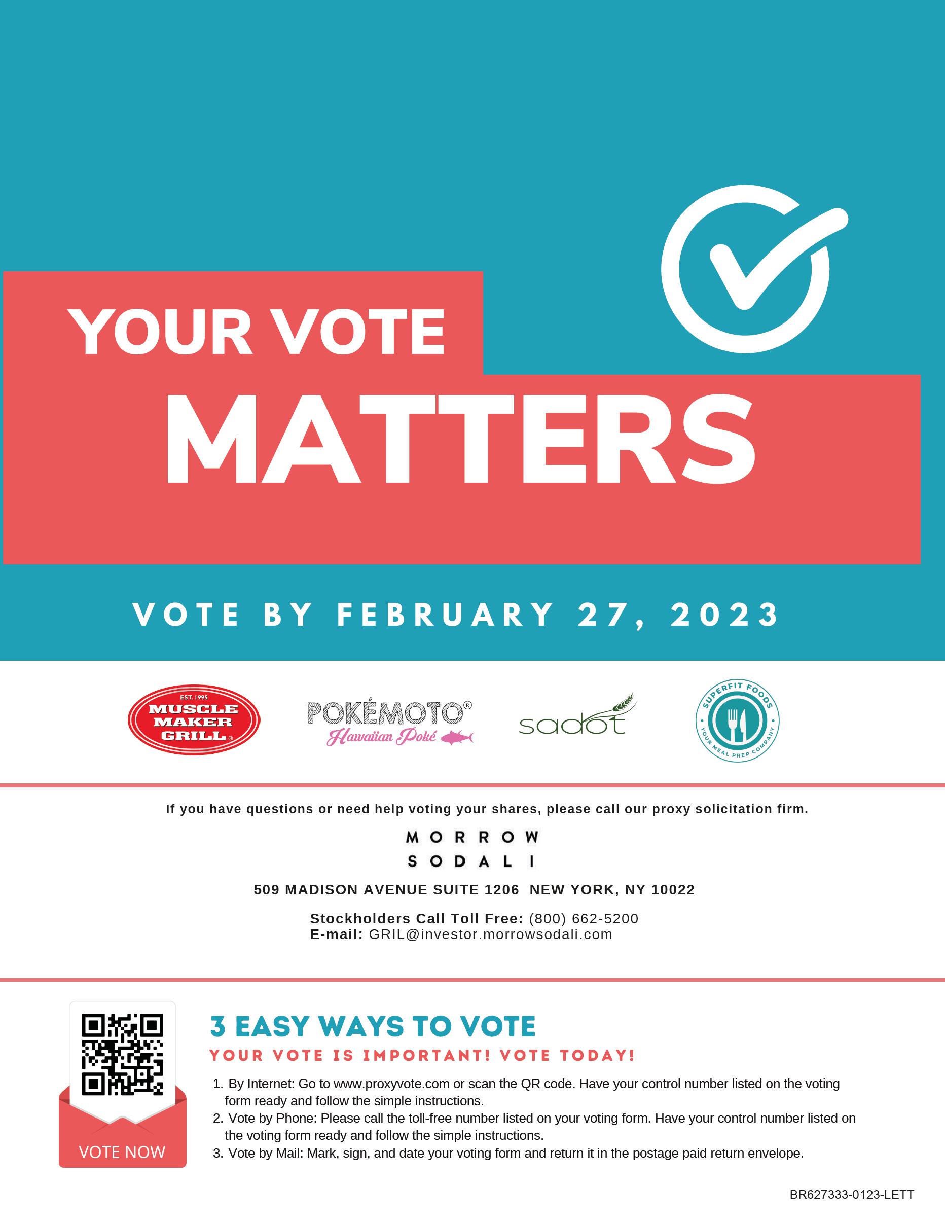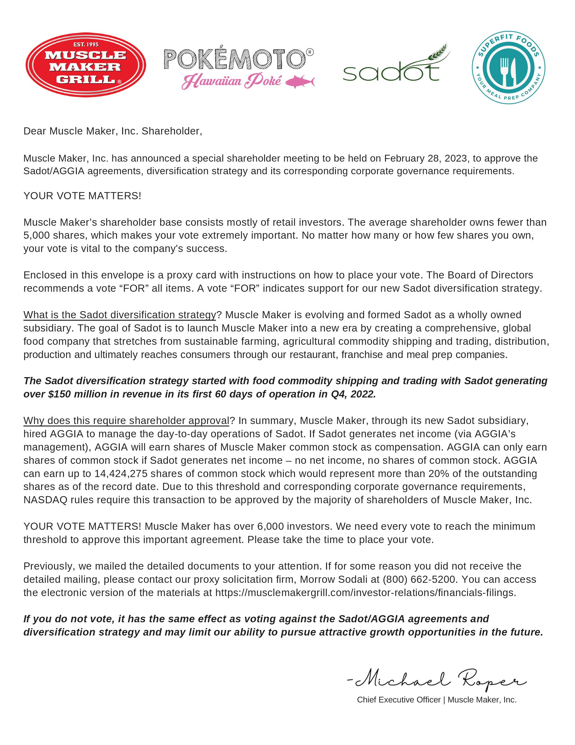 Commencing on or about January 31, 2023, Muscle Maker, Inc. will mail the below letter to stockholders.