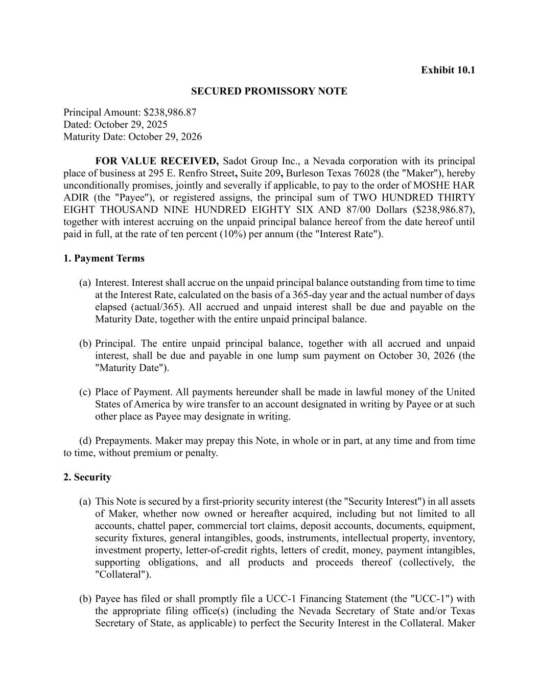Exhibit 10.1 SECURED PROMISSORY NOTE Principal Amount: $238,986.87 Dated: October 29, 2025 Maturity Date: October 29, 2026 FOR VALUE RECEIVED, Sadot Group Inc., a Nevada corporation with its principal place of business at 295 E. Renfro Street, Suite 209, Burleson Texas 76028 (the "Maker"), hereby unconditionally promises, jointly and severally if applicable, to pay to the order of MOSHE HAR ADIR (the "Payee"), or registered assigns, the principal sum of TWO HUNDRED THIRTY EIGHT THOUSAND NINE HUNDRED EIGHTY SIX AND 87/00 Dollars ($238,986.87), together with interest accruing on the unpaid principal balance hereof from the date hereof until paid in full, at the rate of ten percent (10%) per annum (the "Interest Rate"). 1. Payment Terms (a) Interest. Interest shall accrue on the unpaid principal balance outstanding from time to time at the Interest Rate, calculated on the basis of a 365-day year and the actual number of days elapsed (actual/365). All accrued and unpaid interest shall be due and payable on the Maturity Date, together with the entire unpaid principal balance. (b) Principal. The entire unpaid principal balance, together with all accrued and unpaid interest, shall be due and payable in one lump sum payment on October 30, 2026 (the "Maturity Date"). (c) Place of Payment. All payments hereunder shall be made in lawful money of the United States of America by wire transfer to an account designated in writing by Payee or at such other place as Payee may designate in writing. (d) Prepayments. Maker may prepay this Note, in whole or in part, at any time and from time to time, without premium or penalty. 2. Security (a) This Note is secured by a first-priority security interest (the "Security Interest") in all assets of Maker, whether now owned or hereafter acquired, including but not limited to all accounts, chattel paper, commercial tort claims, deposit accounts, documents, equipment, security fixtures, general intangibles, goods, instruments, intellectual property, inventory, investment property, letter-of-credit rights, letters of credit, money, payment intangibles, supporting obligations, and all products and proceeds thereof (collectively, the "Collateral"). (b) Payee has filed or shall promptly file a UCC-1 Financing Statement (the "UCC-1") with the appropriate filing office(s) (including the Nevada Secretary of State and/or Texas Secretary of State, as applicable) to perfect the Security Interest in the Collateral. Maker