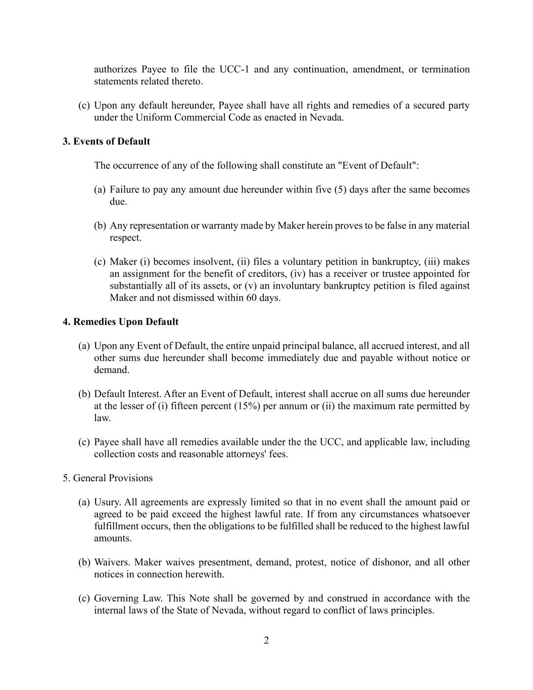2 authorizes Payee to file the UCC-1 and any continuation, amendment, or termination statements related thereto. (c) Upon any default hereunder, Payee shall have all rights and remedies of a secured party under the Uniform Commercial Code as enacted in Nevada. 3. Events of Default The occurrence of any of the following shall constitute an "Event of Default": (a) Failure to pay any amount due hereunder within five (5) days after the same becomes due. (b) Any representation or warranty made by Maker herein proves to be false in any material respect. (c) Maker (i) becomes insolvent, (ii) files a voluntary petition in bankruptcy, (iii) makes an assignment for the benefit of creditors, (iv) has a receiver or trustee appointed for substantially all of its assets, or (v) an involuntary bankruptcy petition is filed against Maker and not dismissed within 60 days. 4. Remedies Upon Default (a) Upon any Event of Default, the entire unpaid principal balance, all accrued interest, and all other sums due hereunder shall become immediately due and payable without notice or demand. (b) Default Interest. After an Event of Default, interest shall accrue on all sums due hereunder at the lesser of (i) fifteen percent (15%) per annum or (ii) the maximum rate permitted by law. (c) Payee shall have all remedies available under the the UCC, and applicable law, including collection costs and reasonable attorneys' fees. 5. General Provisions (a) Usury. All agreements are expressly limited so that in no event shall the amount paid or agreed to be paid exceed the highest lawful rate. If from any circumstances whatsoever fulfillment occurs, then the obligations to be fulfilled shall be reduced to the highest lawful amounts. (b) Waivers. Maker waives presentment, demand, protest, notice of dishonor, and all other notices in connection herewith. (c) Governing Law. This Note shall be governed by and construed in accordance with the internal laws of the State of Nevada, without regard to conflict of laws principles.