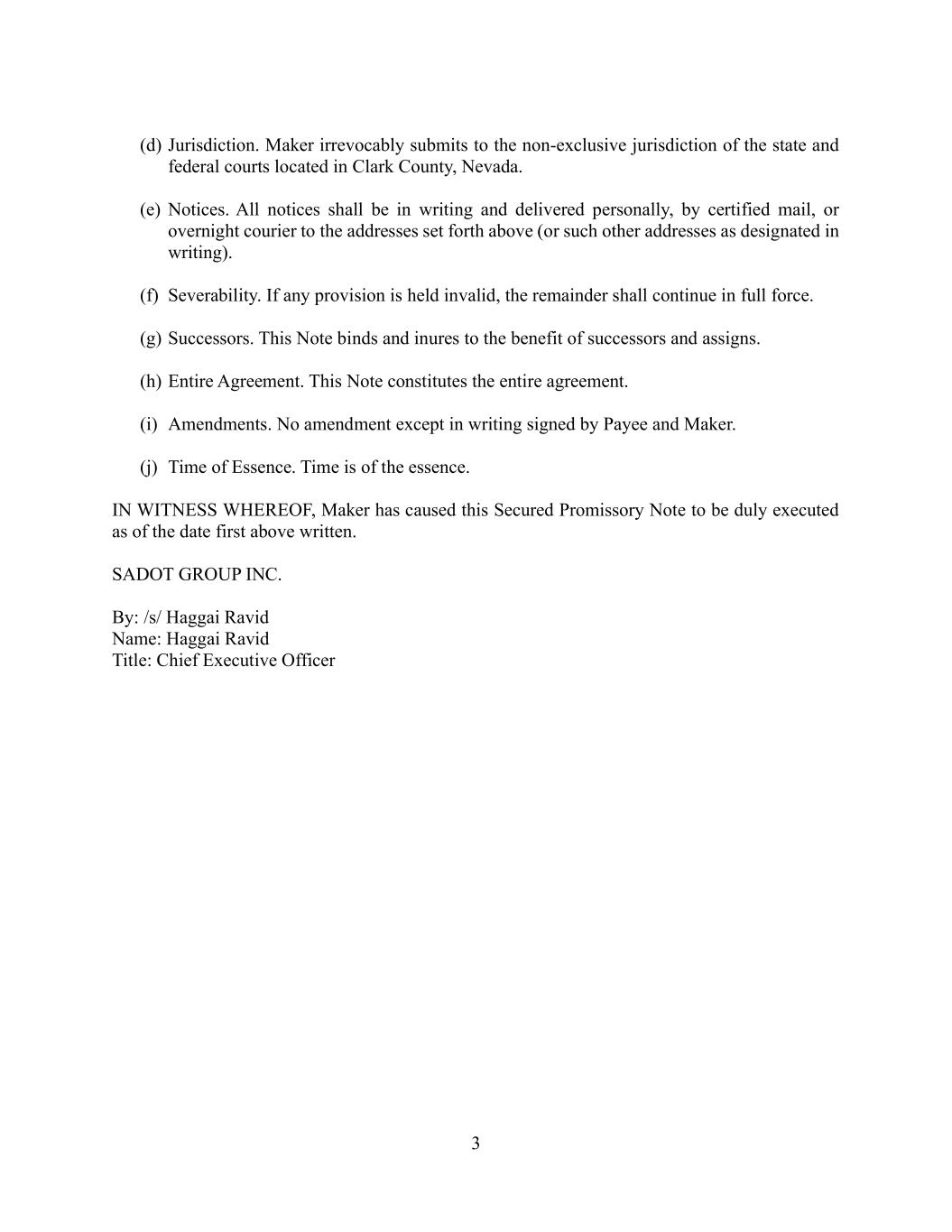 3 (d) Jurisdiction. Maker irrevocably submits to the non-exclusive jurisdiction of the state and federal courts located in Clark County, Nevada. (e) Notices. All notices shall be in writing and delivered personally, by certified mail, or overnight courier to the addresses set forth above (or such other addresses as designated in writing). (f) Severability. If any provision is held invalid, the remainder shall continue in full force. (g) Successors. This Note binds and inures to the benefit of successors and assigns. (h) Entire Agreement. This Note constitutes the entire agreement. (i) Amendments. No amendment except in writing signed by Payee and Maker. (j) Time of Essence. Time is of the essence. IN WITNESS WHEREOF, Maker has caused this Secured Promissory Note to be duly executed as of the date first above written. SADOT GROUP INC. By: /s/ Haggai Ravid Name: Haggai Ravid Title: Chief Executive Officer