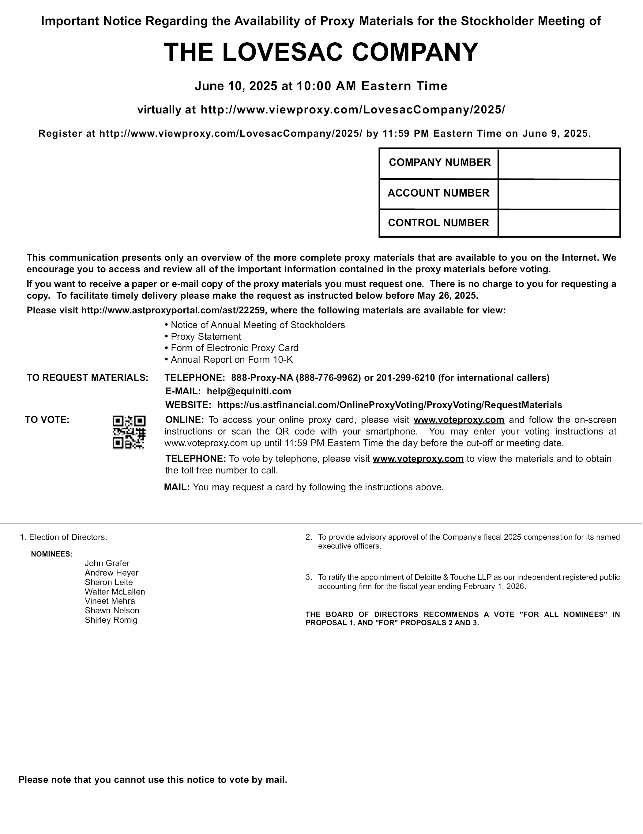 Notice Regarding the Availability of Proxy Materials for the Stockholder Meeting of THE LOVESAC COMPANY June 10, 2025 at 10:00 AM Eastern Time virtually at http://www.viewproxy.com/LovesacCompany/2025/ Register at http://www.viewproxy.com/LovesacCompany/2025/ by 11:59 PM Eastern Time on June 9, 2025. JOHN SMITH 1234 MAIN STREET APT. 203 NEW YORK, NY 10038 COMPANY NUMBER ACCOUNT NUMBER CONTROL NUMBER This communication presents only an overview of the more complete proxy materials that are available to you on the Internet. We encourage you to access and review all of the important information contained in the proxy materials before voting. If you want to receive a paper or e-mail copy of the proxy materials you must request one. There is no charge to you for requesting a copy. To facilitate timely delivery please make the request as instructed below before May 26, 2025. Please visit http://www.astproxyportal.com/ast/22259, where the following materials are available for view: • Notice of Annual Meeting of Stockholders • Proxy Statement • Form of Electronic Proxy Card • Annual Report on Form 10-K TO REQUEST MATERIALS: TELEPHONE: 888-Proxy-NA (888-776-9962) or 201-299-6210 (for international callers) E-MAIL: help@equiniti.com WEBSITE: https://us.astfinancial.com/OnlineProxyVoting/ProxyVoting/RequestMaterials TO VOTE: ONLINE: To access your online proxy card, please visit www.voteproxy.com and follow the on-screen instructions or scan the QR code with your smartphone. You may enter your voting instructions at www.voteproxy.com up until 11:59 PM Eastern Time the day before the cut-off or meeting date. TELEPHONE: To vote by telephone, please visit www.voteproxy.com to view the materials and to obtain the toll free number to call. MAIL: You may request a card by following the instructions above. 1. Election of Directors: NOMINEES: John Grafer Andrew Heyer Sharon Leite Walter McLallen Vineet Mehra Shawn Nelson Shirley Romig 2. To provide advisory approval of the Company’s fiscal 2025 compensation for its named executive officers. 3. To ratify the appointment of Deloitte & Touche LLP as our independent registered public accounting firm for the fiscal year ending February 1, 2026. THE BOARD OF DIRECTORS RECOMMENDS A VOTE “FOR ALL NOMINEES” IN PROPOSAL 1, AND “FOR” PROPOSALS 2 AND 3. Please note that you cannot use this notice to vote by mail.