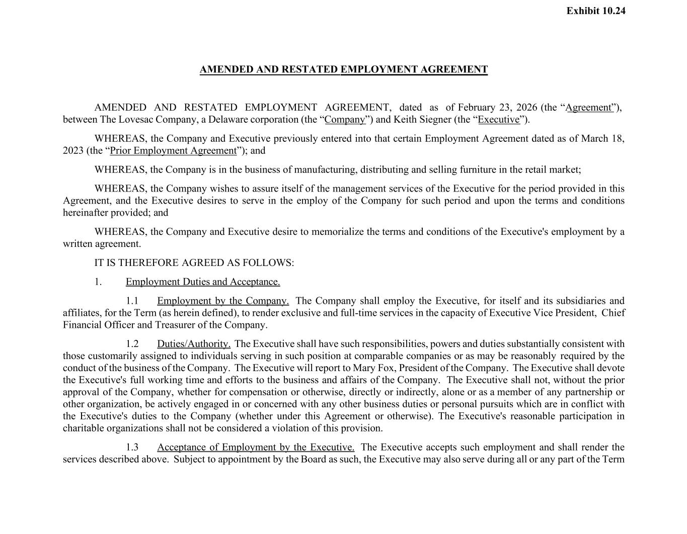 AMENDED AND RESTATED EMPLOYMENT AGREEMENT AMENDED AND RESTATED EMPLOYMENT AGREEMENT, dated as of February 23, 2026 (the “Agreement”), between The Lovesac Company, a Delaware corporation (the “Company”) and Keith Siegner (the “Executive”). WHEREAS, the Company and Executive previously entered into that certain Employment Agreement dated as of March 18, 2023 (the “Prior Employment Agreement”); and WHEREAS, the Company is in the business of manufacturing, distributing and selling furniture in the retail market; WHEREAS, the Company wishes to assure itself of the management services of the Executive for the period provided in this Agreement, and the Executive desires to serve in the employ of the Company for such period and upon the terms and conditions hereinafter provided; and WHEREAS, the Company and Executive desire to memorialize the terms and conditions of the Executive's employment by a written agreement. IT IS THEREFORE AGREED AS FOLLOWS: 1. Employment Duties and Acceptance. 1.1 Employment by the Company. The Company shall employ the Executive, for itself and its subsidiaries and affiliates, for the Term (as herein defined), to render exclusive and full-time services in the capacity of Executive Vice President, Chief Financial Officer and Treasurer of the Company. 1.2 Duties/Authority. The Executive shall have such responsibilities, powers and duties substantially consistent with those customarily assigned to individuals serving in such position at comparable companies or as may be reasonably required by the conduct of the business of the Company. The Executive will report to Mary Fox, President of the Company. The Executive shall devote the Executive's full working time and efforts to the business and affairs of the Company. The Executive shall not, without the prior approval of the Company, whether for compensation or otherwise, directly or indirectly, alone or as a member of any partnership or other organization, be actively engaged in or concerned with any other business duties or personal pursuits which are in conflict with the Executive's duties to the Company (whether under this Agreement or otherwise). The Executive's reasonable participation in charitable organizations shall not be considered a violation of this provision. 1.3 Acceptance of Employment by the Executive. The Executive accepts such employment and shall render the services described above. Subject to appointment by the Board as such, the Executive may also serve during all or any part of the Term Exhibit 10.24