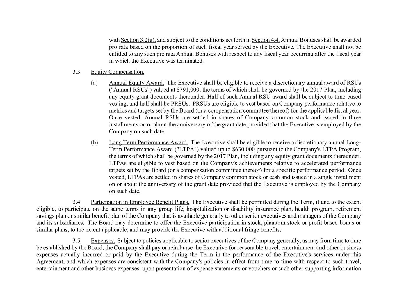with Section 3.2(a), and subject to the conditions set forth in Section 4.4, Annual Bonuses shall be awarded pro rata based on the proportion of such fiscal year served by the Executive. The Executive shall not be entitled to any such pro rata Annual Bonuses with respect to any fiscal year occurring after the fiscal year in which the Executive was terminated. 3.3 Equity Compensation. (a) Annual Equity Award. The Executive shall be eligible to receive a discretionary annual award of RSUs ("Annual RSUs") valued at $791,000, the terms of which shall be governed by the 2017 Plan, including any equity grant documents thereunder. Half of such Annual RSU award shall be subject to time-based vesting, and half shall be PRSUs. PRSUs are eligible to vest based on Company performance relative to metrics and targets set by the Board (or a compensation committee thereof) for the applicable fiscal year. Once vested, Annual RSUs are settled in shares of Company common stock and issued in three installments on or about the anniversary of the grant date provided that the Executive is employed by the Company on such date. (b) Long Term Performance Award. The Executive shall be eligible to receive a discretionary annual Long- Term Performance Award ("LTPA") valued up to $630,000 pursuant to the Company's LTPA Program, the terms of which shall be governed by the 2017 Plan, including any equity grant documents thereunder. LTPAs are eligible to vest based on the Company's achievements relative to accelerated performance targets set by the Board (or a compensation committee thereof) for a specific performance period. Once vested, LTPAs are settled in shares of Company common stock or cash and issued in a single installment on or about the anniversary of the grant date provided that the Executive is employed by the Company on such date. 3.4 Participation in Employee Benefit Plans. The Executive shall be permitted during the Term, if and to the extent eligible, to participate on the same terms in any group life, hospitalization or disability insurance plan, health program, retirement savings plan or similar benefit plan of the Company that is available generally to other senior executives and managers of the Company and its subsidiaries. The Board may determine to offer the Executive participation in stock, phantom stock or profit based bonus or similar plans, to the extent applicable, and may provide the Executive with additional fringe benefits. 3.5 Expenses. Subject to policies applicable to senior executives of the Company generally, as may from time to time be established by the Board, the Company shall pay or reimburse the Executive for reasonable travel, entertainment and other business expenses actually incurred or paid by the Executive during the Term in the performance of the Executive's services under this Agreement, and which expenses are consistent with the Company's policies in effect from time to time with respect to such travel, entertainment and other business expenses, upon presentation of expense statements or vouchers or such other supporting information