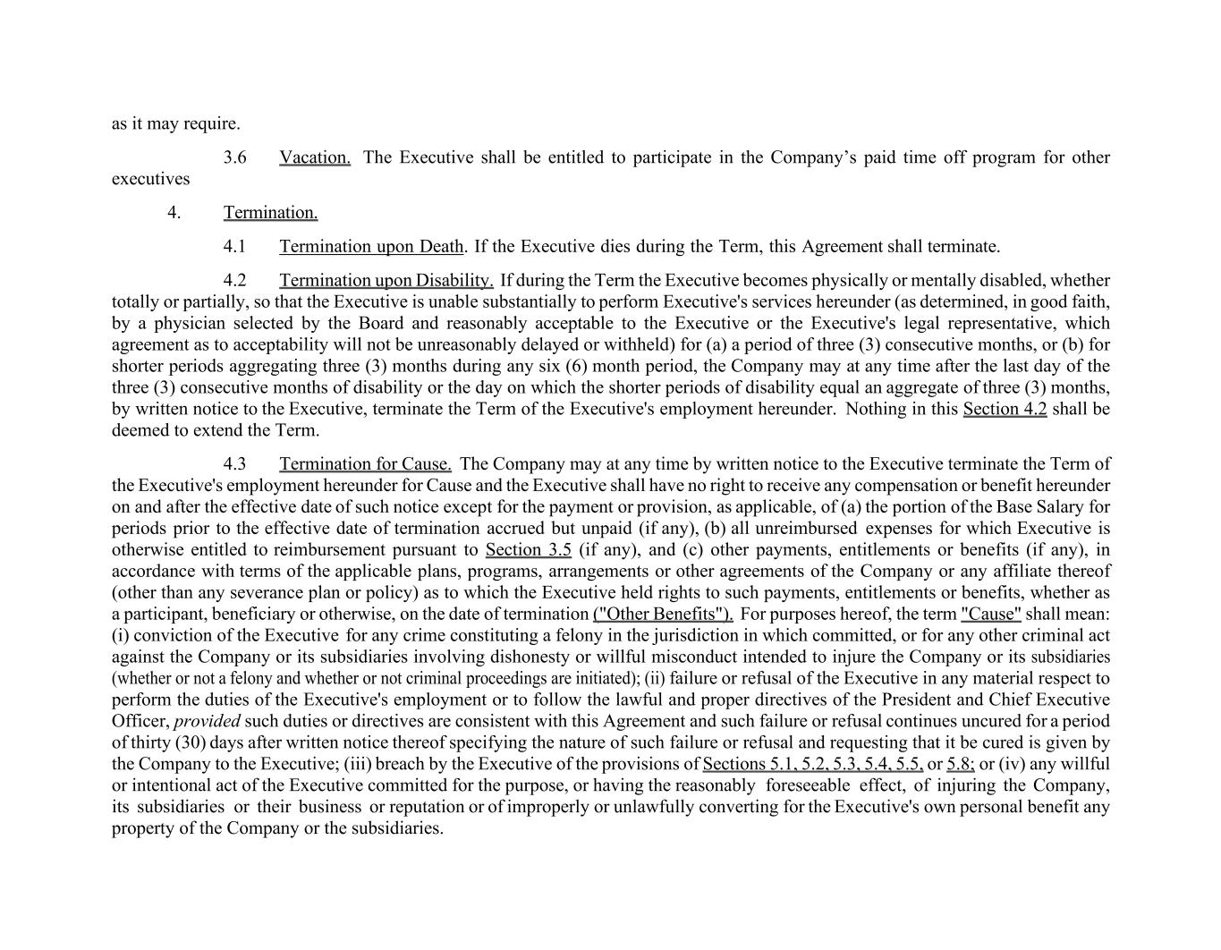 as it may require. 3.6 Vacation. The Executive shall be entitled to participate in the Company’s paid time off program for other executives 4. Termination. 4.1 Termination upon Death. If the Executive dies during the Term, this Agreement shall terminate. 4.2 Termination upon Disability. If during the Term the Executive becomes physically or mentally disabled, whether totally or partially, so that the Executive is unable substantially to perform Executive's services hereunder (as determined, in good faith, by a physician selected by the Board and reasonably acceptable to the Executive or the Executive's legal representative, which agreement as to acceptability will not be unreasonably delayed or withheld) for (a) a period of three (3) consecutive months, or (b) for shorter periods aggregating three (3) months during any six (6) month period, the Company may at any time after the last day of the three (3) consecutive months of disability or the day on which the shorter periods of disability equal an aggregate of three (3) months, by written notice to the Executive, terminate the Term of the Executive's employment hereunder. Nothing in this Section 4.2 shall be deemed to extend the Term. 4.3 Termination for Cause. The Company may at any time by written notice to the Executive terminate the Term of the Executive's employment hereunder for Cause and the Executive shall have no right to receive any compensation or benefit hereunder on and after the effective date of such notice except for the payment or provision, as applicable, of (a) the portion of the Base Salary for periods prior to the effective date of termination accrued but unpaid (if any), (b) all unreimbursed expenses for which Executive is otherwise entitled to reimbursement pursuant to Section 3.5 (if any), and (c) other payments, entitlements or benefits (if any), in accordance with terms of the applicable plans, programs, arrangements or other agreements of the Company or any affiliate thereof (other than any severance plan or policy) as to which the Executive held rights to such payments, entitlements or benefits, whether as a participant, beneficiary or otherwise, on the date of termination ("Other Benefits"). For purposes hereof, the term "Cause" shall mean: (i) conviction of the Executive for any crime constituting a felony in the jurisdiction in which committed, or for any other criminal act against the Company or its subsidiaries involving dishonesty or willful misconduct intended to injure the Company or its subsidiaries (whether or not a felony and whether or not criminal proceedings are initiated); (ii) failure or refusal of the Executive in any material respect to perform the duties of the Executive's employment or to follow the lawful and proper directives of the President and Chief Executive Officer, provided such duties or directives are consistent with this Agreement and such failure or refusal continues uncured for a period of thirty (30) days after written notice thereof specifying the nature of such failure or refusal and requesting that it be cured is given by the Company to the Executive; (iii) breach by the Executive of the provisions of Sections 5.1, 5.2, 5.3, 5.4, 5.5, or 5.8; or (iv) any willful or intentional act of the Executive committed for the purpose, or having the reasonably foreseeable effect, of injuring the Company, its subsidiaries or their business or reputation or of improperly or unlawfully converting for the Executive's own personal benefit any property of the Company or the subsidiaries.