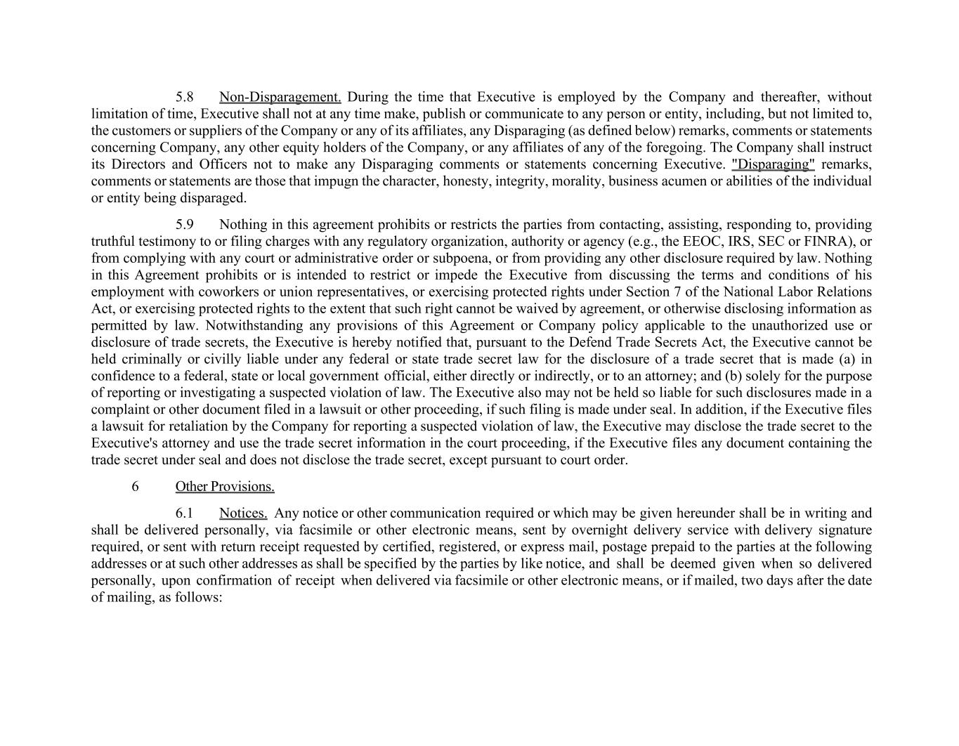 5.8 Non-Disparagement. During the time that Executive is employed by the Company and thereafter, without limitation of time, Executive shall not at any time make, publish or communicate to any person or entity, including, but not limited to, the customers or suppliers of the Company or any of its affiliates, any Disparaging (as defined below) remarks, comments or statements concerning Company, any other equity holders of the Company, or any affiliates of any of the foregoing. The Company shall instruct its Directors and Officers not to make any Disparaging comments or statements concerning Executive. "Disparaging" remarks, comments or statements are those that impugn the character, honesty, integrity, morality, business acumen or abilities of the individual or entity being disparaged. 5.9 Nothing in this agreement prohibits or restricts the parties from contacting, assisting, responding to, providing truthful testimony to or filing charges with any regulatory organization, authority or agency (e.g., the EEOC, IRS, SEC or FINRA), or from complying with any court or administrative order or subpoena, or from providing any other disclosure required by law. Nothing in this Agreement prohibits or is intended to restrict or impede the Executive from discussing the terms and conditions of his employment with coworkers or union representatives, or exercising protected rights under Section 7 of the National Labor Relations Act, or exercising protected rights to the extent that such right cannot be waived by agreement, or otherwise disclosing information as permitted by law. Notwithstanding any provisions of this Agreement or Company policy applicable to the unauthorized use or disclosure of trade secrets, the Executive is hereby notified that, pursuant to the Defend Trade Secrets Act, the Executive cannot be held criminally or civilly liable under any federal or state trade secret law for the disclosure of a trade secret that is made (a) in confidence to a federal, state or local government official, either directly or indirectly, or to an attorney; and (b) solely for the purpose of reporting or investigating a suspected violation of law. The Executive also may not be held so liable for such disclosures made in a complaint or other document filed in a lawsuit or other proceeding, if such filing is made under seal. In addition, if the Executive files a lawsuit for retaliation by the Company for reporting a suspected violation of law, the Executive may disclose the trade secret to the Executive's attorney and use the trade secret information in the court proceeding, if the Executive files any document containing the trade secret under seal and does not disclose the trade secret, except pursuant to court order. 6 Other Provisions. 6.1 Notices. Any notice or other communication required or which may be given hereunder shall be in writing and shall be delivered personally, via facsimile or other electronic means, sent by overnight delivery service with delivery signature required, or sent with return receipt requested by certified, registered, or express mail, postage prepaid to the parties at the following addresses or at such other addresses as shall be specified by the parties by like notice, and shall be deemed given when so delivered personally, upon confirmation of receipt when delivered via facsimile or other electronic means, or if mailed, two days after the date of mailing, as follows:
