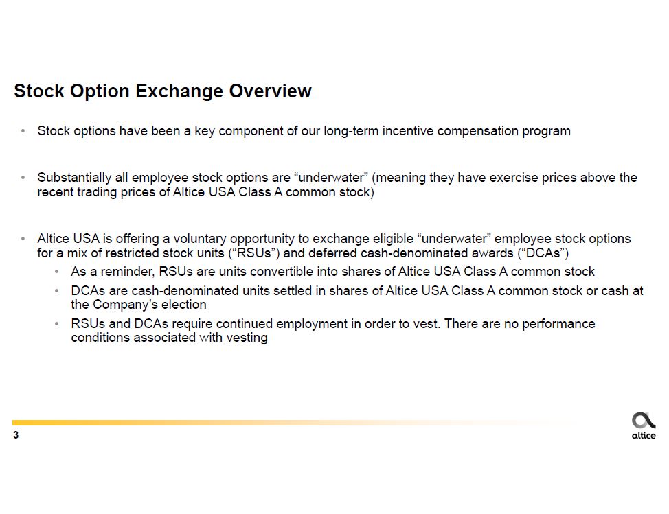 Additional Information and Where to Find It At the time the Exchange Offer begins, the Company will provide option holders who are eligible to participate in the Exchange Offer with written materials explaining the precise terms and timing of the program. Persons who are eligible to participate in the Exchange Offer should read these written materials carefully when they become available because they will contain important information about the Exchange Offer. The Company will also file these written materials with the Securities and Exchange Commission (the "SEC") as part of a Tender Offer Statement on Schedule TO upon commencement of the Exchange Offer. The Company's stockholders and eligible option holders will be able to obtain these written materials and other documents filed by the Company with the SEC free of charge at www.sec.gov. You may also obtain these materials for free on https://myoptionexchange.com. Questions and requests should be directed to alticeusacomp@alticeusa.com. 23