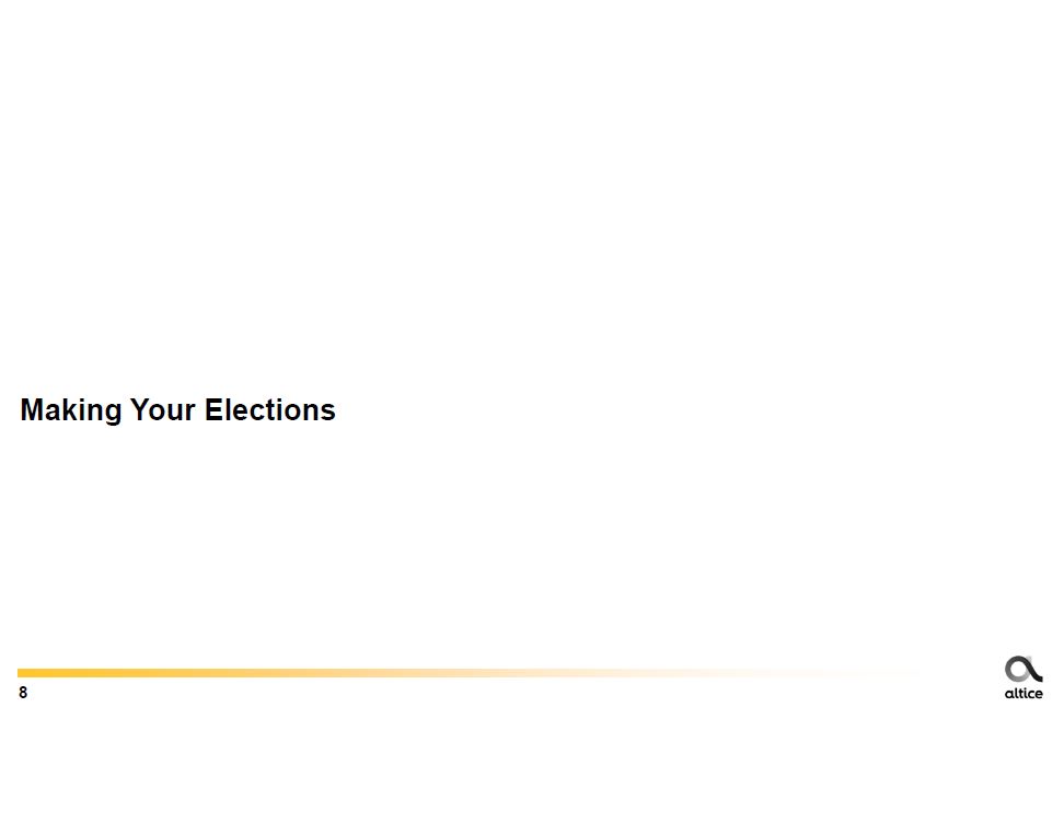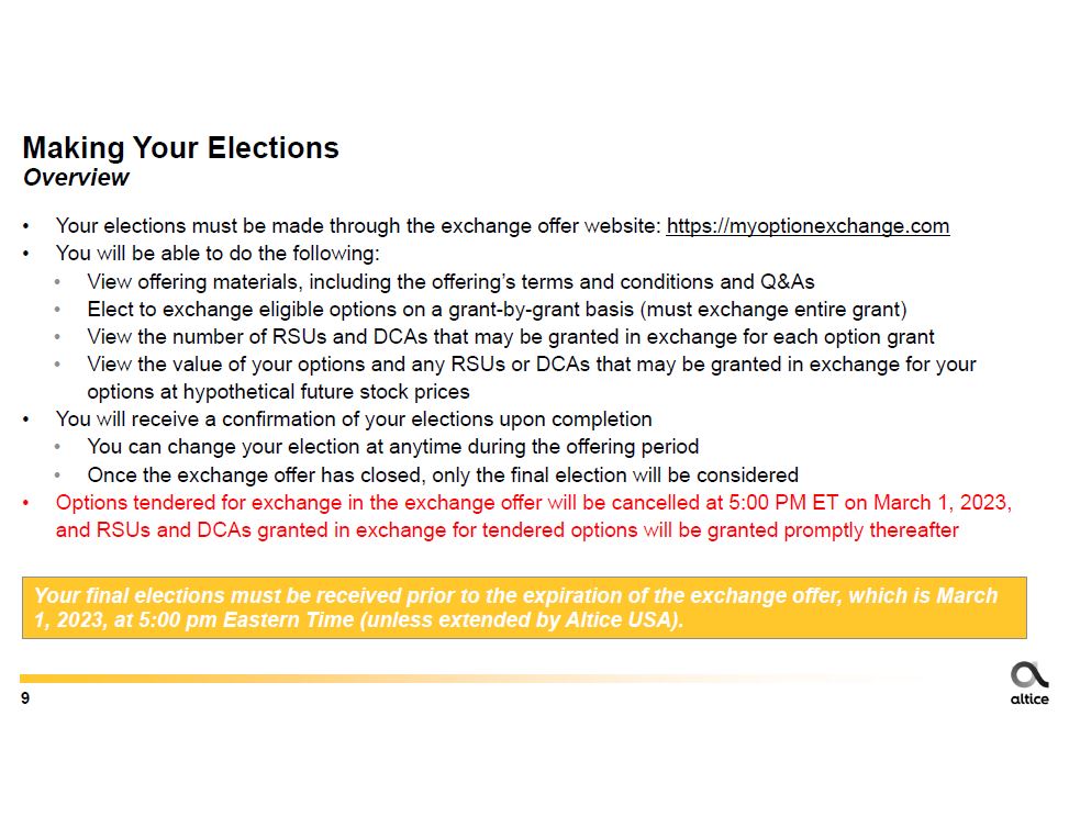 Making Your Elections Overview 5. You can now proceed with making your elections on the election form on the exchange offer website. All elections must be made on a grant-by-grant basis. Exchange Offer Commencement Date: January 23, 2023 Expiration Time: March 1, 2023 at 5:00 PM Eastern Time We are offering you the opportunity to exchange some or all of your eligible stock options, as described in the Offer to Exchange Eligible Options for Replacement Awards (the "Offer to Exchange"), for a combination of restricted stock units ("RSUs") and deferred cash-denominated ("DCAs"), the "Exchange Offer." Subject to the terms and conditions of the Exchange Offer as described in the Offer to Exchange, one RSU and $10 of DCAs will be granted for every seven of your eligible stock options tendered for exchange. If you tender a number of eligible stock options in the Exchange Offer that is greater than but not divisible by seven, you will receive an additional $2 of DCAs for each remainder eligible stock option tendered. You may not tender less than seven eligible stock options. You can view the number and per share exercise price of each of your eligible stock option grants and the number of RSUs and DCAs that may be granted in exchange for each tendered eligible stock option by clicking "Election Form" below. You can download and view the Offer to Exchange in the Resources section below. Resources Click on any of the links below to learn more. Tender Offer Statement on Schedule TO Offer to Exchange Eligible Options for Replacement Awards (includes Summary Term Sheet and Offering Memorandum) Form of Announcement Email to All Eligible Employees Form of Confirmation to Eligible Employees Form of Reminder Email Form of Final Reminder Email Form of Notice of Expiration of Exchange Offer Email Employee Exchange Offer Presentation The PDF documents above require Adobe Acrobat Reader. Adobe Acrobat Reader can be downloaded free of charge from Adobe. Make My Election The Exchange Offer will expire at 5:00 PM Eastern Time on March 1 2023. After this date and this time, you will not be able to make an election to tender for your eligible stock options for exchange. You have 47 days left to make your election on the Election Form. Before you make your election, you should carefully read the offering materials in the Resources section. Election Form Need Help? Contact AlticeUSAComp@alticeusa.com The Exchange Offer is being made pursuant to the terms and conditions set forth in the Tender Offer Statement on Schedule TO and the exhibits attached thereto, including the Offer to Exchange and the Offering Memorandum, filed with the Securities and Exchange Commission, which are available to you free of charge on this Option Exchange website or at www.sec.gov. You should read these materials carefully because they contain important information about the Exchange Offer, including risks related to participation in the Exchange Offer. Election Form Indicate your decision to tender each of your eligible stock option grants for exchange by selecting the "Exchange" choice in the Election column. If you do not want to tender one or more of your eligible stock option grants for exchange, select the "Do Not Exchange" choice in the Election column for those particular stock option grants. If you do not select the "Exchange" choice with respect to an eligible stock option grant by 5:00 PM Eastern Time on March 1, 2023, your election with respect to that eligible stock option grant will default to "Do Not Exchange", and the eligible stock option grant will not be exchanged. If you miss this deadline, you will be irrevocably treated as having elected not to exchange that eligible stock option grant. You may not tender only a portion of an eligible stock option grant. Exchange Offer Commencement Date: January 23, 2023 Expiration Time: March 1, 2023 at 5:00 PM Eastern Time Value Calculator Resources Grant Date Per Share Exercise Price Outstanding Shares Underlying Stock Option Grant* Vested Stock Options as of 3/1/2023** Unvested Stock Options as of 3/1/2023** Restricted Stock Units*** Deferred Cash-Denominated Awards*** Election 1/1/2018 $17.445 701 701 0 100 $1,002.00 6/28/2019 $24.08 1,661 830 831 237 $2,374.00 8/2/2019 $25.45 39,297 39,297 0 5,613 $56,142.00 8/2/2019 $25.45 9,824 9,824 0 1,403 $14,036.00 9/27/2019 $29.08 24,075 24,075 0 3,439 $34,394.00 9/27/2019 $29.08 13,757 10,317 3,440 1,965 $19,654.00 Total 12,757 $127,602.00 *This column displays the number of shares of Altice USA Class A common stock subject to the eligible stock option grant (assuming you remain employed with Altice USA or its subsidiaries or affiliates and the stock option is not exercised, through March 1, 2023). 14