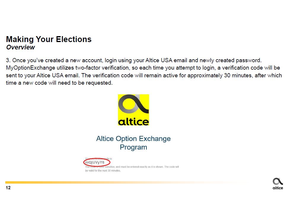 Making Your Elections Overview 3. Once you've created a new account, login using your Altice USA email and newly created password. MyOptionExchange utilizes two-factor verification, so each time you attempt to login, a verification code will be sent to your Altice USA email. The verification code will remain active for approximately 30 minutes, after which time a new code will need to be requested. Altice Option Exchange Program Your verification code is: mQjUVyY6 The code is case sensitive, and must be entered exactly as it is shown. The code will be valid for the next 30 minutes. 12