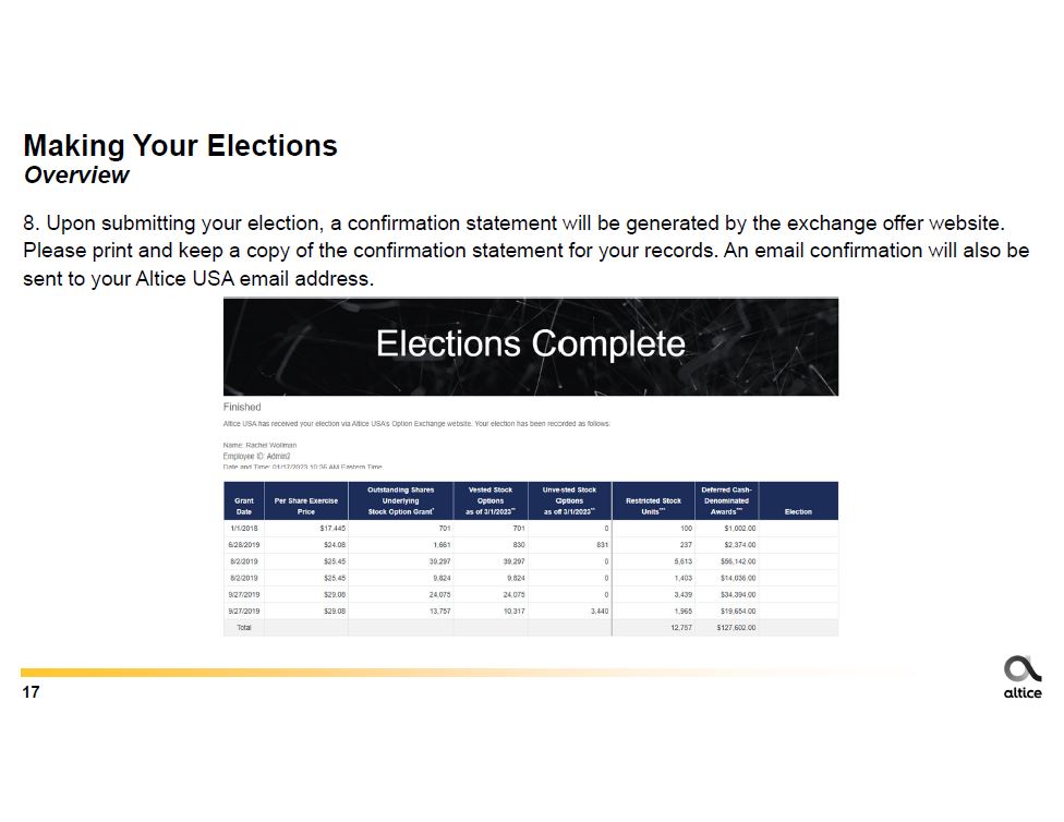 Making Your Elections Overview 8. Upon submitting your election, a confirmation statement will be generated by the exchange offer website. Please print and keep a copy of the confirmation statement for your records. An email confirmation will also be sent to your Altice USA email address. Elections Complete Finished Altice USA has received your election via Altice USA's Option Exchange website. Your election has been recorded as follows: Name: Rachel Wollman Employee ID: Admin2 Date and Time: 01/17/2023 10:36 AM Eastern Time Grant Date Per Share Exercise Price Outstanding Shares Underlying Stock Option Grant* Vested Stock Options as of 3/1/2023** Unvested Stock Options as of 3/1/2023** Restricted Stock Units*** Deferred Cash-Denominated Awards*** Election 1/1/2018 $17.445 701 701 0 100 $1,002.00 6/28/2019 $24.08 1,661 830 831 237 $2,374.00 8/2/2019 $25.45 39,297 39,297 0 5,613 $56,142.00 8/2/2019 $25.45 9,824 9,824 0 1,403 $14,036.00 9/27/2019 $29.08 24,075 24,075 0 3,439 $34,394.00 9/27/2019 $29.08 13,757 10,317 3,440 1,965 $19,654.00 Total 12,757 $127,602.00 17