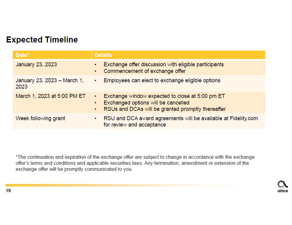 Important Considerations The terms governing the exchange offer will be set forth in tender offer documents (consisting of a Tender Offer Statement on Schedule TO and related exhibits thereto) to be filed with the SEC and available to you on the exchange offer website: https://myoptionexchange.com You should review the tender offer documents, including the "Risk Factors" section of the tender offer documents. Risks associated with participation in the exchange offer include: Vested options will be exchanged for unvested RSUs and unvested DCAs Extended vesting period may result in increased risk of forfeiture If your employment is terminated with Altice USA (other than as a result of death or disability) before the RSUs or DCAs received in the exchange offer vest, the unvested RSUs and DCAs will be cancelled, and you will receive no value from the unvested portion of the awards Participation does not guarantee continued or future employment with Altice USA or any of its affiliates A benefit or return cannot be guaranteed and participation in the exchange offer may result in no economic benefit You should consult with your personal financial and/or tax advisors to fully assess the benefits and risks involved in participating in the exchange offer Altice USA has not authorized anyone to make any recommendation on its behalf regarding participation in the exchange offer. Should a recommendation or representation be received, it should not be relied upon as having been authorized by Altice USA 20