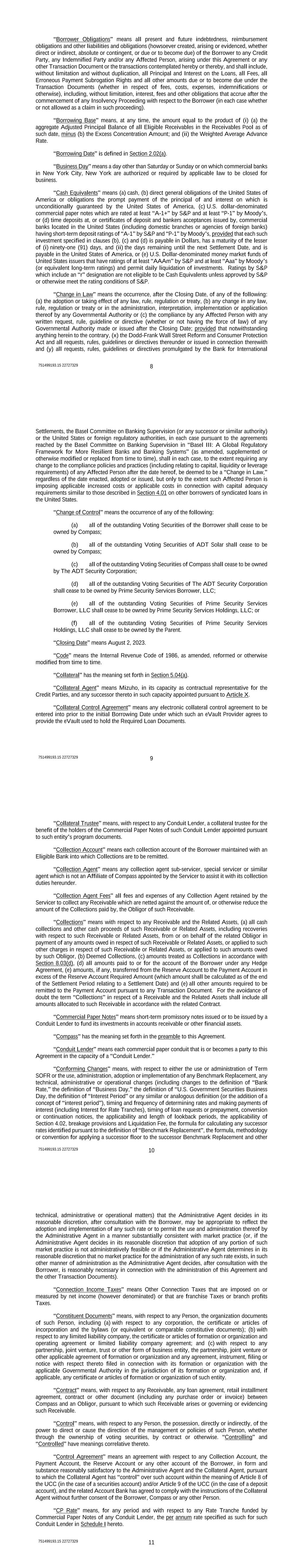 751499193.15 22727329 8 “Borrower Obligations” means all present and future indebtedness, reimbursement obligations and other liabilities and obligations (howsoever created, arising or evidenced, whether direct or indirect, absolute or contingent, or due or to become due) of the Borrower to any Credit Party, any Indemnified Party and/or any Affected Person, arising under this Agreement or any other Transaction Document or the transactions contemplated hereby or thereby, and shall include, without limitation and without duplication, all Principal and Interest on the Loans, all Fees, all Erroneous Payment Subrogation Rights and all other amounts due or to become due under the Transaction Documents (whether in respect of fees, costs, expenses, indemnifications or otherwise), including, without limitation, interest, fees and other obligations that accrue after the commencement of any Insolvency Proceeding with respect to the Borrower (in each case whether or not allowed as a claim in such proceeding). “Borrowing Base” means, at any time, the amount equal to the product of (i) (a) the aggregate Adjusted Principal Balance of all Eligible Receivables in the Receivables Pool as of such date, minus (b) the Excess Concentration Amount; and (ii) the Weighted Average Advance Rate. “Borrowing Date” is defined in Section 2.02(a). “Business Day” means a day other than Saturday or Sunday or on which commercial banks in New York City, New York are authorized or required by applicable law to be closed for business. “Cash Equivalents” means (a) cash, (b) direct general obligations of the United States of America or obligations the prompt payment of the principal of and interest on which is unconditionally guaranteed by the United States of America, (c) U.S. dollar-denominated commercial paper notes which are rated at least “A-1+” by S&P and at least “P-1” by Moody’s, or (d) time deposits at, or certificates of deposit and bankers acceptances issued by, commercial banks located in the United States (including domestic branches or agencies of foreign banks) having short-term deposit ratings of “A-1” by S&P and “P-1” by Moody’s, provided that each such investment specified in clauses (b), (c) and (d) is payable in Dollars, has a maturity of the lesser of (i) ninety-one (91) days, and (ii) the days remaining until the next Settlement Date, and is payable in the United States of America, or (e) U.S. Dollar-denominated money market funds of United States issuers that have ratings of at least “AAAm” by S&P and at least “Aaa” by Moody’s (or equivalent long-term ratings) and permit daily liquidation of investments. Ratings by S&P which include an “r” designation are not eligible to be Cash Equivalents unless approved by S&P or otherwise meet the rating conditions of S&P. “Change in Law” means the occurrence, after the Closing Date, of any of the following: (a) the adoption or taking effect of any law, rule, regulation or treaty, (b) any change in any law, rule, regulation or treaty or in the administration, interpretation, implementation or application thereof by any Governmental Authority or (c) the compliance by any Affected Person with any written request, rule, guideline or directive (whether or not having the force of law) of any Governmental Authority made or issued after the Closing Date; provided that notwithstanding anything herein to the contrary, (x) the Dodd-Frank Wall Street Reform and Consumer Protection Act and all requests, rules, guidelines or directives thereunder or issued in connection therewith and (y) all requests, rules, guidelines or directives promulgated by the Bank for International 751499193.15 22727329 9 Settlements, the Basel Committee on Banking Supervision (or any successor or similar authority) or the United States or foreign regulatory authorities, in each case pursuant to the agreements reached by the Basel Committee on Banking Supervision in “Basel III: A Global Regulatory Framework for More Resilient Banks and Banking Systems” (as amended, supplemented or otherwise modified or replaced from time to time), shall in each case, to the extent requiring any change to the compliance policies and practices (including relating to capital, liquidity or leverage requirements) of any Affected Person after the date hereof, be deemed to be a “Change in Law,” regardless of the date enacted, adopted or issued, but only to the extent such Affected Person is imposing applicable increased costs or applicable costs in connection with capital adequacy requirements similar to those described in Section 4.01 on other borrowers of syndicated loans in the United States. “Change of Control” means the occurrence of any of the following: (a) all of the outstanding Voting Securities of the Borrower shall cease to be owned by Compass; (b) all of the outstanding Voting Securities of ADT Solar shall cease to be owned by Compass; (c) all of the outstanding Voting Securities of Compass shall cease to be owned by The ADT Security Corporation; (d) all of the outstanding Voting Securities of The ADT Security Corporation shall cease to be owned by Prime Security Services Borrower, LLC; (e) all of the outstanding Voting Securities of Prime Security Services Borrower, LLC shall cease to be owned by Prime Security Services Holdings, LLC; or (f) all of the outstanding Voting Securities of Prime Security Services Holdings, LLC shall cease to be owned by the Parent. “Closing Date” means August 2, 2023. “Code” means the Internal Revenue Code of 1986, as amended, reformed or otherwise modified from time to time. “Collateral” has the meaning set forth in Section 5.04(a). “Collateral Agent” means Mizuho, in its capacity as contractual representative for the Credit Parties, and any successor thereto in such capacity appointed pursuant to Article X. “Collateral Control Agreement” means any electronic collateral control agreement to be ent