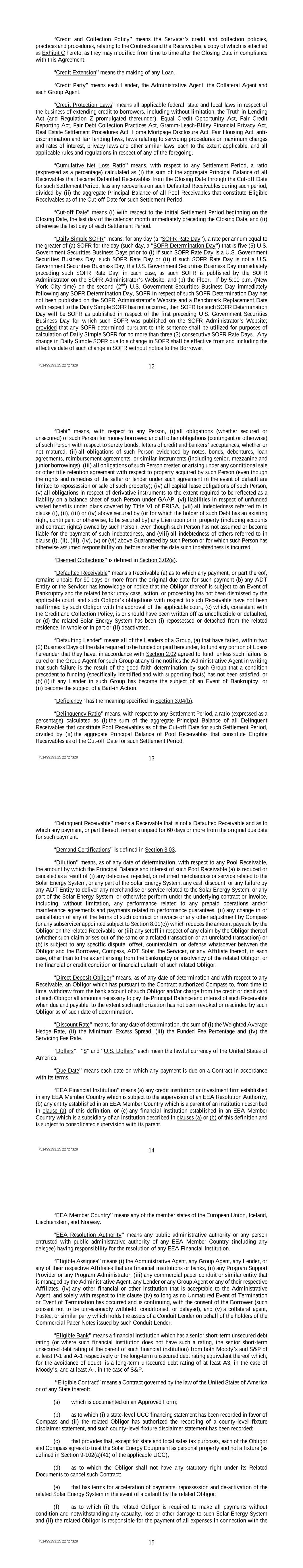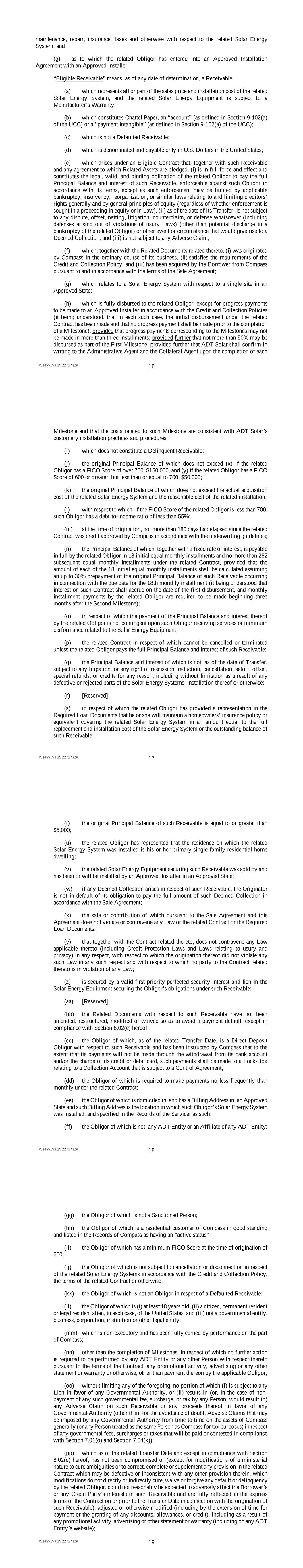 751499193.15 22727329 16 maintenance, repair, insurance, taxes and otherwise with respect to the related Solar Energy System; and (g) as to which the related Obligor has entered into an Approved Installation Agreement with an Approved Installer. “Eligible Receivable” means, as of any date of determination, a Receivable: (a) which represents all or part of the sales price and installation cost of the related Solar Energy System, and the related Solar Energy Equipment is subject to a Manufacturer’s Warranty; (b) which constitutes Chattel Paper, an “account” (as defined in Section 9-102(a) of the UCC) or a “payment intangible” (as defined in Section 9-102(a) of the UCC); (c) which is not a Defaulted Receivable; (d) which is denominated and payable only in U.S. Dollars in the United States; (e) which arises under an Eligible Contract that, together with such Receivable and any agreement to which Related Assets are pledged, (i) is in full force and effect and constitutes the legal, valid, and binding obligation of the related Obligor to pay the full Principal Balance and interest of such Receivable, enforceable against such Obligor in accordance with its terms, except as such enforcement may be limited by applicable bankruptcy, insolvency, reorganization, or similar laws relating to and limiting creditors’ rights generally and by general principles of equity (regardless of whether enforcement is sought in a proceeding in equity or in Law), (ii) as of the date of its Transfer, is not subject to any dispute, offset, netting, litigation, counterclaim, or defense whatsoever (including defenses arising out of violations of usury Laws) (other than potential discharge in a bankruptcy of the related Obligor) or other event or circumstance that would give rise to a Deemed Collection, and (iii) is not subject to any Adverse Claim; (f) which, together with the Related Documents related thereto, (i) was originated by Compass in the ordinary course of its business, (ii) satisfies the requirements of the Credit and Collection Policy, and (iii) has been acquired by the Borrower from Compass pursuant to and in accordance with the terms of the Sale Agreement; (g) which relates to a Solar Energy System with respect to a single site in an Approved State; (h) which is fully disbursed to the related Obligor, except for progress payments to be made to an Approved Installer in accordance with the Credit and Collection Policies (it being understood, that in each such case, the initial disbursement under the related Contract has been made and that no progress payment shall be made prior to the completion of a Milestone); provided that progress payments corresponding to the Milestones may not be made in more than three installments; provided further that not more than 50% may be disbursed as part of the First Milestone; provided further that ADT Solar shall confirm in writing to the Administrative Agent and the Collateral Agent upon the completion of each 751499193.15 22727329 17 Milestone and that the costs related to such Milestone are consistent with ADT Solar’s customary installation practices and procedures; (i) which does not constitute a Delinquent Receivable; (j) the original Principal Balance of which does not exceed (x) if the related Obligor has a FICO Score of over 700, $150,000, and (y) if the related Obligor has a FICO Score of 600 or greater, but less than or equal to 700, $50,000; (k) the original Principal Balance of which does not exceed the actual acquisition cost of the related Solar Energy System and the reasonable cost of the related installation; (l) with respect to which, if the FICO Score of the related Obligor is less than 700, such Obligor has a debt-to-income ratio of less than 55%; (m) at the time of origination, not more than 180 days had elapsed since the related Contract was credit approved by Compass in accordance with the underwriting guidelines; (n) the Principal Balance of which, together with a fixed rate of interest, is payable in full by the related Obligor in 18 initial equal monthly installments and no more than 282 subsequent equal monthly installments under the related Contract, provided that the amount of each of the 18 initial equal monthly installments shall be calculated assuming an up to 30% prepayment of the original Principal Balance of such Receivable occurring in connection with the due date for the 18th monthly installment (it being understood that interest on such Contract shall accrue on the date of the first disbursement, and monthly installment payments by the related Obligor are required to be made beginning three months after the Second Milestone); (o) in respect of which the payment of the Principal Balance and interest thereof by the related Obligor is not contingent upon such Obligor receiving services or minimum performance related to the Solar Energy Equipment; (p) the related Contract in respect of which cannot be cancelled or terminated unless the related Obligor pays the full Principal Balance and interest of such Receivable; (q) the Principal Balance and interest of which is not, as of the date of Transfer, subject to any litigation, or any right of rescission, reduction, cancellation, setoff, offset, special refunds, or credits for any reason, including without limitation as a result of any defective or rejected parts of the Solar Energy Systems, installation thereof or otherwise; (r) [Reserved]; (s) in respect of which the related Obligor has provided a representation in the Required Loan Documents that he or she will maintain a homeowners’ insurance policy or equivalent covering the related Solar Energy System in an amount equal to the full replacement and installation cost of the Solar Energy System or the outstanding balance of such Receivable; 751499193.15 22727329 18 (t) the original Principal Balance of such Receivable is equal to or greater than $5,000; (u) the related Obligor has represented that the residence on which th