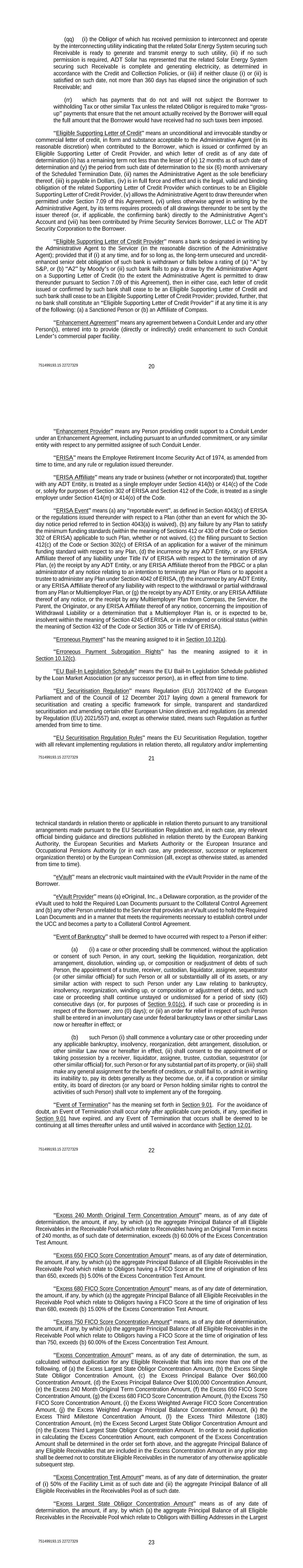 751499193.15 22727329 20 (qq) (i) the Obligor of which has received permission to interconnect and operate by the interconnecting utility indicating that the related Solar Energy System securing such Receivable is ready to generate and transmit energy to such utility, (ii) if no such permission is required, ADT Solar has represented that the related Solar Energy System securing such Receivable is complete and generating electricity, as determined in accordance with the Credit and Collection Policies, or (iii) if neither clause (i) or (ii) is satisfied on such date, not more than 360 days has elapsed since the origination of such Receivable; and (rr) which has payments that do not and will not subject the Borrower to withholding Tax or other similar Tax unless the related Obligor is required to make “gross- up” payments that ensure that the net amount actually received by the Borrower will equal the full amount that the Borrower would have received had no such taxes been imposed. “Eligible Supporting Letter of Credit” means an unconditional and irrevocable standby or commercial letter of credit, in form and substance acceptable to the Administrative Agent (in its reasonable discretion) when contributed to the Borrower, which is issued or confirmed by an Eligible Supporting Letter of Credit Provider, and which letter of credit as of any date of determination (i) has a remaining term not less than the lesser of (x) 12 months as of such date of determination and (y) the period from such date of determination to the six (6) month anniversary of the Scheduled Termination Date, (ii) names the Administrative Agent as the sole beneficiary thereof, (iii) is payable in Dollars, (iv) is in full force and effect and is the legal, valid and binding obligation of the related Supporting Letter of Credit Provider which continues to be an Eligible Supporting Letter of Credit Provider, (v) allows the Administrative Agent to draw thereunder when permitted under Section 7.09 of this Agreement, (vi) unless otherwise agreed in writing by the Administrative Agent, by its terms requires proceeds of all drawings thereunder to be sent by the issuer thereof (or, if applicable, the confirming bank) directly to the Administrative Agent’s Account and (vii) has been contributed by Prime Security Services Borrower, LLC or The ADT Security Corporation to the Borrower. “Eligible Supporting Letter of Credit Provider” means a bank so designated in writing by the Administrative Agent to the Servicer (in the reasonable discretion of the Administrative Agent); provided that if (i) at any time, and for so long as, the long-term unsecured and uncredit- enhanced senior debt obligation of such bank is withdrawn or falls below a rating of (a) “A” by S&P, or (b) “A2” by Moody’s or (ii) such bank fails to pay a draw by the Administrative Agent on a Supporting Letter of Credit (to the extent the Administrative Agent is permitted to draw thereunder pursuant to Section 7.09 of this Agreement), then in either case, each letter of credit issued or confirmed by such bank shall cease to be an Eligible Supporting Letter of Credit and such bank shall cease to be an Eligible Supporting Letter of Credit Provider; provided, further, that no bank shall constitute an “Eligible Supporting Letter of Credit Provider” if at any time it is any of the following: (a) a Sanctioned Person or (b) an Affiliate of Compass. “Enhancement Agreement” means any agreement between a Conduit Lender and any other Person(s), entered into to provide (directly or indirectly) credit enhancement to such Conduit Lender’s commercial paper facility. 751499193.15 22727329 21 “Enhancement Provider” means any Person providing credit support to a Conduit Lender under an Enhancement Agreement, including pursuant to an unfunded commitment, or any similar entity with respect to any permitted assignee of such Conduit Lender. “ERISA” means the Employee Retirement Income Security Act of 1974, as amended from time to time, and any rule or regulation issued thereunder. “ERISA Affiliate” means any trade or business (whether or not incorporated) that, together with any ADT Entity, is treated as a single employer under Section 414(b) or 414(c) of the Code or, solely for purposes of Section 302 of ERISA and Section 412 of the Code, is treated as a single employer under Section 414(m) or 414(o) of the Code. “ERISA Event” means (a) any “reportable event”, as defined in Section 4043(c) of ERISA or the regulations issued thereunder with respect to a Plan (other than an event for which the 30- day notice period referred to in Section 4043(a) is waived), (b) any failure by any Plan to satisfy the minimum funding standards (within the meaning of Sections 412 or 430 of the Code or Section 302 of ERISA) applicable to such Plan, whether or not waived, (c) the filing pursuant to Section 412(c) of the Code or Section 302(c) of ERISA of an application for a waiver of the minimum funding standard with respect to any Plan, (d) the incurrence by any ADT Entity, or any ERISA Affiliate thereof of any liability under Title IV of ERISA with respect to the termination of any Plan, (e) the receipt by any ADT Entity, or any ERISA Affiliate thereof from the PBGC or a plan administrator of any notice relating to an intention to terminate any Plan or Plans or to appoint a trustee to administer any Plan under Section 4042 of ERISA, (f) the incurrence by any ADT Entity, or any ERISA Affiliate thereof of any liability with respect to the withdrawal or partial withdrawal from any Plan or Multiemployer Plan, or (g) the receipt by any ADT Entity, or any ERISA Affiliate thereof of any notice, or the receipt by any Multiemployer Plan from Compass, the Servicer, the Parent, the Originator, or any ERISA Affiliate thereof of any notice, concerning the imposition of Withdrawal Liability or a determination that a Multiemployer Plan is, or is expected to be, insolvent within th