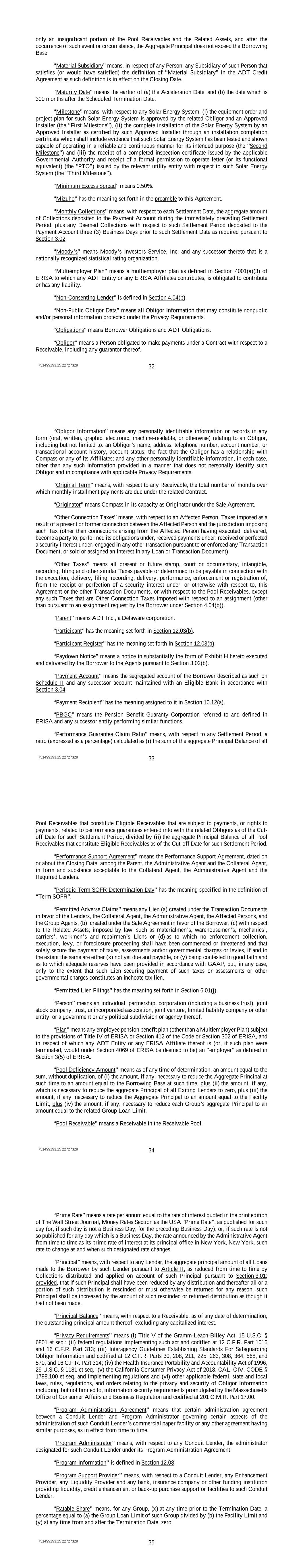751499193.15 22727329 32 only an insignificant portion of the Pool Receivables and the Related Assets, and after the occurrence of such event or circumstance, the Aggregate Principal does not exceed the Borrowing Base. “Material Subsidiary” means, in respect of any Person, any Subsidiary of such Person that satisfies (or would have satisfied) the definition of “Material Subsidiary” in the ADT Credit Agreement as such definition is in effect on the Closing Date. “Maturity Date” means the earlier of (a) the Acceleration Date, and (b) the date which is 300 months after the Scheduled Termination Date. “Milestone” means, with respect to any Solar Energy System, (i) the equipment order and project plan for such Solar Energy System is approved by the related Obligor and an Approved Installer (the “First Milestone”), (ii) the complete installation of the Solar Energy System by an Approved Installer as certified by such Approved Installer through an installation completion certificate which shall include evidence that such Solar Energy System has been tested and shown capable of operating in a reliable and continuous manner for its intended purpose (the “Second Milestone”) and (iii) the receipt of a completed inspection certificate issued by the applicable Governmental Authority and receipt of a formal permission to operate letter (or its functional equivalent) (the “PTO”) issued by the relevant utility entity with respect to such Solar Energy System (the “Third Milestone”). “Minimum Excess Spread” means 0.50%. “Mizuho” has the meaning set forth in the preamble to this Agreement. “Monthly Collections” means, with respect to each Settlement Date, the aggregate amount of Collections deposited to the Payment Account during the immediately preceding Settlement Period, plus any Deemed Collections with respect to such Settlement Period deposited to the Payment Account three (3) Business Days prior to such Settlement Date as required pursuant to Section 3.02. “Moody’s” means Moody’s Investors Service, Inc. and any successor thereto that is a nationally recognized statistical rating organization. “Multiemployer Plan” means a multiemployer plan as defined in Section 4001(a)(3) of ERISA to which any ADT Entity or any ERISA Affiliates contributes, is obligated to contribute or has any liability. “Non-Consenting Lender” is defined in Section 4.04(b). “Non-Public Obligor Data” means all Obligor Information that may constitute nonpublic and/or personal information protected under the Privacy Requirements. “Obligations” means Borrower Obligations and ADT Obligations. “Obligor” means a Person obligated to make payments under a Contract with respect to a Receivable, including any guarantor thereof. 751499193.15 22727329 33 “Obligor Information” means any personally identifiable information or records in any form (oral, written, graphic, electronic, machine-readable, or otherwise) relating to an Obligor, including but not limited to: an Obligor’s name, address, telephone number, account number, or transactional account history, account status; the fact that the Obligor has a relationship with Compass or any of its Affiliates; and any other personally identifiable information, in each case, other than any such information provided in a manner that does not personally identify such Obligor and in compliance with applicable Privacy Requirements. “Original Term” means, with respect to any Receivable, the total number of months over which monthly installment payments are due under the related Contract. “Originator” means Compass in its capacity as Originator under the Sale Agreement. “Other Connection Taxes” means, with respect to an Affected Person, Taxes imposed as a result of a present or former connection between the Affected Person and the jurisdiction imposing such Tax (other than connections arising from the Affected Person having executed, delivered, become a party to, performed its obligations under, received payments under, received or perfected a security interest under, engaged in any other transaction pursuant to or enforced any Transaction Document, or sold or assigned an interest in any Loan or Transaction Document). “Other Taxes” means all present or future stamp, court or documentary, intangible, recording, filing and other similar Taxes payable or determined to be payable in connection with the execution, delivery, filing, recording, delivery, performance, enforcement or registration of, from the receipt or perfection of a security interest under, or otherwise with respect to, this Agreement or the other Transaction Documents, or with respect to the Pool Receivables, except any such Taxes that are Other Connection Taxes imposed with respect to an assignment (other than pursuant to an assignment request by the Borrower under Section 4.04(b)). “Parent” means ADT Inc., a Delaware corporation. “Participant” has the meaning set forth in Section 12.03(b). “Participant Register” has the meaning set forth in Section 12.03(b). “Paydown Notice” means a notice in substantially the form of Exhibit H hereto executed and delivered by the Borrower to the Agents pursuant to Section 3.02(b). “Payment Account” means the segregated account of the Borrower described as such on Schedule II and any successor account maintained with an Eligible Bank in accordance with Section 3.04. “Payment Recipient” has the meaning assigned to it in Section 10.12(a). “PBGC” means the Pension Benefit Guaranty Corporation referred to and defined in ERISA and any successor entity performing similar functions. “Performance Guarantee Claim Ratio” means, with respect to any Settlement Period, a ratio (expressed as a percentage) calculated as (i) the sum of the aggregate Principal Balance of all 751499193.15 22727329 34 Pool Receivables that constitute Eligible Receivables that are subject to payments, or rights to paymen