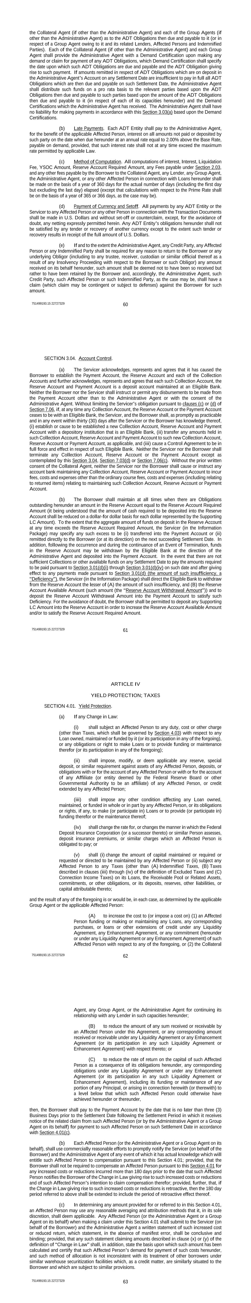 751499193.15 22727329 60 the Collateral Agent (if other than the Administrative Agent) and each of the Group Agents (if other than the Administrative Agent) as to the ADT Obligations then due and payable to it (or in respect of a Group Agent owing to it and its related Lenders, Affected Persons and Indemnified Parties). Each of the Collateral Agent (if other than the Administrative Agent) and each Group Agent shall provide the Administrative Agent with a Demand Certification upon making any demand or claim for payment of any ADT Obligations, which Demand Certification shall specify the date upon which such ADT Obligations are due and payable and the ADT Obligation giving rise to such payment. If amounts remitted in respect of ADT Obligations which are on deposit in the Administrative Agent’s Account on any Settlement Date are insufficient to pay in full all ADT Obligations which are then due and payable on such Settlement Date, the Administrative Agent shall distribute such funds on a pro rata basis to the relevant parties based upon the ADT Obligations then due and payable to such parties based upon the amount of the ADT Obligations then due and payable to it (in respect of each of its capacities hereunder) and the Demand Certifications which the Administrative Agent has received. The Administrative Agent shall have no liability for making payments in accordance with this Section 3.03(a) based upon the Demand Certifications. (b) Late Payments. Each ADT Entity shall pay to the Administrative Agent, for the benefit of the applicable Affected Person, interest on all amounts not paid or deposited by such party on the date when due hereunder at an annual rate equal to 2.00% above the Base Rate, payable on demand, provided, that such interest rate shall not at any time exceed the maximum rate permitted by applicable Law. (c) Method of Computation. All computations of interest, Interest, Liquidation Fee, YSOC Amount, Reserve Account Required Amount, any Fees payable under Section 2.03, and any other fees payable by the Borrower to the Collateral Agent, any Lender, any Group Agent, the Administrative Agent, or any other Affected Person in connection with Loans hereunder shall be made on the basis of a year of 360 days for the actual number of days (including the first day but excluding the last day) elapsed (except that calculations with respect to the Prime Rate shall be on the basis of a year of 365 or 366 days, as the case may be). (d) Payment of Currency and Setoff. All payments by any ADT Entity or the Servicer to any Affected Person or any other Person in connection with the Transaction Documents shall be made in U.S. Dollars and without set-off or counterclaim, except, for the avoidance of doubt, any netting expressly permitted herein. Any ADT Entity’s obligations hereunder shall not be satisfied by any tender or recovery of another currency except to the extent such tender or recovery results in receipt of the full amount of U.S. Dollars. (e) If and to the extent the Administrative Agent, any Credit Party, any Affected Person or any Indemnified Party shall be required for any reason to return to the Borrower or any underlying Obligor (including to any trustee, receiver, custodian or similar official thereof as a result of any Insolvency Proceeding with respect to the Borrower or such Obligor) any amount received on its behalf hereunder, such amount shall be deemed not to have been so received but rather to have been retained by the Borrower and, accordingly, the Administrative Agent, such Credit Party, such Affected Person or such Indemnified Party, as the case may be, shall have a claim (which claim may be contingent or subject to defenses) against the Borrower for such amount. 751499193.15 22727329 61 SECTION 3.04. Account Control. (a) The Servicer acknowledges, represents and agrees that it has caused the Borrower to establish the Payment Account, the Reserve Account and each of the Collection Accounts and further acknowledges, represents and agrees that each such Collection Account, the Reserve Account and Payment Account is a deposit account maintained at an Eligible Bank. Neither the Borrower nor the Servicer shall instruct or permit any disbursements to be made from the Payment Account other than to the Administrative Agent or with the consent of the Administrative Agent. Without limiting the Servicer’s obligation pursuant to clauses (c) or (d) of Section 7.06, if, at any time any Collection Account, the Reserve Account or the Payment Account ceases to be with an Eligible Bank, the Servicer, and the Borrower shall, as promptly as practicable and in any event within thirty (30) days after the Servicer or the Borrower has knowledge thereof, (i) establish or cause to be established a new Collection Account, Reserve Account and Payment Account with a depository institution that is an Eligible Bank, (ii) transfer any amounts held in such Collection Account, Reserve Account and Payment Account to such new Collection Account, Reserve Account or Payment Account, as applicable, and (iii) cause a Control Agreement to be in full force and effect in respect of such Eligible Bank. Neither the Servicer nor the Borrower shall terminate any Collection Account, Reserve Account or the Payment Account except as contemplated by this Section 3.04, Section 7.03(d) or Section 7.06(c). Without the prior written consent of the Collateral Agent, neither the Servicer nor the Borrower shall cause or instruct any account bank maintaining any Collection Account, Reserve Account or Payment Account to incur fees, costs and expenses other than the ordinary course fees, costs and expenses (including relating to returned items) relating to maintaining such Collection Account, Reserve Account or Payment Account. (b) The Borrower shall maintain at all times when there are Obligations outstanding hereunder an amount in the Reserve Account equal to the Reserve Account Required Amount (it being understood that th