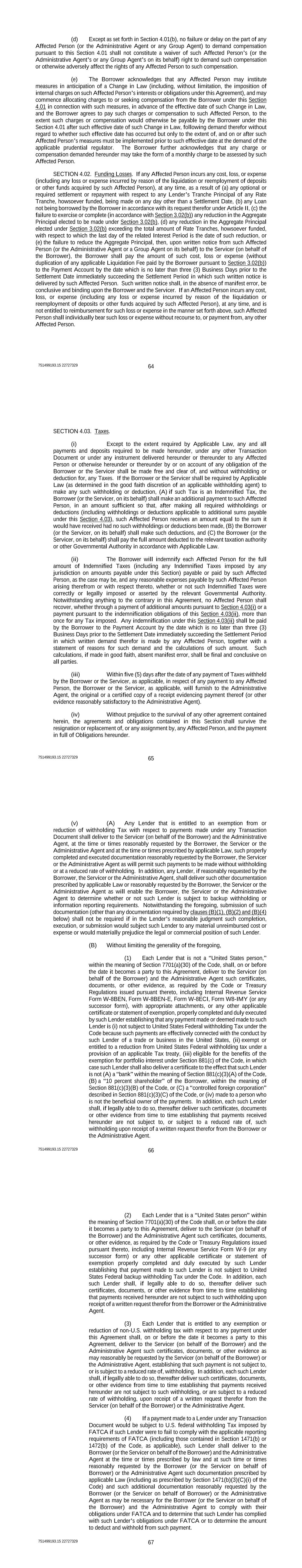 751499193.15 22727329 64 (d) Except as set forth in Section 4.01(b), no failure or delay on the part of any Affected Person (or the Administrative Agent or any Group Agent) to demand compensation pursuant to this Section 4.01 shall not constitute a waiver of such Affected Person’s (or the Administrative Agent’s or any Group Agent’s on its behalf) right to demand such compensation or otherwise adversely affect the rights of any Affected Person to such compensation. (e) The Borrower acknowledges that any Affected Person may institute measures in anticipation of a Change in Law (including, without limitation, the imposition of internal charges on such Affected Person’s interests or obligations under this Agreement), and may commence allocating charges to or seeking compensation from the Borrower under this Section 4.01 in connection with such measures, in advance of the effective date of such Change in Law, and the Borrower agrees to pay such charges or compensation to such Affected Person, to the extent such charges or compensation would otherwise be payable by the Borrower under this Section 4.01 after such effective date of such Change in Law, following demand therefor without regard to whether such effective date has occurred but only to the extent of, and on or after such Affected Person’s measures must be implemented prior to such effective date at the demand of the applicable prudential regulator. The Borrower further acknowledges that any charge or compensation demanded hereunder may take the form of a monthly charge to be assessed by such Affected Person. SECTION 4.02. Funding Losses. If any Affected Person incurs any cost, loss, or expense (including any loss or expense incurred by reason of the liquidation or reemployment of deposits or other funds acquired by such Affected Person), at any time, as a result of (a) any optional or required settlement or repayment with respect to any Lender’s Tranche Principal of any Rate Tranche, howsoever funded, being made on any day other than a Settlement Date, (b) any Loan not being borrowed by the Borrower in accordance with its request therefor under Article II, (c) the failure to exercise or complete (in accordance with Section 3.02(b)) any reduction in the Aggregate Principal elected to be made under Section 3.02(b), (d) any reduction in the Aggregate Principal elected under Section 3.02(b) exceeding the total amount of Rate Tranches, howsoever funded, with respect to which the last day of the related Interest Period is the date of such reduction, or (e) the failure to reduce the Aggregate Principal, then, upon written notice from such Affected Person (or the Administrative Agent or a Group Agent on its behalf) to the Servicer (on behalf of the Borrower), the Borrower shall pay the amount of such cost, loss or expense (without duplication of any applicable Liquidation Fee paid by the Borrower pursuant to Section 3.02(b)) to the Payment Account by the date which is no later than three (3) Business Days prior to the Settlement Date immediately succeeding the Settlement Period in which such written notice is delivered by such Affected Person. Such written notice shall, in the absence of manifest error, be conclusive and binding upon the Borrower and the Servicer. If an Affected Person incurs any cost, loss, or expense (including any loss or expense incurred by reason of the liquidation or reemployment of deposits or other funds acquired by such Affected Person), at any time, and is not entitled to reimbursement for such loss or expense in the manner set forth above, such Affected Person shall individually bear such loss or expense without recourse to, or payment from, any other Affected Person. 751499193.15 22727329 65 SECTION 4.03. Taxes. (i) Except to the extent required by Applicable Law, any and all payments and deposits required to be made hereunder, under any other Transaction Document or under any instrument delivered hereunder or thereunder to any Affected Person or otherwise hereunder or thereunder by or on account of any obligation of the Borrower or the Servicer shall be made free and clear of, and without withholding or deduction for, any Taxes. If the Borrower or the Servicer shall be required by Applicable Law (as determined in the good faith discretion of an applicable withholding agent) to make any such withholding or deduction, (A) if such Tax is an Indemnified Tax, the Borrower (or the Servicer, on its behalf) shall make an additional payment to such Affected Person, in an amount sufficient so that, after making all required withholdings or deductions (including withholdings or deductions applicable to additional sums payable under this Section 4.03), such Affected Person receives an amount equal to the sum it would have received had no such withholdings or deductions been made, (B) the Borrower (or the Servicer, on its behalf) shall make such deductions, and (C) the Borrower (or the Servicer, on its behalf) shall pay the full amount deducted to the relevant taxation authority or other Governmental Authority in accordance with Applicable Law. (ii) The Borrower will indemnify each Affected Person for the full amount of Indemnified Taxes (including any Indemnified Taxes imposed by any jurisdiction on amounts payable under this Section) payable or paid by such Affected Person, as the case may be, and any reasonable expenses payable by such Affected Person arising therefrom or with respect thereto, whether or not such Indemnified Taxes were correctly or legally imposed or asserted by the relevant Governmental Authority. Notwithstanding anything to the contrary in this Agreement, no Affected Person shall recover, whether through a payment of additional amounts pursuant to Section 4.03(i) or a payment pursuant to the indemnification obligations of this Section 4.03(ii), more than once for any Tax imposed. Any indemnification under this Section 4.03(ii) shall be paid by the Borrower to the Payment Account by the date w