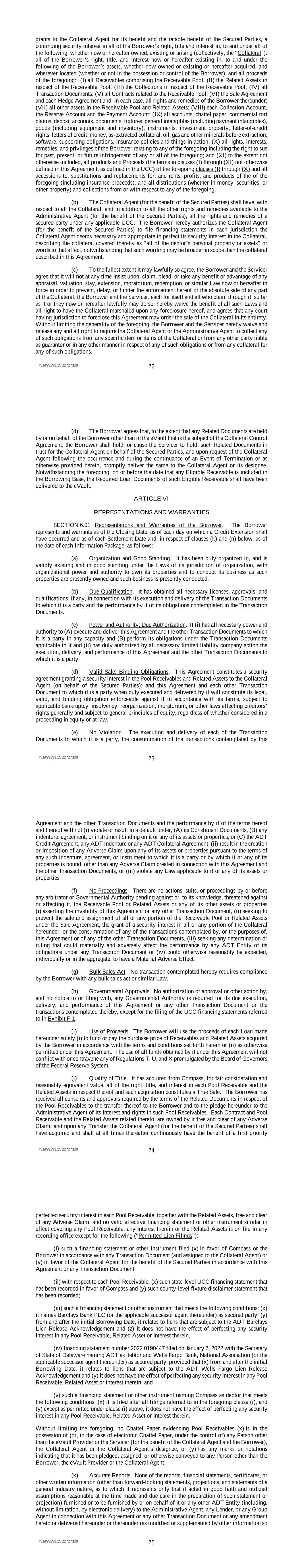 751499193.15 22727329 80 SECTION 6.02. Representations and Warranties of Compass. Compass represents and warrants as of the Closing Date, as of each day on which a Credit Extension shall have occurred and as of each Settlement Date and, in respect of clauses (j) and (l) below, as of the date of each Information Package, as follows: (a) Organization and Good Standing. It has been duly organized and is validly existing as a limited liability company in good standing under the Laws of its jurisdiction of organization, with power and authority to own its properties and to conduct its business as such properties are presently owned and such business is presently conducted. (b) Due Qualification. It is duly qualified to do business as a foreign limited liability company in good standing, and has obtained all necessary qualifications, licenses, and approvals, in all jurisdictions in which the ownership or lease of property or the conduct of its business (including the servicing of the Pool Receivables) requires such qualifications, licenses, or approvals, except where the failure to do so could not reasonably be expected, individually or in the aggregate, to result in a Material Adverse Effect. (c) Power and Authority; Due Authorization. It (i) has all necessary power and authority to (A) execute and deliver this Agreement and the other Transaction Documents to which it is a party in any capacity, and (B) carry out the terms of and perform its obligations under the Transaction Documents applicable to it, and (ii) has duly authorized by all necessary limited liability company action the execution, delivery, and performance of this Agreement and the other Transaction Documents to which it is a party. (d) Binding Obligations. This Agreement constitutes, and each other Transaction Document to be signed by it when duly executed and delivered by it will constitute, the legal, valid, and binding obligation of it, enforceable against it in accordance with its terms, subject to applicable bankruptcy, insolvency, reorganization, moratorium, or other laws affecting creditors’ rights generally and subject to general principles of equity, regardless of whether considered in a proceeding in equity or at law. (e) No Violation. The execution and delivery of each of the Transaction Documents to which it is a party and the consummation of the transactions contemplated by this Agreement and the other Transaction Documents and the performance by it of the terms hereof and thereof will not (i) violate or result in a default under, (A) its Constituent Documents, (B) any indenture, agreement or instrument binding on it or its assets or properties or (C) the ADT Credit Agreement, any ADT Indenture or any ADT Collateral Agreement, (ii) result in the creation or imposition of any Adverse Claim upon any of its assets or properties pursuant to the terms of any such indenture, agreement, or instrument, except as contemplated by the Sale Agreement, or (iii) violate any Law applicable to it or any of its assets or properties, except in the case of this clause (iii) to the extent that any such violations individually or in the aggregate could not reasonably be expected to result in a Material Adverse Effect. (f) No Proceedings. There are no actions, suits, or proceedings by or before any arbitrator or Governmental Authority pending against or, to the knowledge of the Servicer, threatened against or affecting the Servicer or any of its assets or properties (i) asserting the invalidity of this Agreement or any other Transaction Document, (ii) seeking to prevent the sale 751499193.15 22727329 81 and assignment of all or any portion of the Receivable Pool or Related Assets under the Sale Agreement, the grant of a security interest in all or any portion of the Collateral hereunder, or the consummation of any of the transactions contemplated by, or the purposes of, this Agreement or of any of the other Transaction Documents, (iii) seeking any determination or ruling that could materially and adversely affect the performance by any ADT Entity of its obligations under any Transaction Document or (iv) could otherwise reasonably be expected, individually or in the aggregate, to have a Material Adverse Effect. (g) Governmental Approvals. No authorization or approval or other action by, and no notice to or filing with, any Governmental Authority is required for its due execution, delivery, and performance of this Agreement or any other Transaction Document or the transactions contemplated thereby, except for (x) the filing of the UCC financing statements referred to in Article V, and (y) such authorizations, approvals, actions, notices or filings as have been obtained or made or for which the failure to obtain or make the same, individually or in the aggregate, could not reasonably be expected to result in a Material Adverse Effect. (h) Quality of Title. The Borrower has acquired from Compass, for fair consideration and reasonably equivalent value, all of the right, title, and interest in each Pool Receivable and the Related Assets in respect thereof and such acquisition constitutes a True Sale. The Borrower has received all consents and approvals required by the terms of the Related Documents in respect of the Pool Receivables to the transfer thereof to the Borrower and to the pledge hereunder to the Administrative Agent of its interest and rights in such Pool Receivables. Immediately prior to each sale or contribution of a Receivable under the Sale Agreement, Compass owned each Contract and Pool Receivable and the Related Assets related thereto free and clear of any Adverse Claim; and upon any Transfer under the Sale Agreement, the Collateral Agent (for the benefit of the Secured Parties) has acquired and at all times thereafter continuously has the benefit of a first priority perfected security interest in each Pool Receivable, together with the Related Assets, free and clear of any Adverse Claim; and no valid effective financing st