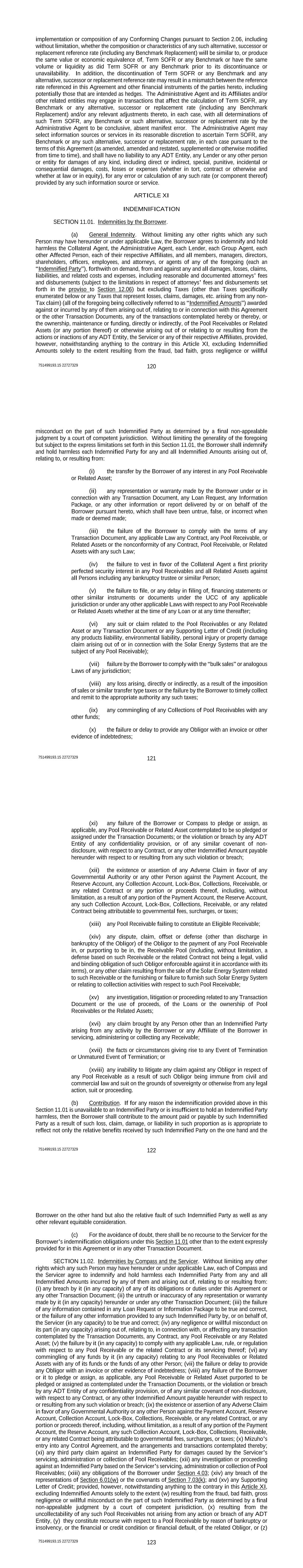 751499193.15 22727329 120 implementation or composition of any Conforming Changes pursuant to Section 2.06, including without limitation, whether the composition or characteristics of any such alternative, successor or replacement reference rate (including any Benchmark Replacement) will be similar to, or produce the same value or economic equivalence of, Term SOFR or any Benchmark or have the same volume or liquidity as did Term SOFR or any Benchmark prior to its discontinuance or unavailability. In addition, the discontinuation of Term SOFR or any Benchmark and any alternative, successor or replacement reference rate may result in a mismatch between the reference rate referenced in this Agreement and other financial instruments of the parties hereto, including potentially those that are intended as hedges. The Administrative Agent and its Affiliates and/or other related entities may engage in transactions that affect the calculation of Term SOFR, any Benchmark or any alternative, successor or replacement rate (including any Benchmark Replacement) and/or any relevant adjustments thereto, in each case, with all determinations of such Term SOFR, any Benchmark or such alternative, successor or replacement rate by the Administrative Agent to be conclusive, absent manifest error. The Administrative Agent may select information sources or services in its reasonable discretion to ascertain Term SOFR, any Benchmark or any such alternative, successor or replacement rate, in each case pursuant to the terms of this Agreement (as amended, amended and restated, supplemented or otherwise modified from time to time), and shall have no liability to any ADT Entity, any Lender or any other person or entity for damages of any kind, including direct or indirect, special, punitive, incidental or consequential damages, costs, losses or expenses (whether in tort, contract or otherwise and whether at law or in equity), for any error or calculation of any such rate (or component thereof) provided by any such information source or service. ARTICLE XI INDEMNIFICATION SECTION 11.01. Indemnities by the Borrower. (a) General Indemnity. Without limiting any other rights which any such Person may have hereunder or under applicable Law, the Borrower agrees to indemnify and hold harmless the Collateral Agent, the Administrative Agent, each Lender, each Group Agent, each other Affected Person, each of their respective Affiliates, and all members, managers, directors, shareholders, officers, employees, and attorneys, or agents of any of the foregoing (each an “Indemnified Party”), forthwith on demand, from and against any and all damages, losses, claims, liabilities, and related costs and expenses, including reasonable and documented attorneys’ fees and disbursements (subject to the limitations in respect of attorneys’ fees and disbursements set forth in the proviso to Section 12.06) but excluding Taxes (other than Taxes specifically enumerated below or any Taxes that represent losses, claims, damages, etc. arising from any non- Tax claim) (all of the foregoing being collectively referred to as “Indemnified Amounts”) awarded against or incurred by any of them arising out of, relating to or in connection with this Agreement or the other Transaction Documents, any of the transactions contemplated hereby or thereby, or the ownership, maintenance or funding, directly or indirectly, of the Pool Receivables or Related Assets (or any portion thereof) or otherwise arising out of or relating to or resulting from the actions or inactions of any ADT Entity, the Servicer or any of their respective Affiliates, provided, however, notwithstanding anything to the contrary in this Article XI, excluding Indemnified Amounts solely to the extent resulting from the fraud, bad faith, gross negligence or willful 751499193.15 22727329 121 misconduct on the part of such Indemnified Party as determined by a final non-appealable judgment by a court of competent jurisdiction. Without limiting the generality of the foregoing but subject to the express limitations set forth in this Section 11.01, the Borrower shall indemnify and hold harmless each Indemnified Party for any and all Indemnified Amounts arising out of, relating to, or resulting from: (i) the transfer by the Borrower of any interest in any Pool Receivable or Related Asset; (ii) any representation or warranty made by the Borrower under or in connection with any Transaction Document, any Loan Request, any Information Package, or any other information or report delivered by or on behalf of the Borrower pursuant hereto, which shall have been untrue, false, or incorrect when made or deemed made; (iii) the failure of the Borrower to comply with the terms of any Transaction Document, any applicable Law any Contract, any Pool Receivable, or Related Assets or the nonconformity of any Contract, Pool Receivable, or Related Assets with any such Law; (iv) the failure to vest in favor of the Collateral Agent a first priority perfected security interest in any Pool Receivables and all Related Assets against all Persons including any bankruptcy trustee or similar Person; (v) the failure to file, or any delay in filing of, financing statements or other similar instruments or documents under the UCC of any applicable jurisdiction or under any other applicable Laws with respect to any Pool Receivable or Related Assets whether at the time of any Loan or at any time thereafter; (vi) any suit or claim related to the Pool Receivables or any Related Asset or any Transaction Document or any Supporting Letter of Credit (including any products liability, environmental liability, personal injury or property damage claim arising out of or in connection with the Solar Energy Systems that are the subject of any Pool Receivable); (vii) failure by the Borrower to comply with the “bulk sales” or analogous Laws of any jurisdiction; (viii) any loss arising, directly or indirectly, as a result of the impositi
