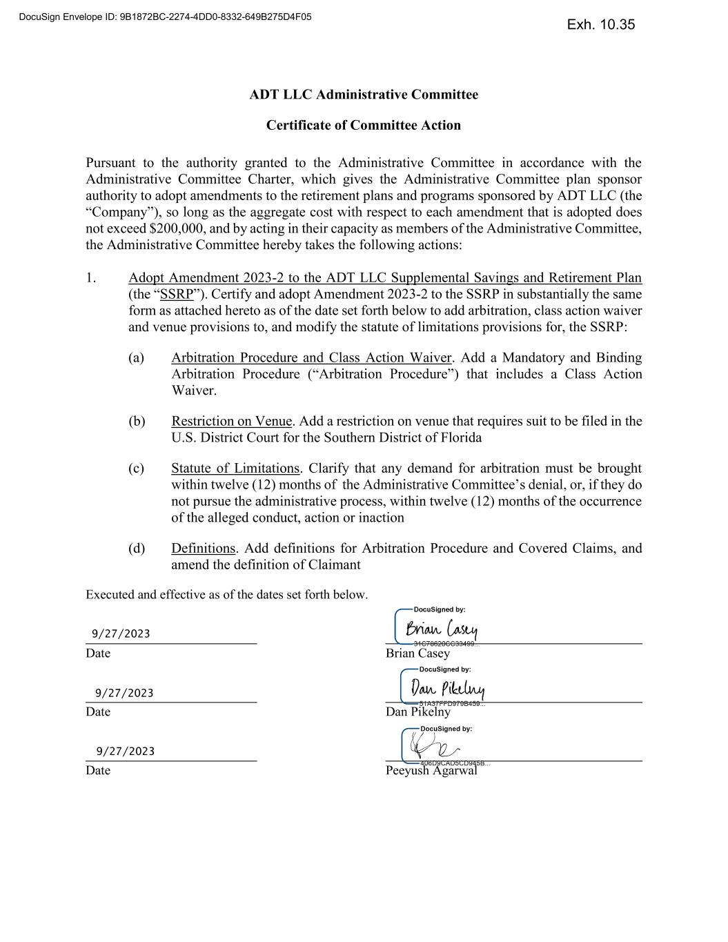 ADT LLC Administrative Committee Certificate of Committee Action Pursuant to the authority granted to the Administrative Committee in accordance with the Administrative Committee Charter, which gives the Administrative Committee plan sponsor authority to adopt amendments to the retirement plans and programs sponsored by ADT LLC (the not exceed $200,000, and by acting in their capacity as members of the Administrative Committee, the Administrative Committee hereby takes the following actions: 1. Adopt Amendment 2023-2 to the ADT LLC Supplemental Savings and Retirement Plan SSRP . Certify and adopt Amendment 2023-2 to the SSRP in substantially the same form as attached hereto as of the date set forth below to add arbitration, class action waiver and venue provisions to, and modify the statute of limitations provisions for, the SSRP: (a) Arbitration Procedure and Class Action Waiver. Add a Mandatory and Binding tion Waiver. (b) Restriction on Venue. Add a restriction on venue that requires suit to be filed in the U.S. District Court for the Southern District of Florida (c) Statute of Limitations. Clarify that any demand for arbitration must be brought within twelve (12) not pursue the administrative process, within twelve (12) months of the occurrence of the alleged conduct, action or inaction (d) Definitions. Add definitions for Arbitration Procedure and Covered Claims, and amend the definition of Claimant Executed and effective as of the dates set forth below. Date Brian Casey Date Dan Pikelny Date Peeyush Agarwal DocuSign Envelope ID: 9B1872BC-2274-4DD0-8332-649B275D4F05 Exh. 10.35