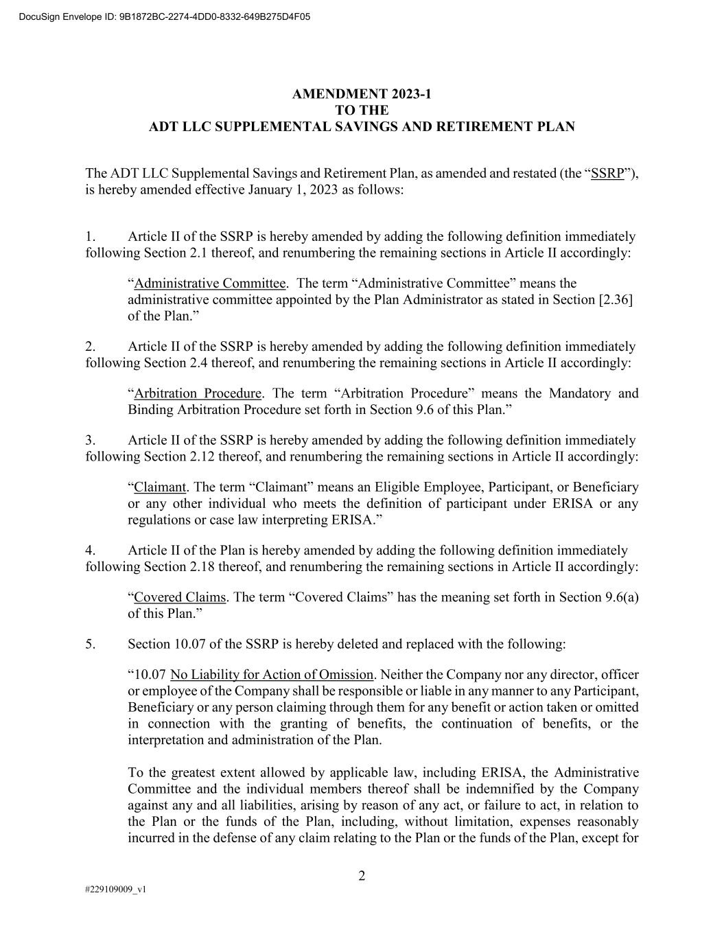 2 #229109009_v1 AMENDMENT 2023-1 TO THE ADT LLC SUPPLEMENTAL SAVINGS AND RETIREMENT PLAN The SSRP is hereby amended effective January 1, 2023 as follows: 1. Article II of the SSRP is hereby amended by adding the following definition immediately following Section 2.1 thereof, and renumbering the remaining sections in Article II accordingly: Administrative Committee administrative committee appointed by the Plan Administrator as stated in Section [2.36] 2. Article II of the SSRP is hereby amended by adding the following definition immediately following Section 2.4 thereof, and renumbering the remaining sections in Article II accordingly: Arbitration Procedure and Binding Arbitration Procedure set forth in Section 9.6 3. Article II of the SSRP is hereby amended by adding the following definition immediately following Section 2.12 thereof, and renumbering the remaining sections in Article II accordingly: Claimant an Eligible Employee, Participant, or Beneficiary or any other individual who meets the definition of participant under ERISA or any regulations or case law interpreting ERISA 4. Article II of the Plan is hereby amended by adding the following definition immediately following Section 2.18 thereof, and renumbering the remaining sections in Article II accordingly: Covered Claims has the meaning set forth in Section 9.6(a) of this Plan 5. Section 10.07 of the SSRP is hereby deleted and replaced with the following: 10.07 No Liability for Action of Omission. Neither the Company nor any director, officer or employee of the Company shall be responsible or liable in any manner to any Participant, Beneficiary or any person claiming through them for any benefit or action taken or omitted in connection with the granting of benefits, the continuation of benefits, or the interpretation and administration of the Plan. To the greatest extent allowed by applicable law, including ERISA, the Administrative Committee and the individual members thereof shall be indemnified by the Company against any and all liabilities, arising by reason of any act, or failure to act, in relation to the Plan or the funds of the Plan, including, without limitation, expenses reasonably incurred in the defense of any claim relating to the Plan or the funds of the Plan, except for DocuSign Envelope ID: 9B1872BC-2274-4DD0-8332-649B275D4F05