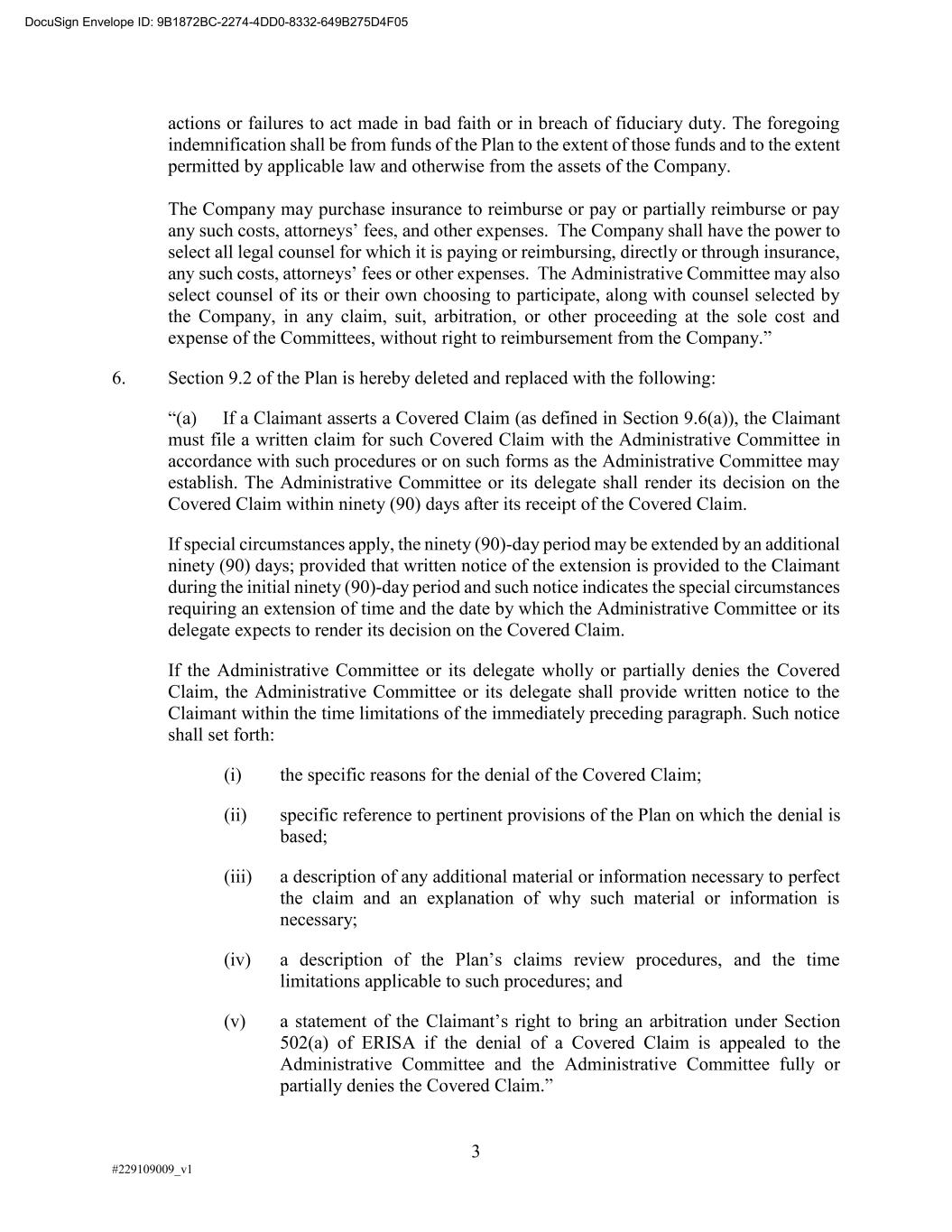 3 #229109009_v1 actions or failures to act made in bad faith or in breach of fiduciary duty. The foregoing indemnification shall be from funds of the Plan to the extent of those funds and to the extent permitted by applicable law and otherwise from the assets of the Company. The Company may purchase insurance to reimburse or pay or partially reimburse or pay any suc Company shall have the power to select all legal counsel for which it is paying or reimbursing, directly or through insurance, Administrative Committee may also select counsel of its or their own choosing to participate, along with counsel selected by the Company, in any claim, suit, arbitration, or other proceeding at the sole cost and expense of the Committees, without right to reimbursement from the Company 6. Section 9.2 of the Plan is hereby deleted and replaced with the following: Covered Claim (as defined in Section 9.6(a)), the Claimant must file a written claim for such Covered Claim with the Administrative Committee in accordance with such procedures or on such forms as the Administrative Committee may establish. The Administrative Committee or its delegate shall render its decision on the Covered Claim within ninety (90) days after its receipt of the Covered Claim. If special circumstances apply, the ninety (90)-day period may be extended by an additional ninety (90) days; provided that written notice of the extension is provided to the Claimant during the initial ninety (90)-day period and such notice indicates the special circumstances requiring an extension of time and the date by which the Administrative Committee or its delegate expects to render its decision on the Covered Claim. If the Administrative Committee or its delegate wholly or partially denies the Covered Claim, the Administrative Committee or its delegate shall provide written notice to the Claimant within the time limitations of the immediately preceding paragraph. Such notice shall set forth: (i) the specific reasons for the denial of the Covered Claim; (ii) specific reference to pertinent provisions of the Plan on which the denial is based; (iii) a description of any additional material or information necessary to perfect the claim and an explanation of why such material or information is necessary; (iv) a s claims review procedures, and the time limitations applicable to such procedures; and (v) a statement o under Section 502(a) of ERISA if the denial of a Covered Claim is appealed to the Administrative Committee and the Administrative Committee fully or partially denies the DocuSign Envelope ID: 9B1872BC-2274-4DD0-8332-649B275D4F05