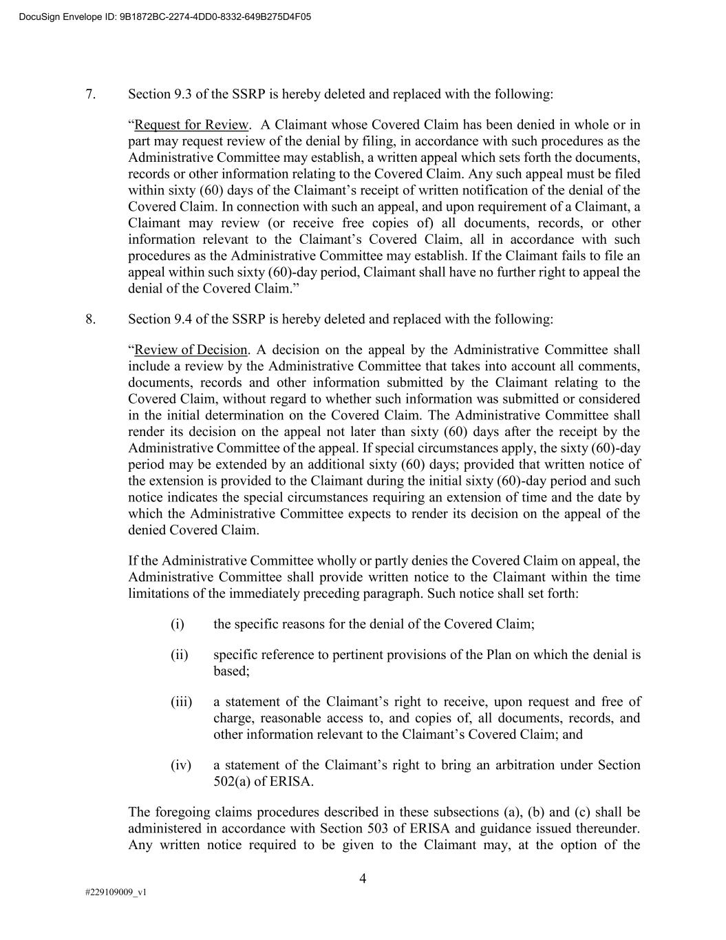 4 #229109009_v1 7. Section 9.3 of the SSRP is hereby deleted and replaced with the following: Request for Review. A Claimant whose Covered Claim has been denied in whole or in part may request review of the denial by filing, in accordance with such procedures as the Administrative Committee may establish, a written appeal which sets forth the documents, records or other information relating to the Covered Claim. Any such appeal must be filed Covered Claim. In connection with such an appeal, and upon requirement of a Claimant, a Claimant may review (or receive free copies of) all documents, records, or other procedures as the Administrative Committee may establish. If the Claimant fails to file an appeal within such sixty (60)-day period, Claimant shall have no further right to appeal the 8. Section 9.4 of the SSRP is hereby deleted and replaced with the following: Review of Decision. A decision on the appeal by the Administrative Committee shall include a review by the Administrative Committee that takes into account all comments, documents, records and other information submitted by the Claimant relating to the Covered Claim, without regard to whether such information was submitted or considered in the initial determination on the Covered Claim. The Administrative Committee shall render its decision on the appeal not later than sixty (60) days after the receipt by the Administrative Committee of the appeal. If special circumstances apply, the sixty (60)-day period may be extended by an additional sixty (60) days; provided that written notice of the extension is provided to the Claimant during the initial sixty (60)-day period and such notice indicates the special circumstances requiring an extension of time and the date by which the Administrative Committee expects to render its decision on the appeal of the denied Covered Claim. If the Administrative Committee wholly or partly denies the Covered Claim on appeal, the Administrative Committee shall provide written notice to the Claimant within the time limitations of the immediately preceding paragraph. Such notice shall set forth: (i) the specific reasons for the denial of the Covered Claim; (ii) specific reference to pertinent provisions of the Plan on which the denial is based; (iii) a statement o receive, upon request and free of charge, reasonable access to, and copies of, all documents, records, and other information r s Covered Claim; and (iv) arbitration under Section 502(a) of ERISA. The foregoing claims procedures described in these subsections (a), (b) and (c) shall be administered in accordance with Section 503 of ERISA and guidance issued thereunder. Any written notice required to be given to the Claimant may, at the option of the DocuSign Envelope ID: 9B1872BC-2274-4DD0-8332-649B275D4F05