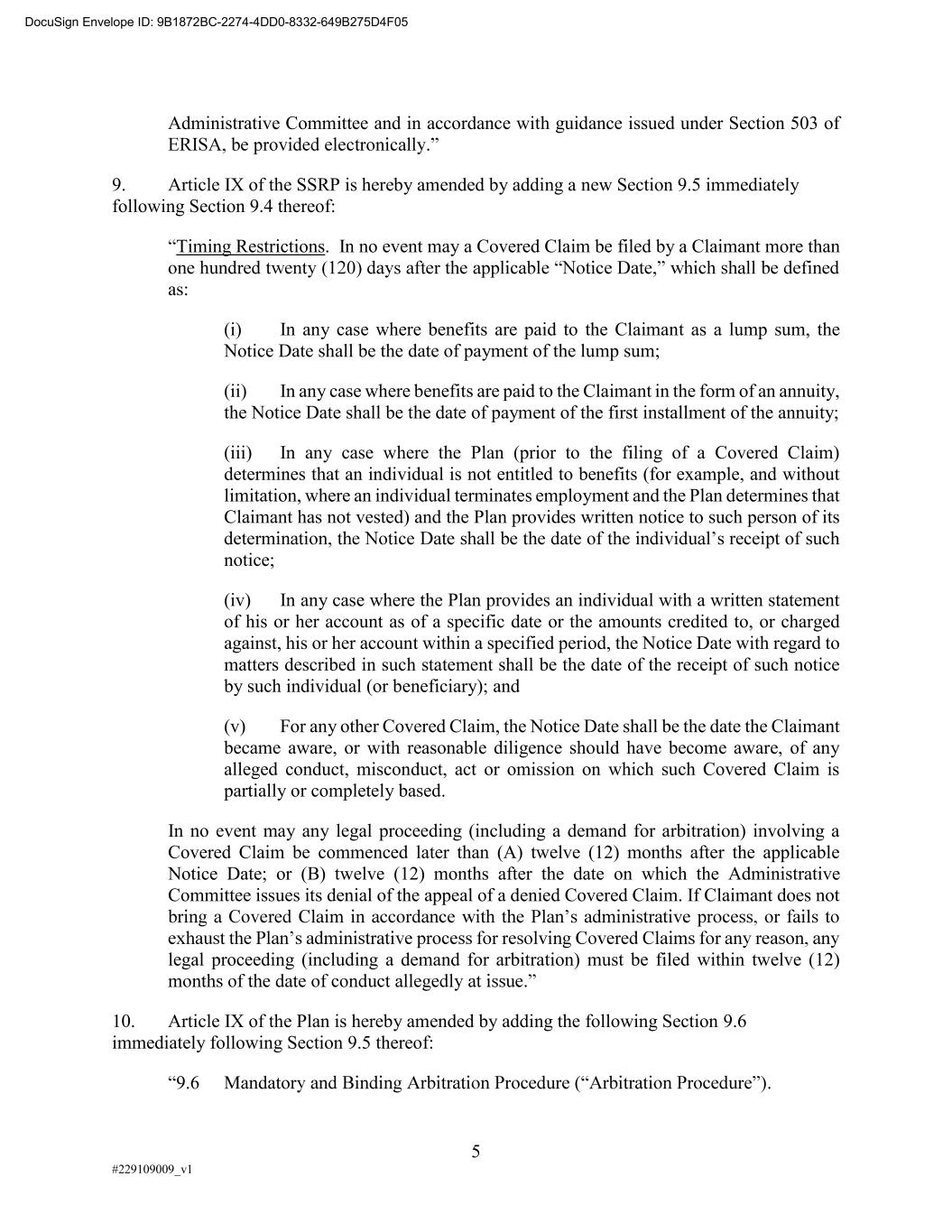 5 #229109009_v1 Administrative Committee and in accordance with guidance issued under Section 503 of 9. Article IX of the SSRP is hereby amended by adding a new Section 9.5 immediately following Section 9.4 thereof: Timing Restrictions. In no event may a Covered Claim be filed by a Claimant more than as: (i) In any case where benefits are paid to the Claimant as a lump sum, the Notice Date shall be the date of payment of the lump sum; (ii) In any case where benefits are paid to the Claimant in the form of an annuity, the Notice Date shall be the date of payment of the first installment of the annuity; (iii) In any case where the Plan (prior to the filing of a Covered Claim) determines that an individual is not entitled to benefits (for example, and without limitation, where an individual terminates employment and the Plan determines that Claimant has not vested) and the Plan provides written notice to such person of its notice; (iv) In any case where the Plan provides an individual with a written statement of his or her account as of a specific date or the amounts credited to, or charged against, his or her account within a specified period, the Notice Date with regard to matters described in such statement shall be the date of the receipt of such notice by such individual (or beneficiary); and (v) For any other Covered Claim, the Notice Date shall be the date the Claimant became aware, or with reasonable diligence should have become aware, of any alleged conduct, misconduct, act or omission on which such Covered Claim is partially or completely based. In no event may any legal proceeding (including a demand for arbitration) involving a Covered Claim be commenced later than (A) twelve (12) months after the applicable Notice Date; or (B) twelve (12) months after the date on which the Administrative Committee issues its denial of the appeal of a denied Covered Claim. If Claimant does not legal proceeding (including a demand for arbitration) must be filed within twelve (12) 10. Article IX of the Plan is hereby amended by adding the following Section 9.6 immediately following Section 9.5 thereof: 9.6 Mandato . DocuSign Envelope ID: 9B1872BC-2274-4DD0-8332-649B275D4F05