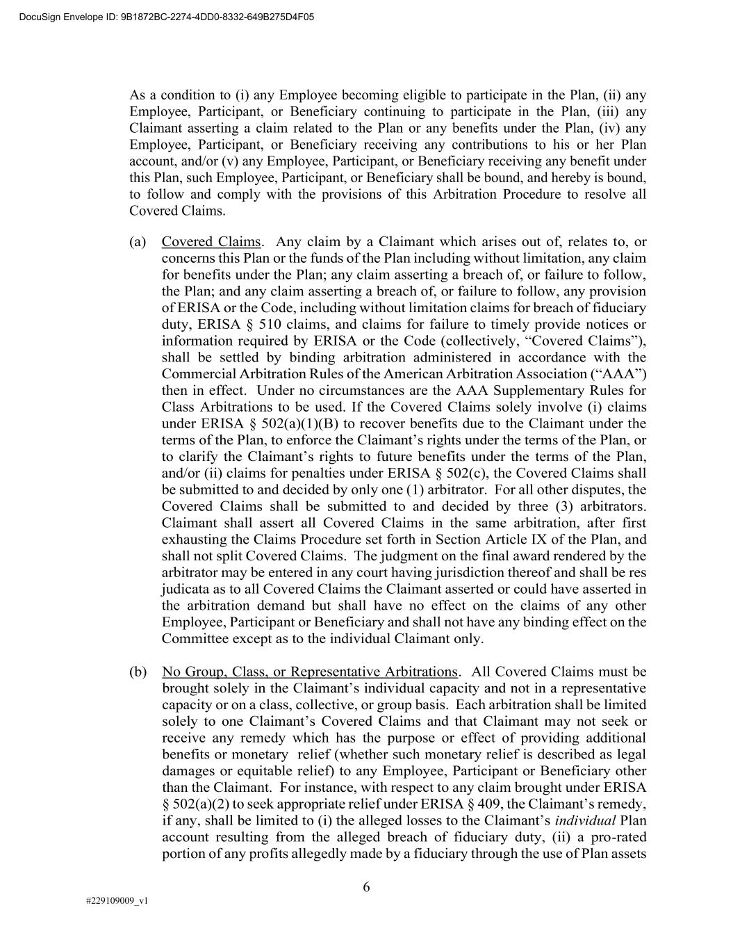 6 #229109009_v1 As a condition to (i) any Employee becoming eligible to participate in the Plan, (ii) any Employee, Participant, or Beneficiary continuing to participate in the Plan, (iii) any Claimant asserting a claim related to the Plan or any benefits under the Plan, (iv) any Employee, Participant, or Beneficiary receiving any contributions to his or her Plan account, and/or (v) any Employee, Participant, or Beneficiary receiving any benefit under this Plan, such Employee, Participant, or Beneficiary shall be bound, and hereby is bound, to follow and comply with the provisions of this Arbitration Procedure to resolve all Covered Claims. (a) Covered Claims. Any claim by a Claimant which arises out of, relates to, or concerns this Plan or the funds of the Plan including without limitation, any claim for benefits under the Plan; any claim asserting a breach of, or failure to follow, the Plan; and any claim asserting a breach of, or failure to follow, any provision of ERISA or the Code, including without limitation claims for breach of fiduciary duty, ERISA § 510 claims, and claims for failure to timely provide notices or shall be settled by binding arbitration administered in accordance with the then in effect. Under no circumstances are the AAA Supplementary Rules for Class Arbitrations to be used. If the Covered Claims solely involve (i) claims under ERISA § 502(a)(1)(B) to recover benefits due to the Claimant under the terms of the Plan, and/or (ii) claims for penalties under ERISA § 502(c), the Covered Claims shall be submitted to and decided by only one (1) arbitrator. For all other disputes, the Covered Claims shall be submitted to and decided by three (3) arbitrators. Claimant shall assert all Covered Claims in the same arbitration, after first exhausting the Claims Procedure set forth in Section Article IX of the Plan, and shall not split Covered Claims. The judgment on the final award rendered by the arbitrator may be entered in any court having jurisdiction thereof and shall be res judicata as to all Covered Claims the Claimant asserted or could have asserted in the arbitration demand but shall have no effect on the claims of any other Employee, Participant or Beneficiary and shall not have any binding effect on the Committee except as to the individual Claimant only. (b) No Group, Class, or Representative Arbitrations. All Covered Claims must be capacity or on a class, collective, or group basis. Each arbitration shall be limited ay not seek or receive any remedy which has the purpose or effect of providing additional benefits or monetary relief (whether such monetary relief is described as legal damages or equitable relief) to any Employee, Participant or Beneficiary other than the Claimant. For instance, with respect to any claim brought under ERISA § 502(a)(2) individual Plan account resulting from the alleged breach of fiduciary duty, (ii) a pro-rated portion of any profits allegedly made by a fiduciary through the use of Plan assets DocuSign Envelope ID: 9B1872BC-2274-4DD0-8332-649B275D4F05