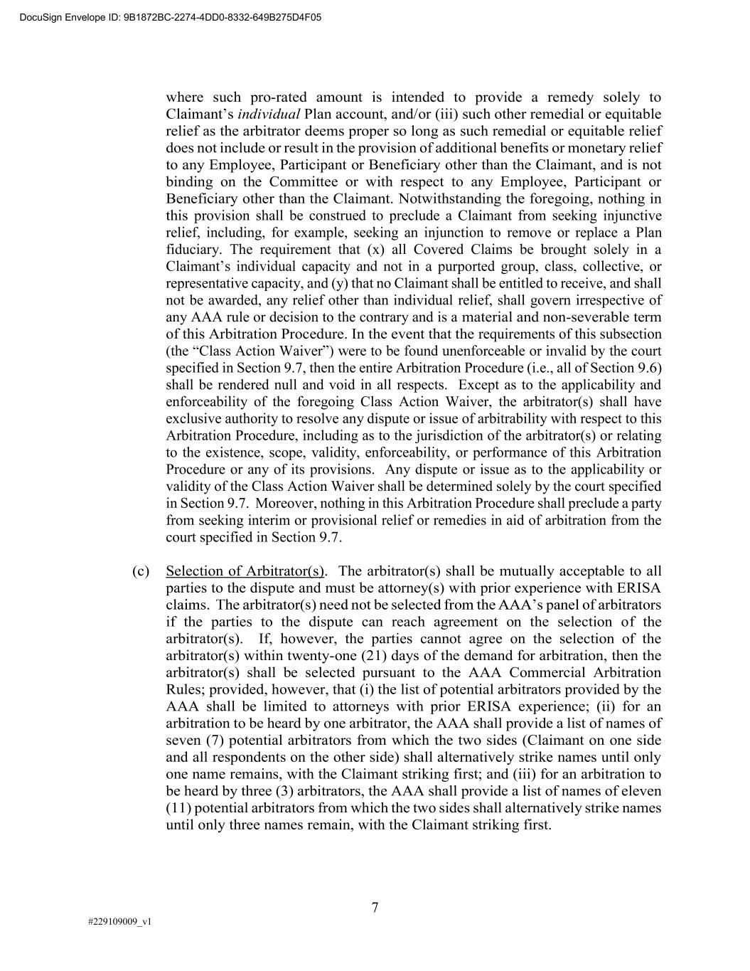 7 #229109009_v1 where such pro-rated amount is intended to provide a remedy solely to individual Plan account, and/or (iii) such other remedial or equitable relief as the arbitrator deems proper so long as such remedial or equitable relief does not include or result in the provision of additional benefits or monetary relief to any Employee, Participant or Beneficiary other than the Claimant, and is not binding on the Committee or with respect to any Employee, Participant or Beneficiary other than the Claimant. Notwithstanding the foregoing, nothing in this provision shall be construed to preclude a Claimant from seeking injunctive relief, including, for example, seeking an injunction to remove or replace a Plan fiduciary. The requirement that (x) all Covered Claims be brought solely in a representative capacity, and (y) that no Claimant shall be entitled to receive, and shall not be awarded, any relief other than individual relief, shall govern irrespective of any AAA rule or decision to the contrary and is a material and non-severable term of this Arbitration Procedure. In the event that the requirements of this subsection Class Action Waiver specified in Section 9.7, then the entire Arbitration Procedure (i.e., all of Section 9.6) shall be rendered null and void in all respects. Except as to the applicability and enforceability of the foregoing Class Action Waiver, the arbitrator(s) shall have exclusive authority to resolve any dispute or issue of arbitrability with respect to this Arbitration Procedure, including as to the jurisdiction of the arbitrator(s) or relating to the existence, scope, validity, enforceability, or performance of this Arbitration Procedure or any of its provisions. Any dispute or issue as to the applicability or validity of the Class Action Waiver shall be determined solely by the court specified in Section 9.7. Moreover, nothing in this Arbitration Procedure shall preclude a party from seeking interim or provisional relief or remedies in aid of arbitration from the court specified in Section 9.7. (c) Selection of Arbitrator(s). The arbitrator(s) shall be mutually acceptable to all parties to the dispute and must be attorney(s) with prior experience with ERISA if the parties to the dispute can reach agreement on the selection of the arbitrator(s). If, however, the parties cannot agree on the selection of the arbitrator(s) within twenty-one (21) days of the demand for arbitration, then the arbitrator(s) shall be selected pursuant to the AAA Commercial Arbitration Rules; provided, however, that (i) the list of potential arbitrators provided by the AAA shall be limited to attorneys with prior ERISA experience; (ii) for an arbitration to be heard by one arbitrator, the AAA shall provide a list of names of seven (7) potential arbitrators from which the two sides (Claimant on one side and all respondents on the other side) shall alternatively strike names until only one name remains, with the Claimant striking first; and (iii) for an arbitration to be heard by three (3) arbitrators, the AAA shall provide a list of names of eleven (11) potential arbitrators from which the two sides shall alternatively strike names until only three names remain, with the Claimant striking first. DocuSign Envelope ID: 9B1872BC-2274-4DD0-8332-649B275D4F05