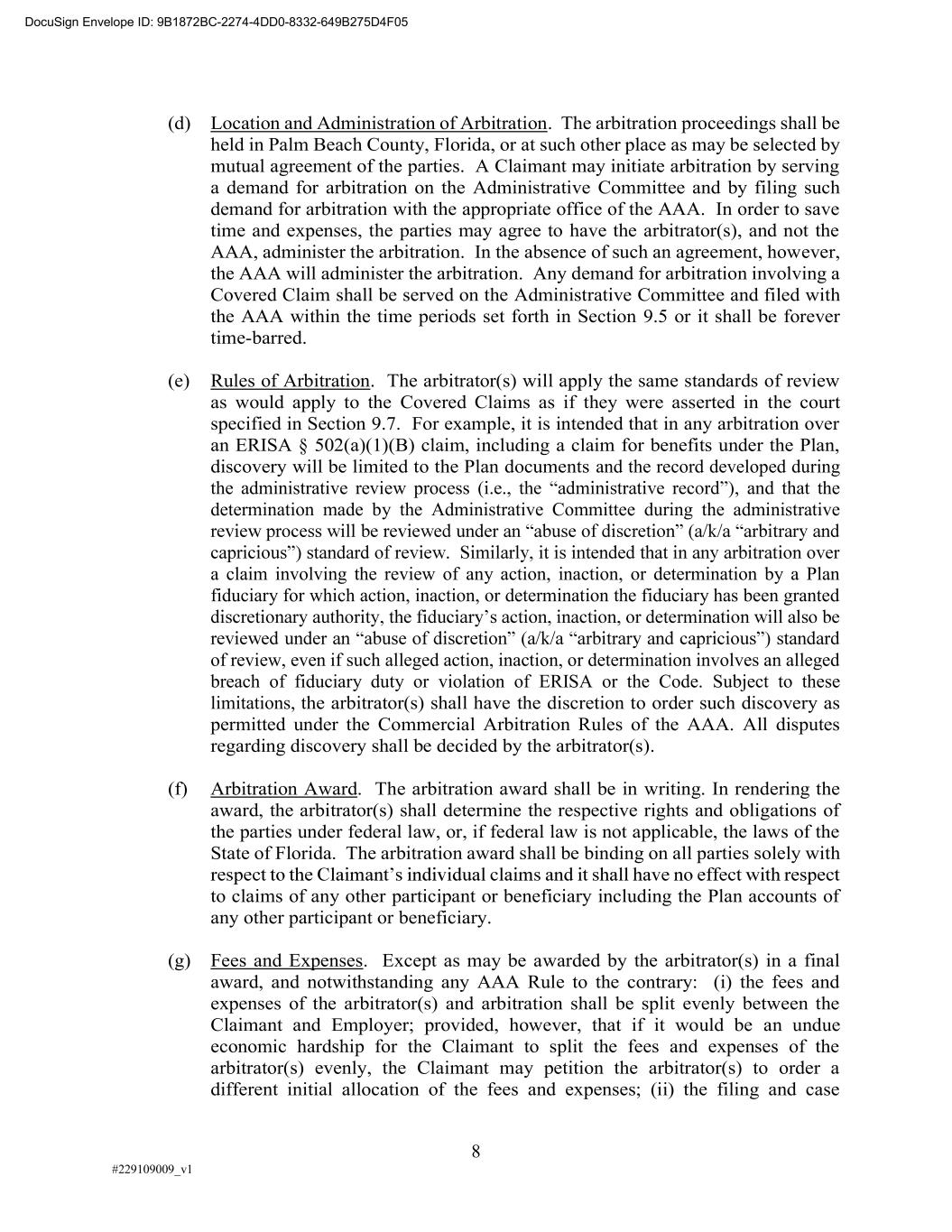 8 #229109009_v1 (d) Location and Administration of Arbitration. The arbitration proceedings shall be held in Palm Beach County, Florida, or at such other place as may be selected by mutual agreement of the parties. A Claimant may initiate arbitration by serving a demand for arbitration on the Administrative Committee and by filing such demand for arbitration with the appropriate office of the AAA. In order to save time and expenses, the parties may agree to have the arbitrator(s), and not the AAA, administer the arbitration. In the absence of such an agreement, however, the AAA will administer the arbitration. Any demand for arbitration involving a Covered Claim shall be served on the Administrative Committee and filed with the AAA within the time periods set forth in Section 9.5 or it shall be forever time-barred. (e) Rules of Arbitration. The arbitrator(s) will apply the same standards of review as would apply to the Covered Claims as if they were asserted in the court specified in Section 9.7. For example, it is intended that in any arbitration over an ERISA § 502(a)(1)(B) claim, including a claim for benefits under the Plan, discovery will be limited to the Plan documents and the record developed during the administrative review process , and that the determination made by the Administrative Committee during the administrative a claim involving the review of any action, inaction, or determination by a Plan fiduciary for which action, inaction, or determination the fiduciary has been granted of review, even if such alleged action, inaction, or determination involves an alleged breach of fiduciary duty or violation of ERISA or the Code. Subject to these limitations, the arbitrator(s) shall have the discretion to order such discovery as permitted under the Commercial Arbitration Rules of the AAA. All disputes regarding discovery shall be decided by the arbitrator(s). (f) Arbitration Award. The arbitration award shall be in writing. In rendering the award, the arbitrator(s) shall determine the respective rights and obligations of the parties under federal law, or, if federal law is not applicable, the laws of the State of Florida. The arbitration award shall be binding on all parties solely with to claims of any other participant or beneficiary including the Plan accounts of any other participant or beneficiary. (g) Fees and Expenses. Except as may be awarded by the arbitrator(s) in a final award, and notwithstanding any AAA Rule to the contrary: (i) the fees and expenses of the arbitrator(s) and arbitration shall be split evenly between the Claimant and Employer; provided, however, that if it would be an undue economic hardship for the Claimant to split the fees and expenses of the arbitrator(s) evenly, the Claimant may petition the arbitrator(s) to order a different initial allocation of the fees and expenses; (ii) the filing and case DocuSign Envelope ID: 9B1872BC-2274-4DD0-8332-649B275D4F05
