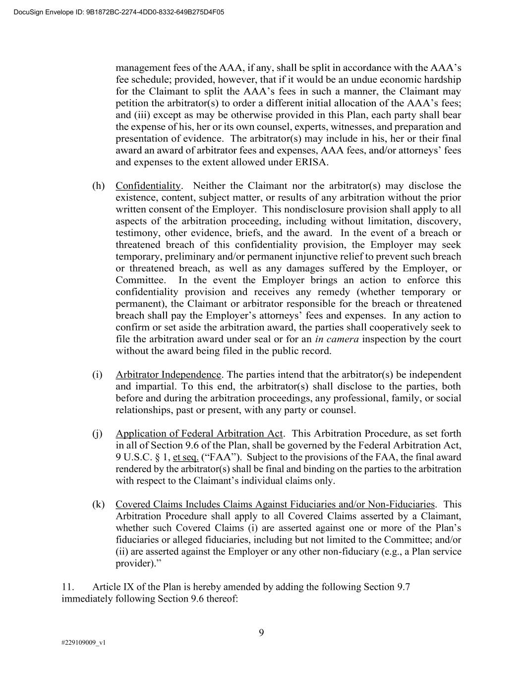 9 #229109009_v1 management fees o fee schedule; provided, however, that if it would be an undue economic hardship petition the arbitrator(s) to order a and (iii) except as may be otherwise provided in this Plan, each party shall bear the expense of his, her or its own counsel, experts, witnesses, and preparation and presentation of evidence. The arbitrator(s) may include in his, her or their final and expenses to the extent allowed under ERISA. (h) Confidentiality. Neither the Claimant nor the arbitrator(s) may disclose the existence, content, subject matter, or results of any arbitration without the prior written consent of the Employer. This nondisclosure provision shall apply to all aspects of the arbitration proceeding, including without limitation, discovery, testimony, other evidence, briefs, and the award. In the event of a breach or threatened breach of this confidentiality provision, the Employer may seek temporary, preliminary and/or permanent injunctive relief to prevent such breach or threatened breach, as well as any damages suffered by the Employer, or Committee. In the event the Employer brings an action to enforce this confidentiality provision and receives any remedy (whether temporary or permanent), the Claimant or arbitrator responsible for the breach or threatened confirm or set aside the arbitration award, the parties shall cooperatively seek to file the arbitration award under seal or for an in camera inspection by the court without the award being filed in the public record. (i) Arbitrator Independence. The parties intend that the arbitrator(s) be independent and impartial. To this end, the arbitrator(s) shall disclose to the parties, both before and during the arbitration proceedings, any professional, family, or social relationships, past or present, with any party or counsel. (j) Application of Federal Arbitration Act. This Arbitration Procedure, as set forth in all of Section 9.6 of the Plan, shall be governed by the Federal Arbitration Act, 9 U.S.C. § 1, et seq. . Subject to the provisions of the FAA, the final award rendered by the arbitrator(s) shall be final and binding on the parties to the arbitration (k) Covered Claims Includes Claims Against Fiduciaries and/or Non-Fiduciaries. This Arbitration Procedure shall apply to all Covered Claims asserted by a Claimant, fiduciaries or alleged fiduciaries, including but not limited to the Committee; and/or (ii) are asserted against the Employer or any other non-fiduciary (e.g., a Plan service provider). 11. Article IX of the Plan is hereby amended by adding the following Section 9.7 immediately following Section 9.6 thereof: DocuSign Envelope ID: 9B1872BC-2274-4DD0-8332-649B275D4F05