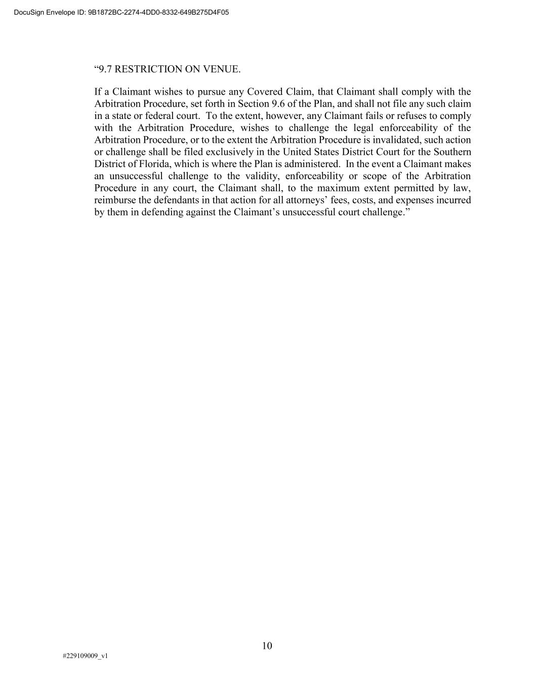 10 #229109009_v1 9.7 RESTRICTION ON VENUE. If a Claimant wishes to pursue any Covered Claim, that Claimant shall comply with the Arbitration Procedure, set forth in Section 9.6 of the Plan, and shall not file any such claim in a state or federal court. To the extent, however, any Claimant fails or refuses to comply with the Arbitration Procedure, wishes to challenge the legal enforceability of the Arbitration Procedure, or to the extent the Arbitration Procedure is invalidated, such action or challenge shall be filed exclusively in the United States District Court for the Southern District of Florida, which is where the Plan is administered. In the event a Claimant makes an unsuccessful challenge to the validity, enforceability or scope of the Arbitration Procedure in any court, the Claimant shall, to the maximum extent permitted by law, d DocuSign Envelope ID: 9B1872BC-2274-4DD0-8332-649B275D4F05