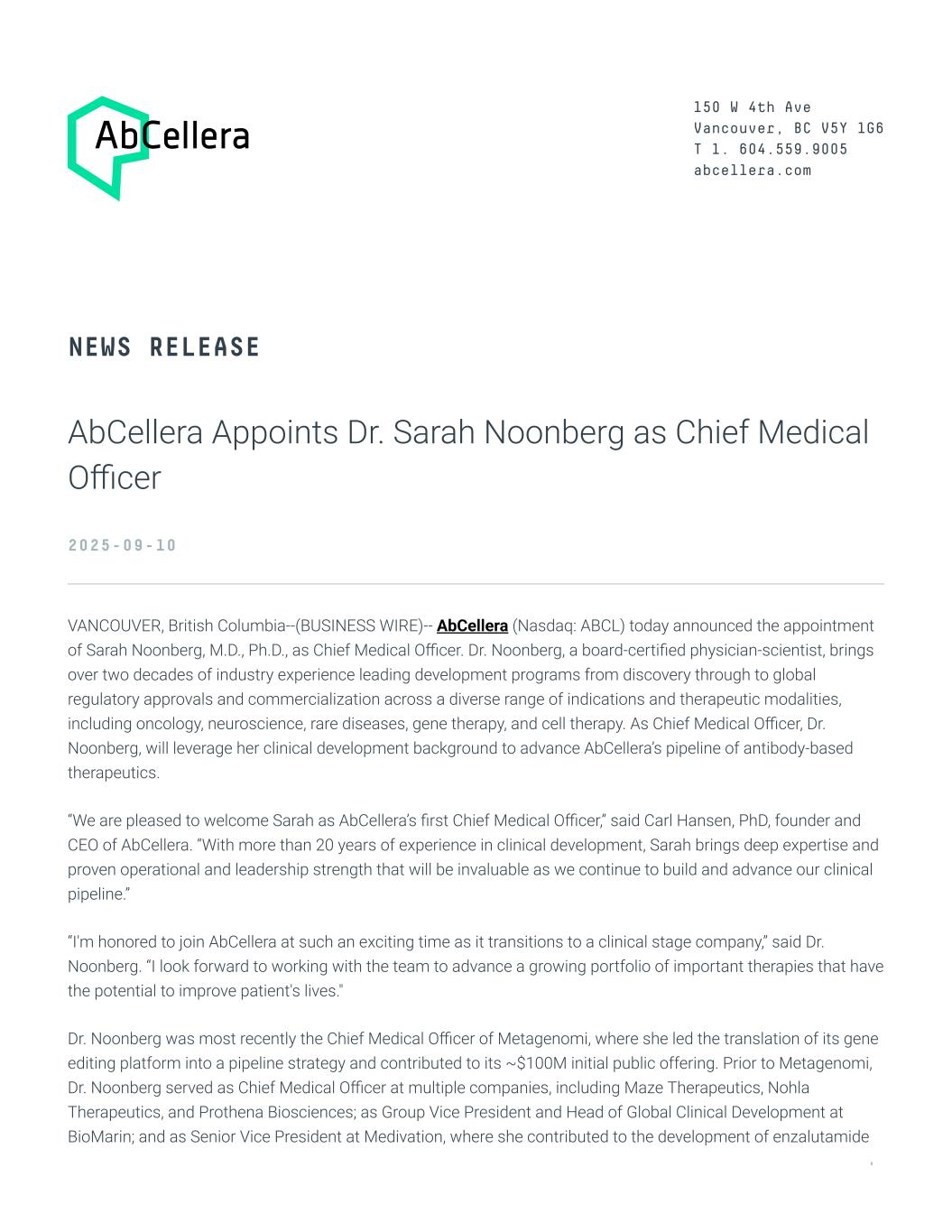 150 W 4th Ave Vancouver, BC V5Y 1G6 T 1. 604.559.9005 abcellera.com NEWS RELEASE AbCellera Appoints Dr. Sarah Noonberg as Chief Medical O�cer 2025-09-10 VANCOUVER, British Columbia--(BUSINESS WIRE)-- AbCellera (Nasdaq: ABCL) today announced the appointment of Sarah Noonberg, M.D., Ph.D., as Chief Medical O�cer. Dr. Noonberg, a board-certi�ed physician-scientist, brings over two decades of industry experience leading development programs from discovery through to global regulatory approvals and commercialization across a diverse range of indications and therapeutic modalities, including oncology, neuroscience, rare diseases, gene therapy, and cell therapy. As Chief Medical O�cer, Dr. Noonberg, will leverage her clinical development background to advance AbCellera’s pipeline of antibody-based therapeutics. “We are pleased to welcome Sarah as AbCellera’s �rst Chief Medical O�cer,” said Carl Hansen, PhD, founder and CEO of AbCellera. “With more than 20 years of experience in clinical development, Sarah brings deep expertise and proven operational and leadership strength that will be invaluable as we continue to build and advance our clinical pipeline.” “I'm honored to join AbCellera at such an exciting time as it transitions to a clinical stage company,” said Dr. Noonberg. “I look forward to working with the team to advance a growing portfolio of important therapies that have the potential to improve patient's lives." Dr. Noonberg was most recently the Chief Medical O�cer of Metagenomi, where she led the translation of its gene editing platform into a pipeline strategy and contributed to its ~$100M initial public offering. Prior to Metagenomi, Dr. Noonberg served as Chief Medical O�cer at multiple companies, including Maze Therapeutics, Nohla Therapeutics, and Prothena Biosciences; as Group Vice President and Head of Global Clinical Development at BioMarin; and as Senior Vice President at Medivation, where she contributed to the development of enzalutamide 1