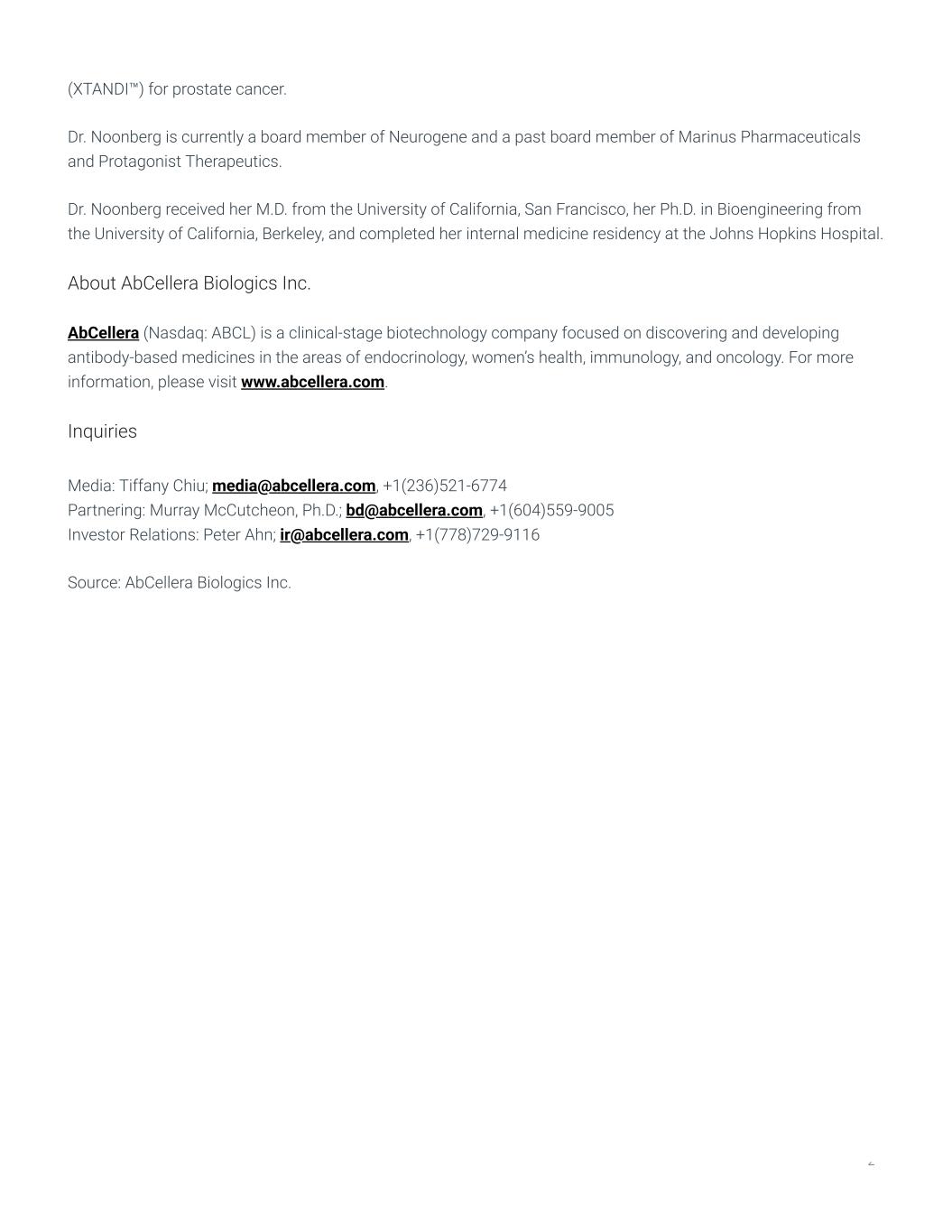 (XTANDI™) for prostate cancer. Dr. Noonberg is currently a board member of Neurogene and a past board member of Marinus Pharmaceuticals and Protagonist Therapeutics. Dr. Noonberg received her M.D. from the University of California, San Francisco, her Ph.D. in Bioengineering from the University of California, Berkeley, and completed her internal medicine residency at the Johns Hopkins Hospital. About AbCellera Biologics Inc. AbCellera (Nasdaq: ABCL) is a clinical-stage biotechnology company focused on discovering and developing antibody-based medicines in the areas of endocrinology, women’s health, immunology, and oncology. For more information, please visit www.abcellera.com. Inquiries Media: Tiffany Chiu; media@abcellera.com, +1(236)521-6774 Partnering: Murray McCutcheon, Ph.D.; bd@abcellera.com, +1(604)559-9005 Investor Relations: Peter Ahn; ir@abcellera.com, +1(778)729-9116 Source: AbCellera Biologics Inc. 2