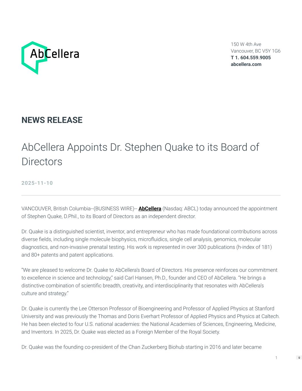 150 W 4th Ave Vancouver, BC V5Y 1G6 T 1. 604.559.9005 abcellera.com NEWS RELEASE AbCellera Appoints Dr. Stephen Quake to its Board of Directors 2025-11-10 VANCOUVER, British Columbia--(BUSINESS WIRE)-- AbCellera (Nasdaq: ABCL) today announced the appointment of Stephen Quake, D.Phil., to its Board of Directors as an independent director. Dr. Quake is a distinguished scientist, inventor, and entrepreneur who has made foundational contributions across diverse �elds, including single molecule biophysics, micro�uidics, single cell analysis, genomics, molecular diagnostics, and non-invasive prenatal testing. His work is represented in over 300 publications (h-index of 181) and 80+ patents and patent applications. “We are pleased to welcome Dr. Quake to AbCellera’s Board of Directors. His presence reinforces our commitment to excellence in science and technology,” said Carl Hansen, Ph.D., founder and CEO of AbCellera. “He brings a distinctive combination of scienti�c breadth, creativity, and interdisciplinarity that resonates with AbCellera’s culture and strategy.” Dr. Quake is currently the Lee Otterson Professor of Bioengineering and Professor of Applied Physics at Stanford University and was previously the Thomas and Doris Everhart Professor of Applied Physics and Physics at Caltech. He has been elected to four U.S. national academies: the National Academies of Sciences, Engineering, Medicine, and Inventors. In 2025, Dr. Quake was elected as a Foreign Member of the Royal Society. Dr. Quake was the founding co-president of the Chan Zuckerberg Biohub starting in 2016 and later became 1