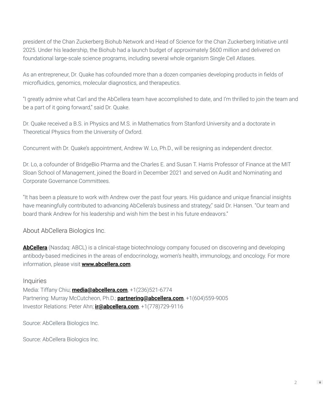 president of the Chan Zuckerberg Biohub Network and Head of Science for the Chan Zuckerberg Initiative until 2025. Under his leadership, the Biohub had a launch budget of approximately $600 million and delivered on foundational large-scale science programs, including several whole organism Single Cell Atlases. As an entrepreneur, Dr. Quake has cofounded more than a dozen companies developing products in �elds of micro�uidics, genomics, molecular diagnostics, and therapeutics. “I greatly admire what Carl and the AbCellera team have accomplished to date, and I’m thrilled to join the team and be a part of it going forward,” said Dr. Quake. Dr. Quake received a B.S. in Physics and M.S. in Mathematics from Stanford University and a doctorate in Theoretical Physics from the University of Oxford. Concurrent with Dr. Quake’s appointment, Andrew W. Lo, Ph.D., will be resigning as independent director. Dr. Lo, a cofounder of BridgeBio Pharma and the Charles E. and Susan T. Harris Professor of Finance at the MIT Sloan School of Management, joined the Board in December 2021 and served on Audit and Nominating and Corporate Governance Committees. “It has been a pleasure to work with Andrew over the past four years. His guidance and unique �nancial insights have meaningfully contributed to advancing AbCellera’s business and strategy,” said Dr. Hansen. “Our team and board thank Andrew for his leadership and wish him the best in his future endeavors.” About AbCellera Biologics Inc. AbCellera (Nasdaq: ABCL) is a clinical-stage biotechnology company focused on discovering and developing antibody-based medicines in the areas of endocrinology, women’s health, immunology, and oncology. For more information, please visit www.abcellera.com. Inquiries Media: Tiffany Chiu; media@abcellera.com, +1(236)521-6774 Partnering: Murray McCutcheon, Ph.D.; partnering@abcellera.com, +1(604)559-9005 Investor Relations: Peter Ahn; ir@abcellera.com, +1(778)729-9116 Source: AbCellera Biologics Inc. Source: AbCellera Biologics Inc. 2