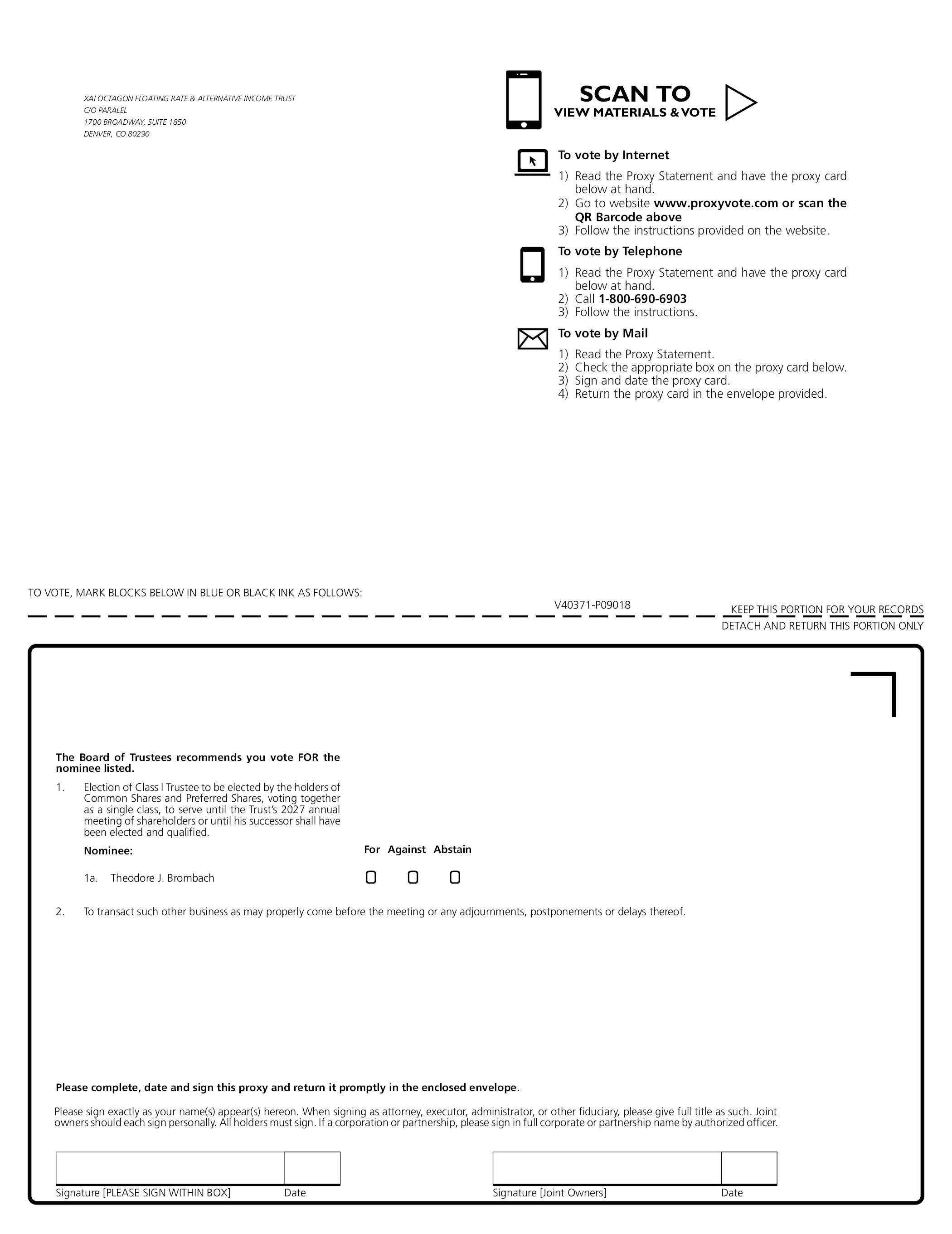 XAI OCTAGON FLOATING RATE & ALTERNATIVE INCOME TRUST C/O PARALEL 1700 BROADWAY, SUITE 1850 DENVER, CO 80290 SCAN TO VIEW MATERIALS & VOTE To vote by Internet 1) Read the Proxy Statement and have the proxy card below at hand. 2) Go to website www.proxyvote.com or scan the QR Barcode above 3) Follow the instructions provided on the website. To vote by Telephone 1) Read the Proxy Statement and have the proxy card below at hand. 2) Call 1-800-690-6903 3) Follow the instructions. To vote by Mail 1) Read the Proxy Statement. 2) Check the appropriate box on the proxy card below. 3) Sign and date the proxy card. 4) Return the proxy card in the envelope provided. TO VOTE, MARK BLOCKS BELOW IN BLUE OR BLACK INK AS FOLLOWS: V40371-P09018 KEEP THIS PORTION FOR YOUR RECORDS DETACH AND RETURN THIS PORTION ONLY The Board of Trustees recommends you vote FOR the nominee listed. 1. Election of Class I Trustee to be elected by the holders of Common Shares and Preferred Shares, voting together as a single class, to serve until the Trust’s 2027 annual meeting of shareholders or until his successor shall have been elected and qualified. Nominee: 1a. Theodore J. Brombach For Against Abstain 2. To transact such other business as may properly come before the meeting or any adjournments, postponements or delays thereof. Please complete, date and sign this proxy and return it promptly in the enclosed envelope. Please sign exactly as your name(s) appear(s) hereon. When signing as attorney, executor, administrator, or other fiduciary, please give full title as such. Joint owners should each sign personally. All holders must sign. If a corporation or partnership, please sign in full corporate or partnership name by authorized officer. Signature [PLEASE SIGN WITHIN BOX] Date Signature [Joint Owners] Date