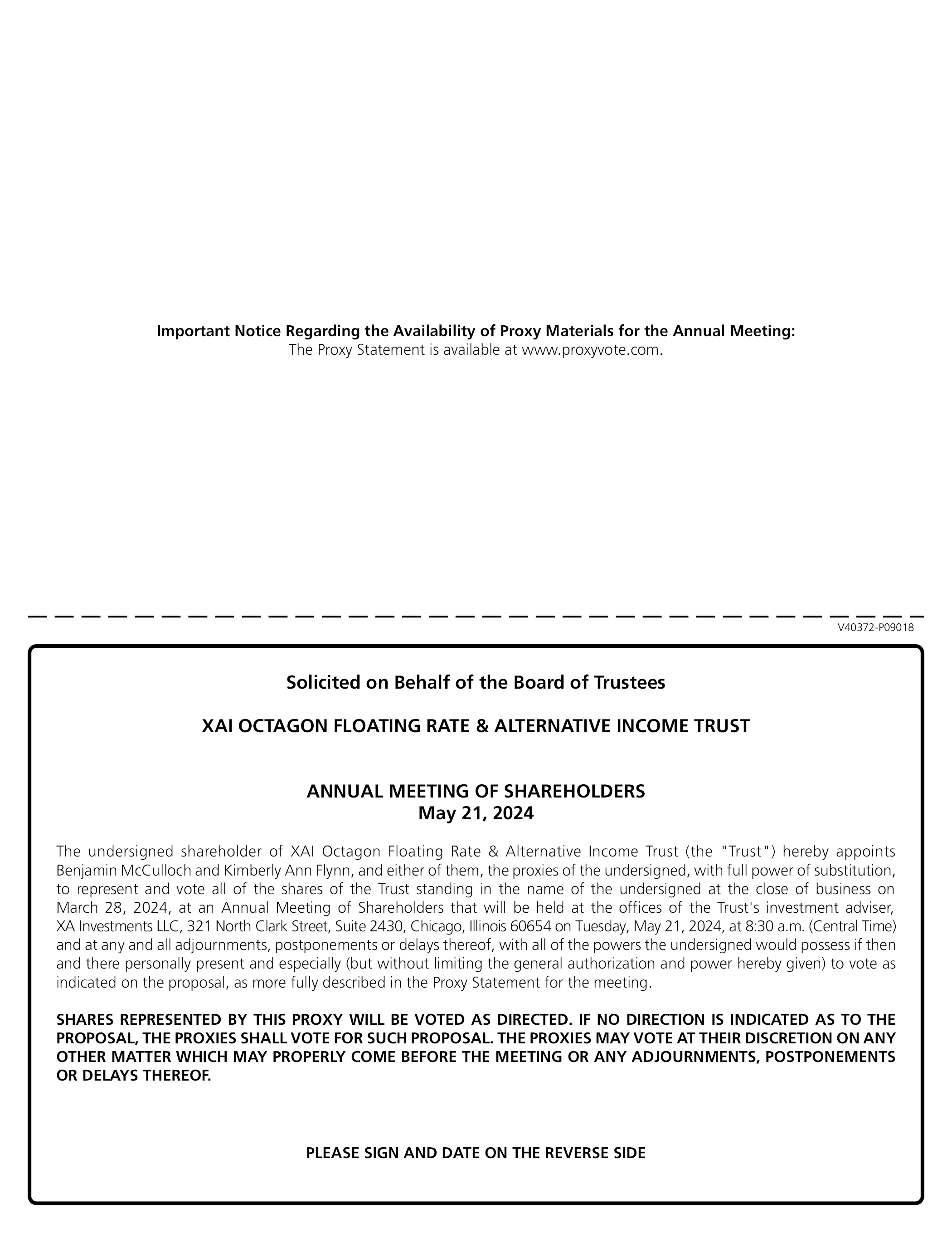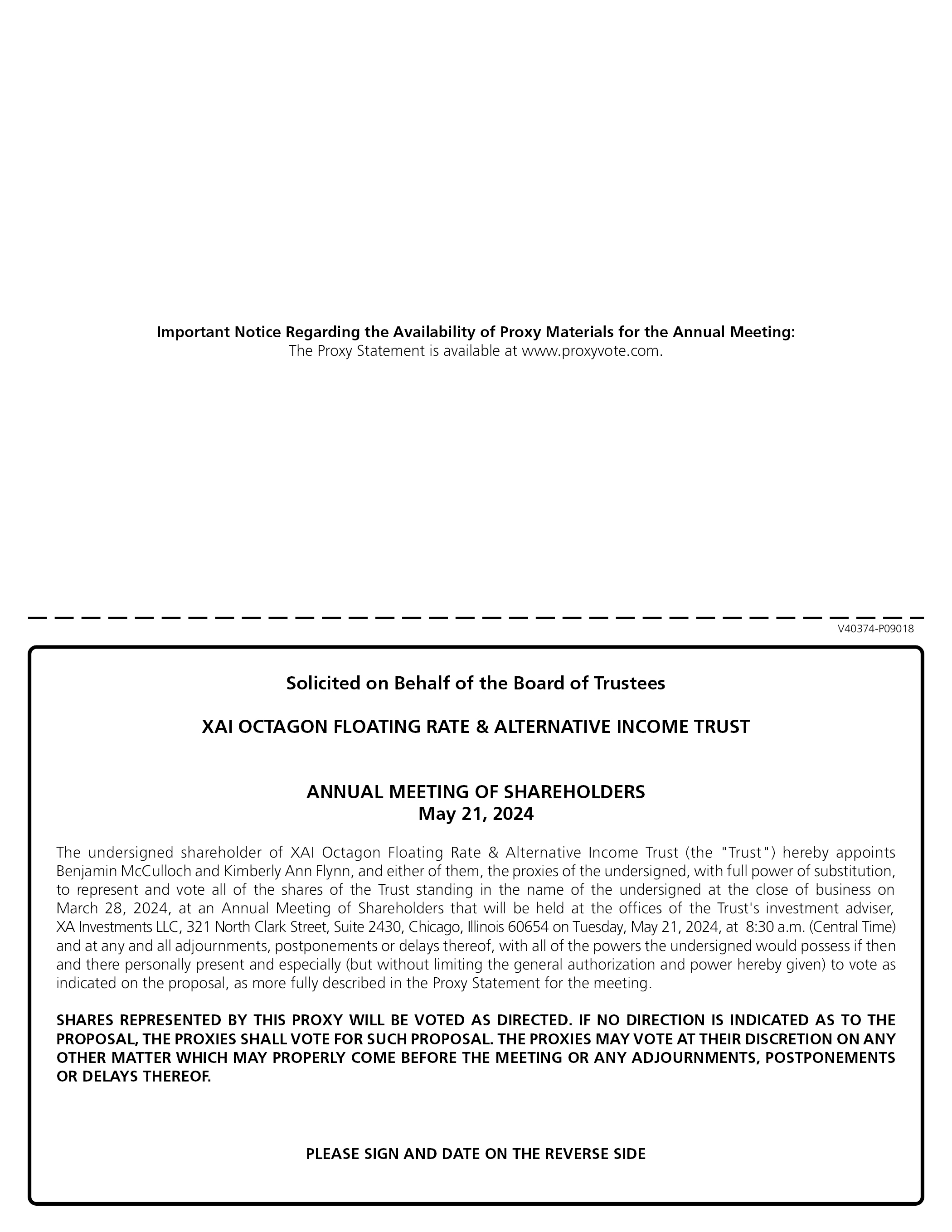 Important Notice Regarding the Availability of Proxy Materials for the Annual Meeting: The Proxy Statement is available at www.proxyvote.com. V40372-P09018 Solicited on Behalf of the Board of Trustees XAI OCTAGON FLOATING RATE & ALTERNATIVE INCOME TRUST ANNUAL MEETING OF SHAREHOLDERS May 21, 2024 The undersigned shareholder of XAI Octagon Floating Rate & Alternative Income Trust (the “Trust”) hereby appoints Benjamin McCulloch and Kimberly Ann Flynn, and either of them, the proxies of the undersigned, with full power of substitution, to represent and vote all of the shares of the Trust standing in the name of the undersigned at the close of business on March 28, 2024, at an Annual Meeting of Shareholders that will be held at the offices of the Trust’s investment adviser, XA Investments LLC, 321 North Clark Street, Suite 2430, Chicago, Illinois 60654 on Tuesday, May 21, 2024, at 8:30 a.m. (Central Time)and at any and all adjournments, postponements or delays thereof, with all of the powers the undersigned would possess if then and there personally present and especially (but without limiting the general authorization and power hereby given) to vote as indicated on the proposal, as more fully described in the Proxy Statement for the meeting. SHARES REPRESENTED BY THIS PROXY WILL BE VOTED AS DIRECTED. IF NO DIRECTION IS INDICATED AS TO THE PROPOSAL, THE PROXIES SHALL VOTE FOR SUCH PROPOSAL. THE PROXIES MAY VOTE AT THEIR DISCRETION ON ANY OTHER MATTER WHICH MAY PROPERLY COME BEFORE THE MEETING OR ANY ADJOURNMENTS, POSTPONEMENTS OR DELAYS THEREOF. PLEASE SIGN AND DATE ON THE REVERSE SIDE