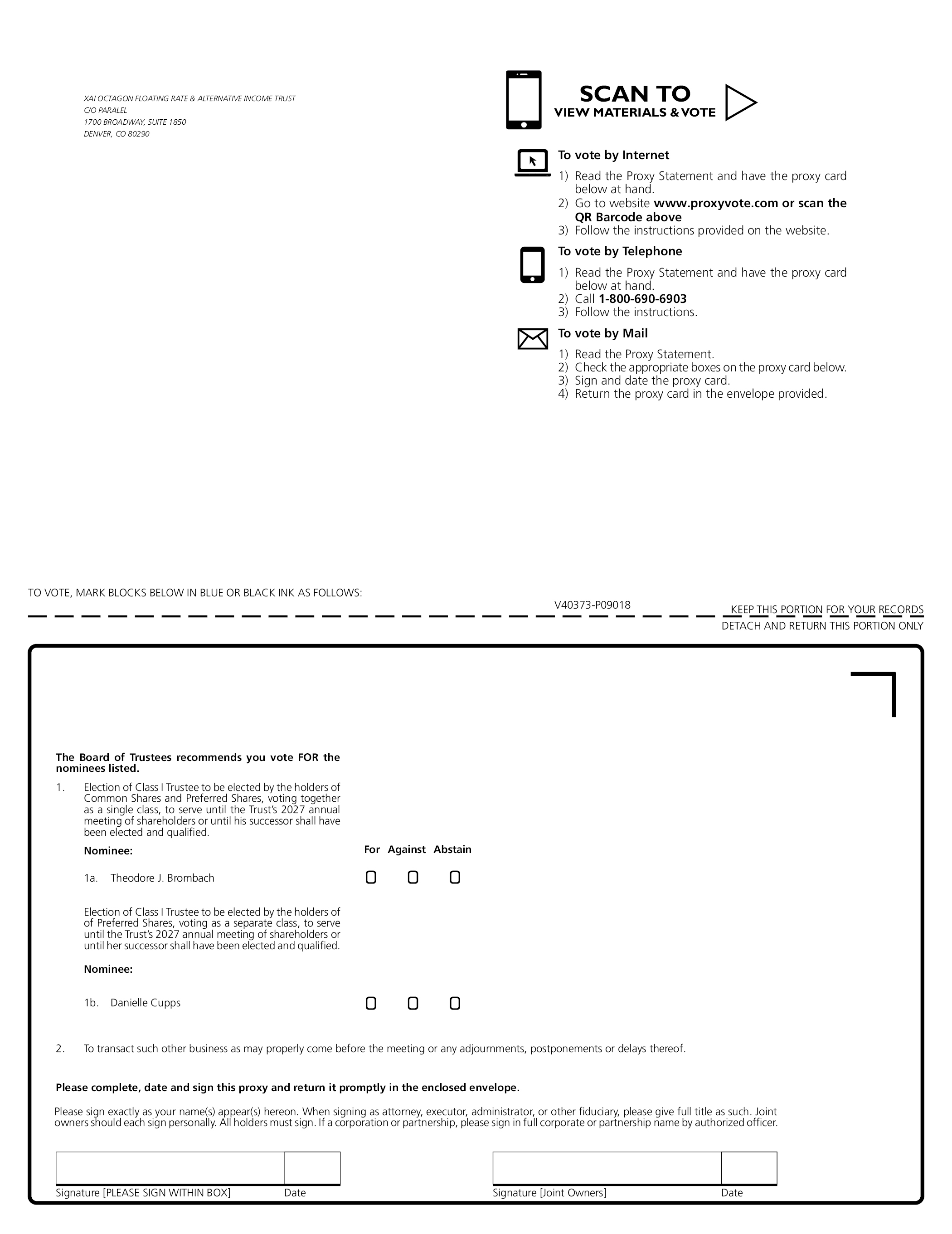 XAI OCTAGON FLOATING RATE & ALTERNATIVE INCOME TRUST C/O PARALEL 1700 BROADWAY, SUITE 1850 DENVER, CO 80290 SCAN TO VIEW MATERIALS & VOTE To vote by Internet 1) Read the Proxy Statement and have the proxy card below at hand. 2) Go to website www.proxyvote.com or scan the QR Barcode above 3) Follow the instructions provided on the website. To vote by Telephone 1) Read the Proxy Statement and have the proxy card below at hand. 2) Call 1-800-690-6903 3) Follow the instructions. To vote by Mail 1) Read the Proxy Statement. 2) Check the appropriate boxes on the proxy card below. 3) Sign and date the proxy card. 4) Return the proxy card in the envelope provided. TO VOTE, MARK BLOCKS BELOW IN BLUE OR BLACK INK AS FOLLOWS: V40373-P09018 KEEP THIS PORTION FOR YOUR RECORDS DETACH AND RETURN THIS PORTION ONLY The Board of Trustees recommends you vote FOR the nominees listed. 1. Election of Class I Trustee to be elected by the holders of Common Shares and Preferred Shares, voting together as a single class, to serve until the Trust’s 2027 annual meeting of shareholders or until his successor shall have been elected and qualified. Nominee: 1a. Theodore J. Brombach Election of Class I Trustee to be elected by the holders of of Preferred Shares, voting as a separate class, to serve until the Trust’s 2027 annual meeting of shareholders or until her successor shall have been elected and qualified. Nominee: 1b. Danielle Cupps 2. To transact such other business as may properly come before the meeting or any adjournments, postponements or delays thereof. Please complete, date and sign this proxy and return it promptly in the enclosed envelope. Please sign exactly as your name(s) appear(s) hereon. When signing as attorney, executor, administrator, or other fiduciary, please give full title as such. Joint owners should each sign personally. All holders must sign. If a corporation or partnership, please sign in full corporate or partnership name by authorized officer. Signature [PLEASE SIGN WITHIN BOX] Date Signature [Joint Owners] Date FOR Against Abstain