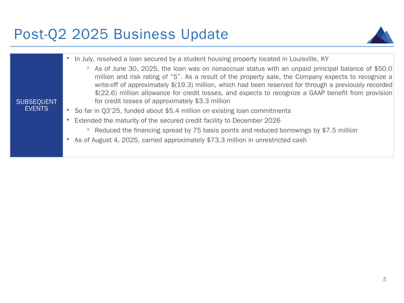 FINANCIAL SUMMARY ▪ GAAP Net (Loss) attributable to common stockholders of $(17.0) million, or $(0.35) per basic common share ▪ Distributable Earnings (Loss)(3) of $(45.3) million, or $(0.94) per basic common share ▪ Distributable Earnings (Loss) Before Realized Gains and Losses(3) of $(2.0) million, or $(0.04) per basic common share PORTFOLIO ACTIVITY ▪ Net loan portfolio activity of $(115.1) million in unpaid principal balance ◦ $(32.1) million full loan repayments and partial repayments of $(2.4) million ◦ Two resolutions of $(94.1) million, inclusive of write-offs $(36.1) million ◦ Fundings of $13.5 million ▪ Sold an REO property located in Phoenix, AZ, for a net sales price of $16.7 million, which resulted in a gain on sale of $0.3 million, or $0.01 per basic share PORTFOLIO OVERVIEW ▪ Loan portfolio of $1.9 billion(1) in total loan commitments across 47 loan investments ▪ Total CECL reserve of $155.1 million, or 8.1% of total loan portfolio commitments ▪ Weighted average loan portfolio risk rating of 2.8 ▪ Held two REO assets with an aggregate carrying value of $107.0 million(4) CAPITALIZATION & LIQUIDITY ▪ Extended the maturities of all repurchase facilities by one year ▪ Q2 2025 common stock repurchases ◦ 1.25 million shares at average price of $2.48 per share for total of $3.1 million ◦ Book value accretion of $0.15 per share ▪ Unrestricted cash of $85.1 million and Total Leverage Ratio of 2.1x ▪ No corporate debt maturities remaining Q2 2025 Summary Results 4