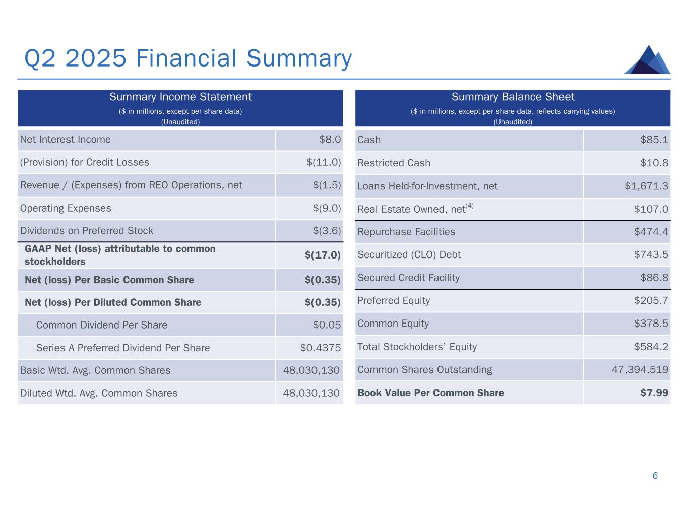 Quarterly Per Share Calculations 22 ($ in millions, except per share data) (unaudited) Q2 2024 Q3 2024 Q4 2024 Q1 2025 Q2 2025 GAAP Net (loss) income attributable to common stockholders $ (66.7) $ (34.6) $ (42.4) $ (10.6) $ (17.0) Adjustments: Provision (Benefit from) for Credit Losses $ 60.8 $ 27.9 $ 37.2 $ 3.8 $ 11.0 Non-Cash Equity Compensation $ 1.5 $ 2.5 $ 0.4 $ 2.4 $ 2.2 Depreciation and Amortization Expense on Real Estate Owned $ 1.2 $ 1.9 $ 1.9 $ 1.4 $ 2.1 (Gain)/Loss on Real Estate Owned $ — $ — $ — $ — $ (0.3) Loss on Extinguishment of Debt $ 0.8 $ — $ — $ — $ — Distributable Earnings (Loss) Before Realized Gains and Losses* $ (2.5) $ (2.2) $ (3.0) $ (3.0) $ (2.0) Write-offs $ (6.6) $ (44.6) $ (95.2) $ (24.6) $ (36.1) Recoveries of Previous Write-offs $ — $ 8.8 $ — $ — $ — Gain/(Loss) on Real Estate Owned $ — $ — $ — $ — $ 0.3 Accumulated Depreciation and Amortization on REO Sale $ — $ — $ — $ — $ (7.6) Distributable Earnings (Loss)* $ (9.1) $ (38.0) $ (98.2) $ (27.7) $ (45.3) Basic Wtd. Avg. Common Shares 50,939,476 50,526,492 49,492,595 48,668,667 48,030,130 Distributable Earnings (Loss) Before Realized Gains and Losses* per Basic Common Share $ (0.05) $ (0.04) $ (0.06) $ (0.06) $ (0.04) Distributable Earnings (Loss)* per Basic Common Share $ (0.18) $ (0.75) $ (1.98) $ (0.57) $ (0.94) * Distributable Earnings (Loss) Before Realized Gains and Losses and Distributable Earnings (Loss) are non-GAAP measures. See definitions in this appendix Due to rounding, figures may not result in the totals presented GAAP BOOK VALUE PER SHARE ($ in millions, except per share data) (unaudited) June 30, 2024 September 30, 2024 December 31, 2024 March 31, 2025 June 30, 2025 Total Equity $ 704.7 $ 667.9 $ 619.2 $ 604.8 $ 584.3 Series A Preferred Stock (liquidation preference $25.00 per share) $ 205.7 $ 205.7 $ 205.7 $ 205.7 $ 205.7 Non-controlling interest $ 0.1 $ 0.1 $ 0.1 $ 0.1 $ 0.1 Common Stockholders’ Equity $ 498.8 $ 462.0 $ 413.4 $ 398.9 $ 378.5 Common Shares Outstanding 50,684,117 49,957,557 48,801,690 48,389,097 47,394,519 Book Value per Common Share Outstanding $ 9.84 $ 9.25 $ 8.47 $ 8.24 $ 7.99 RECONCILIATION OF GAAP TO NON-GAAP MEASURES