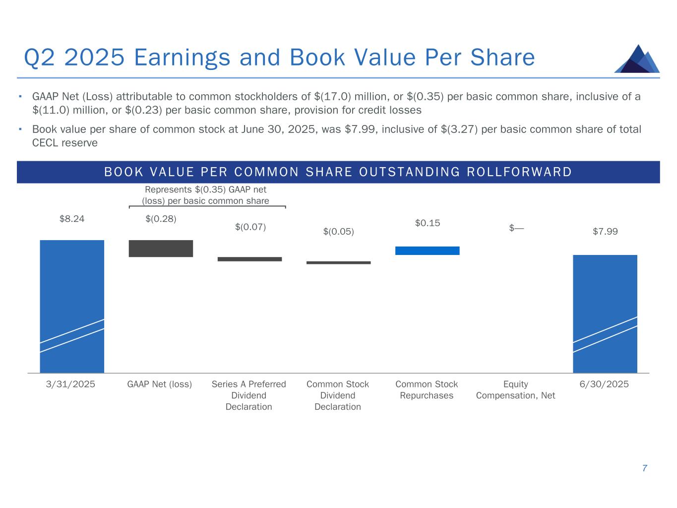 Summary Income Statement ($ in millions, except per share data) (Unaudited) Net Interest Income $8.0 (Provision) for Credit Losses $(11.0) Revenue / (Expenses) from REO Operations, net $(1.5) Operating Expenses $(9.0) Dividends on Preferred Stock $(3.6) GAAP Net (loss) attributable to common stockholders $(17.0) Net (loss) Per Basic Common Share $(0.35) Net (loss) Per Diluted Common Share $(0.35) Common Dividend Per Share $0.05 Series A Preferred Dividend Per Share $0.4375 Basic Wtd. Avg. Common Shares 48,030,130 Diluted Wtd. Avg. Common Shares 48,030,130 Q2 2025 Financial Summary 6 Summary Balance Sheet ($ in millions, except per share data, reflects carrying values) (Unaudited) Cash $85.1 Restricted Cash $10.8 Loans Held-for-Investment, net $1,671.3 Real Estate Owned, net(4) $107.0 Repurchase Facilities $474.4 Securitized (CLO) Debt $743.5 Secured Credit Facility $86.8 Preferred Equity $205.7 Common Equity $378.5 Total Stockholders’ Equity $584.2 Common Shares Outstanding 47,394,519 Book Value Per Common Share $7.99