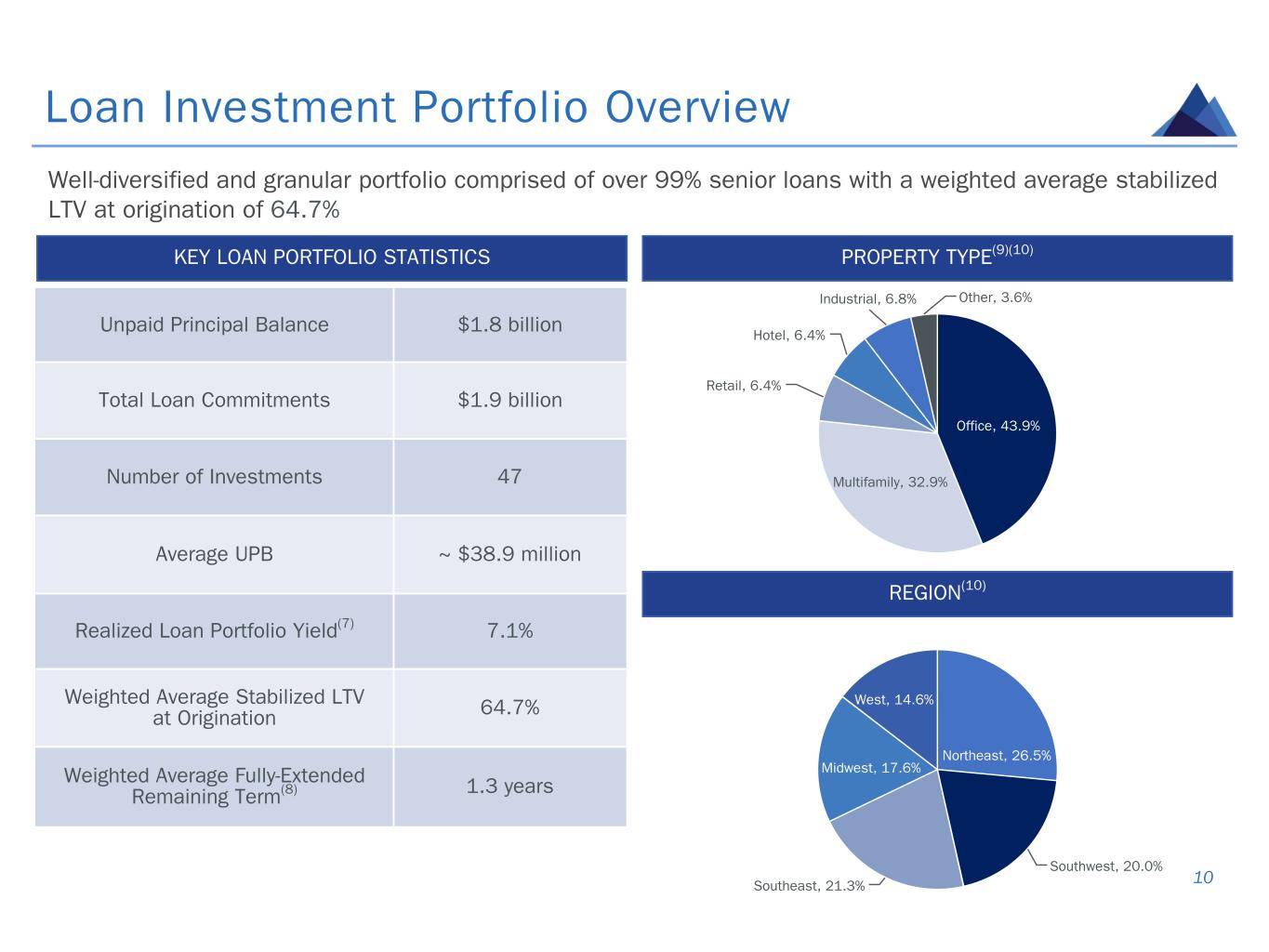 3/31/2025 6/30/2025 Q2 2025 Loan Investment Portfolio Activity ▪ Net loan portfolio activity of $(115.1) million in unpaid principal balance, attributed to two full loan repayments of $(32.1) million and partial repayments of $(2.4) million, two loan resolutions of $(94.1) million, offset by increases of $13.5 million from existing loan commitments and upsizes ▪ Two resolutions of $(94.1) million, including one discounted loan payoff and one loan modification with a subsequent subordinate note write-off 9 UNPAID PR INCIPAL BALANCE ROLLFORWARD (6) ($ in mi l l i ons ) Unpaid Principal Balance $1,945.0 50 loans Repayments $(34.4) Resolutions $(94.1) Fundings $13.5 Unpaid Principal Balance $1,829.9 47 loans Unfunded Commitments $92.7 Unfunded Commitments $78.3